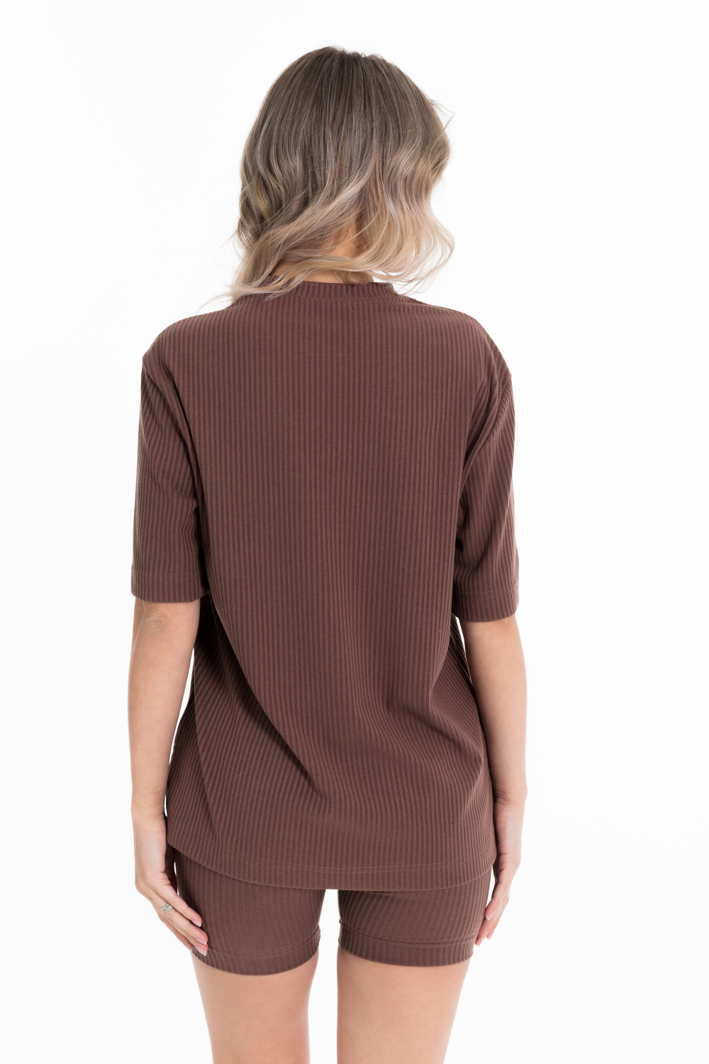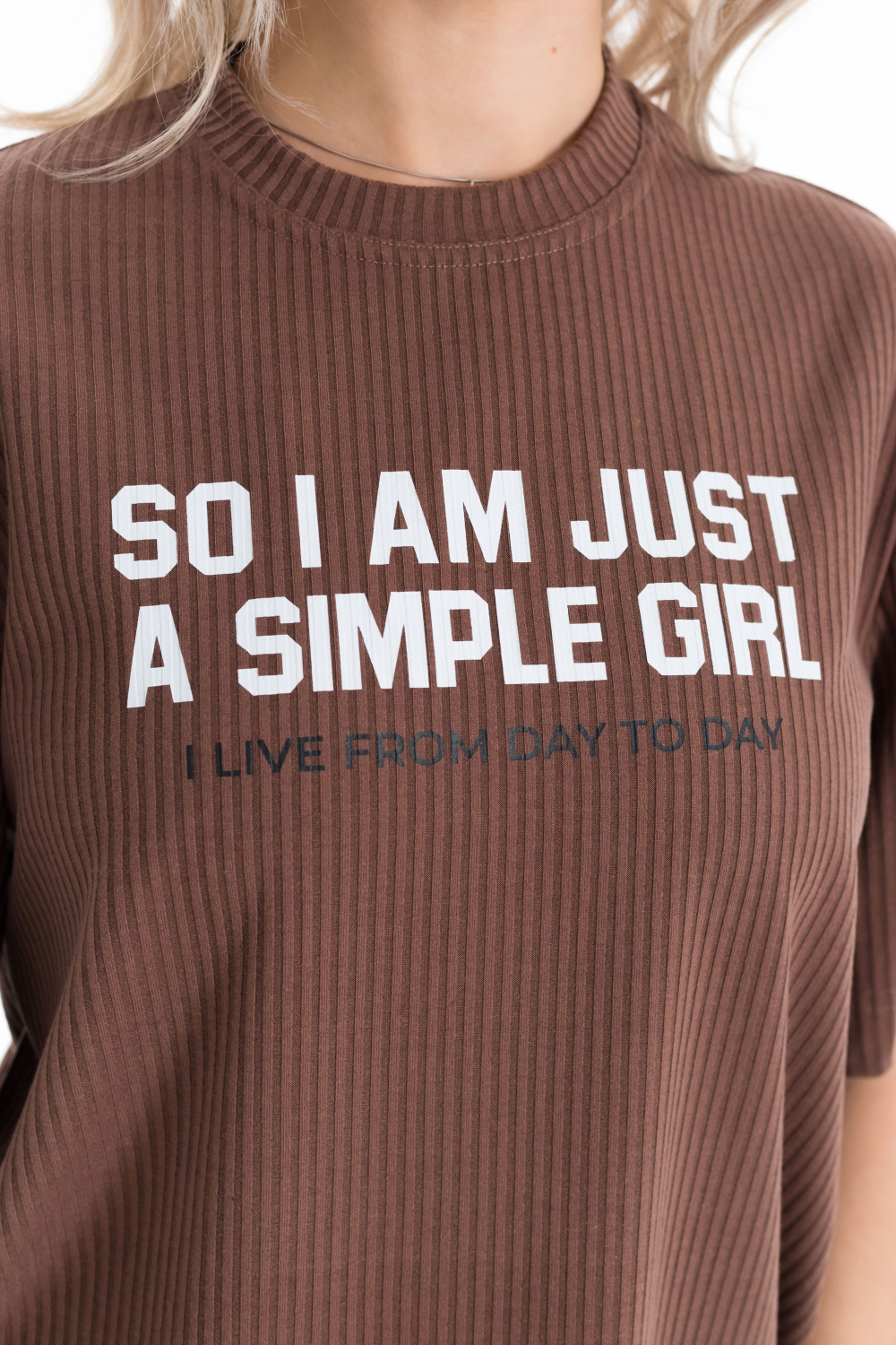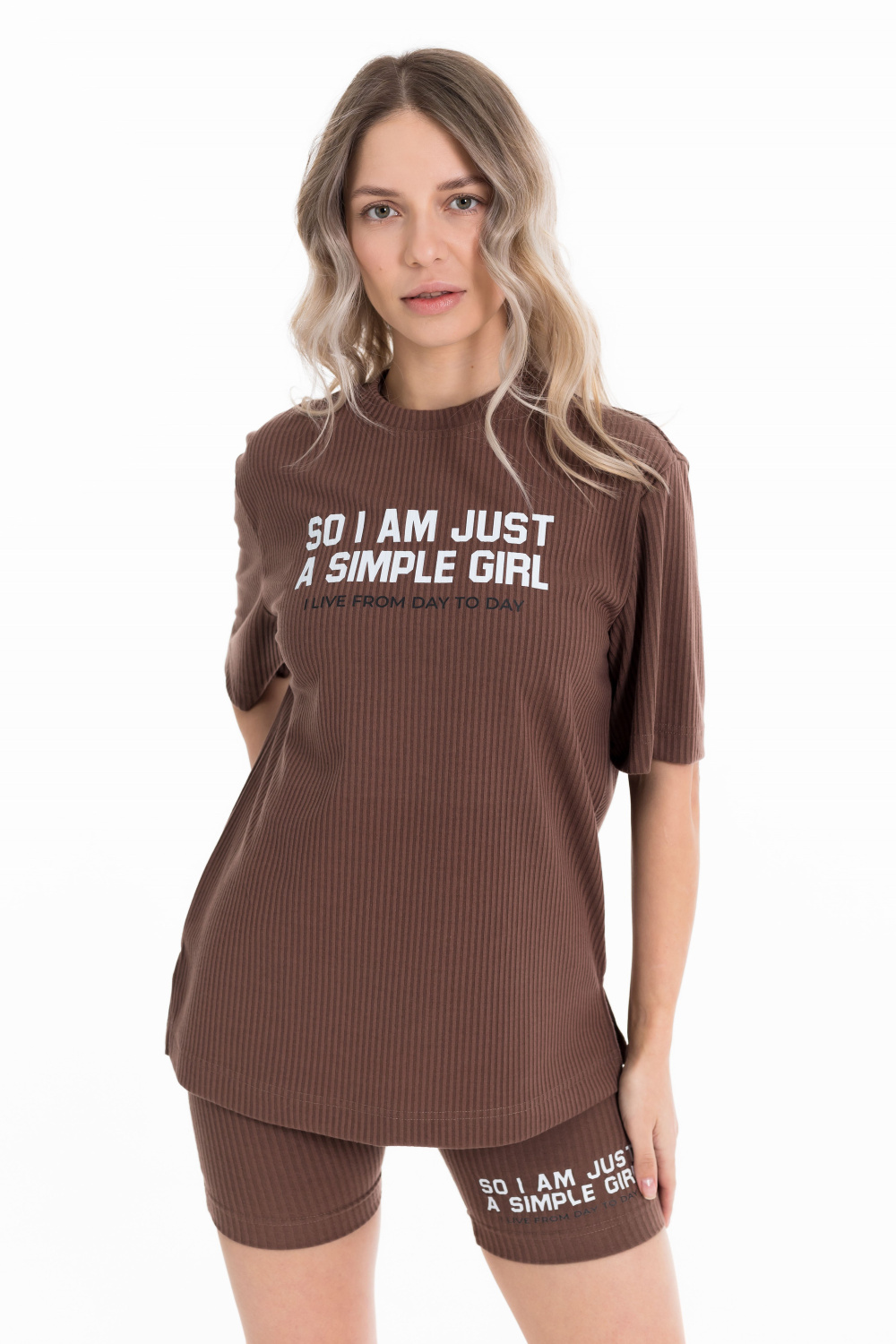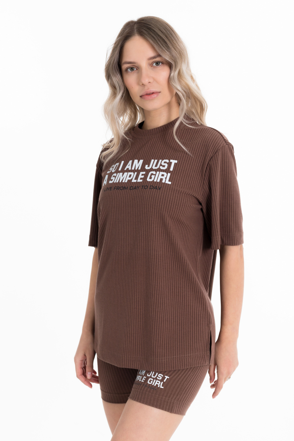 Костюм выполнен из синтетического полотна в рубчик (лапша). Футболка с коротким рукавом и круглым вырезом горловины, в боковых швах декоративные разрезы. Велосипедки короткие, с поясом на резине. Футболка и шорты дополнены оригинальным принтом.