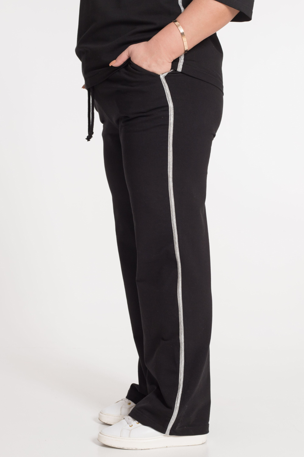 Брюки - боковые карманы, притачной пояс со шнуром, по бокам серебряные лампасы.