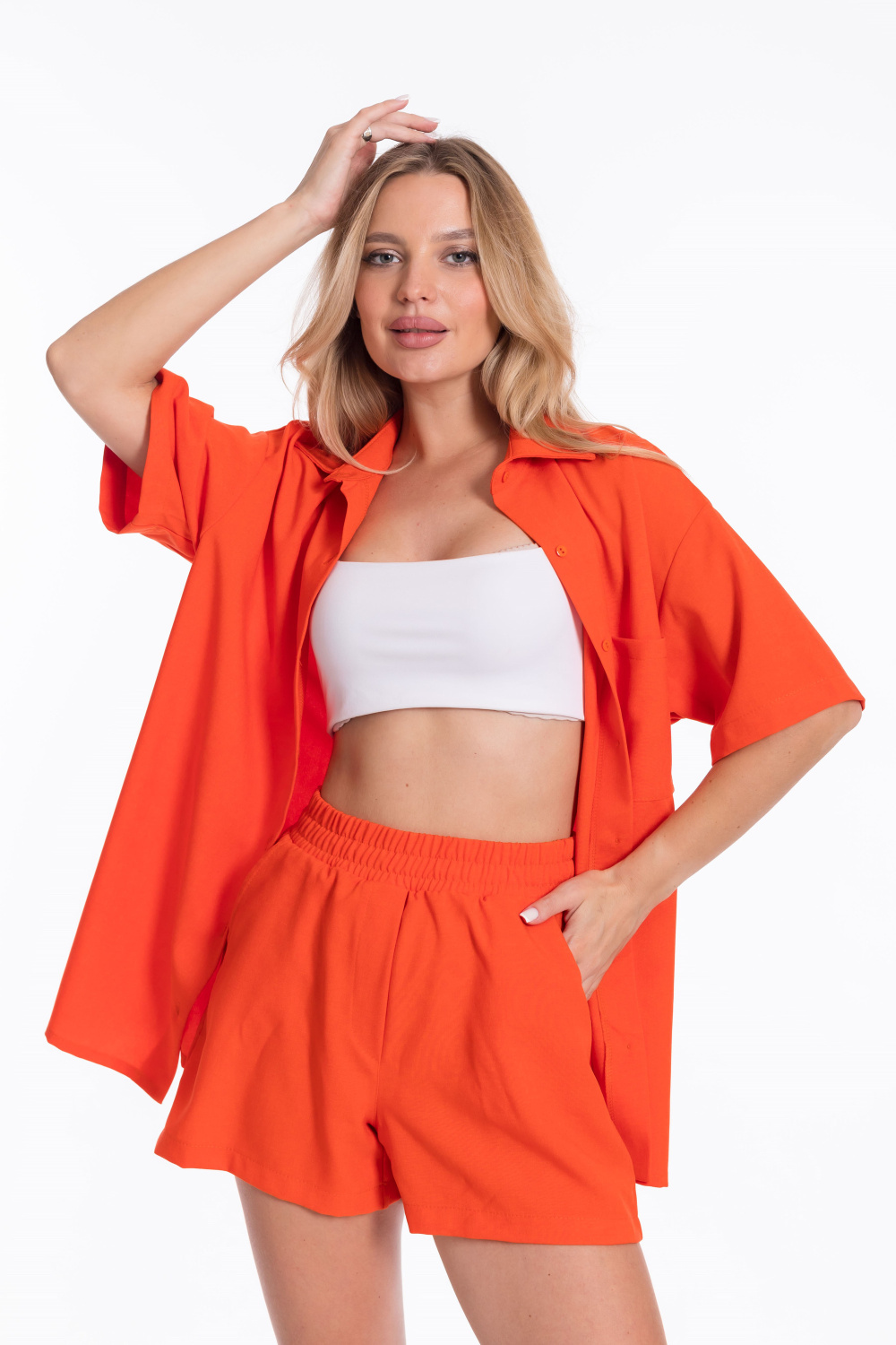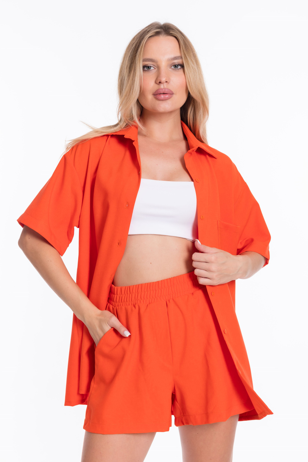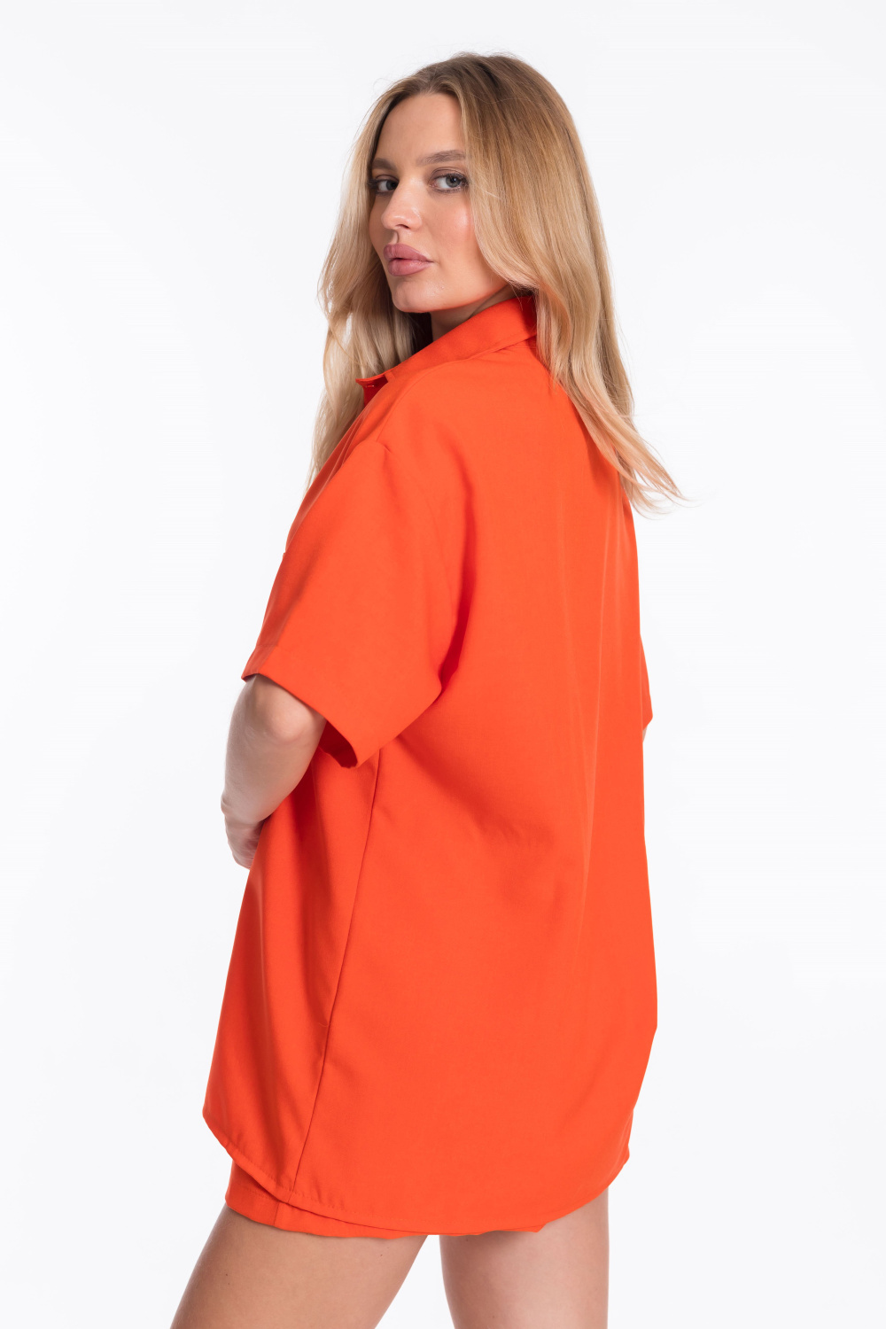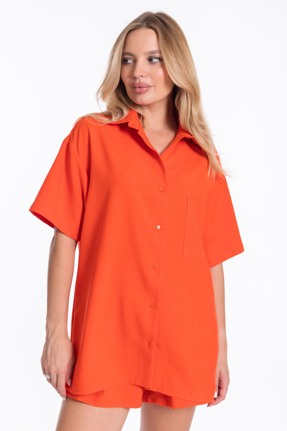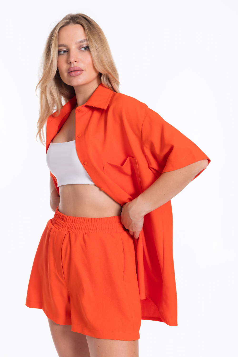 Однотонный оранжевый цвет костюма добавит яркости в ваш образ.