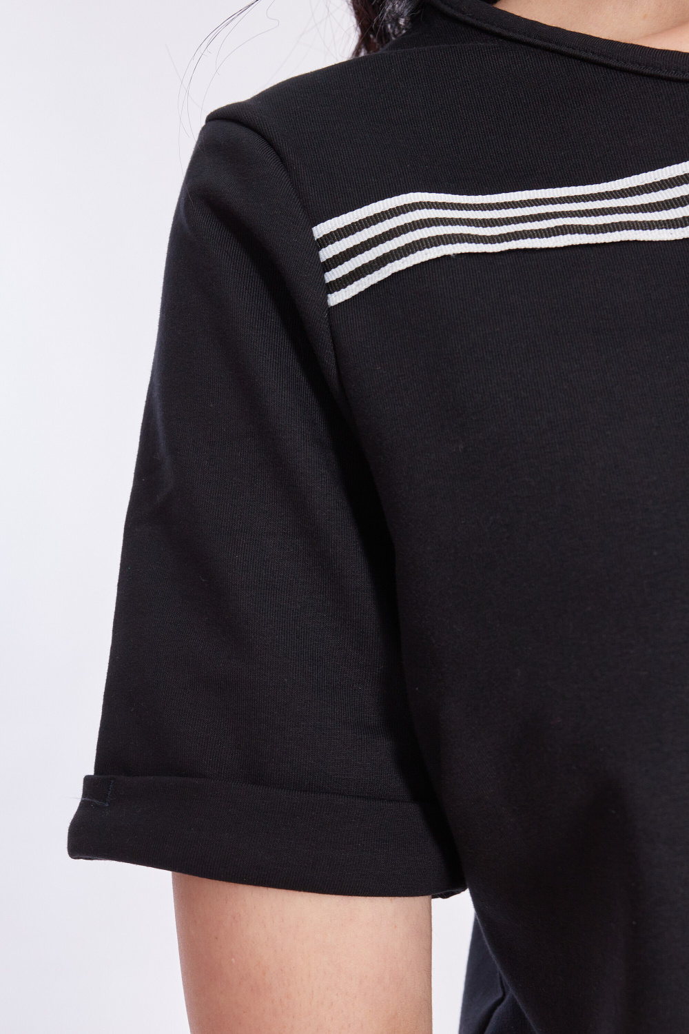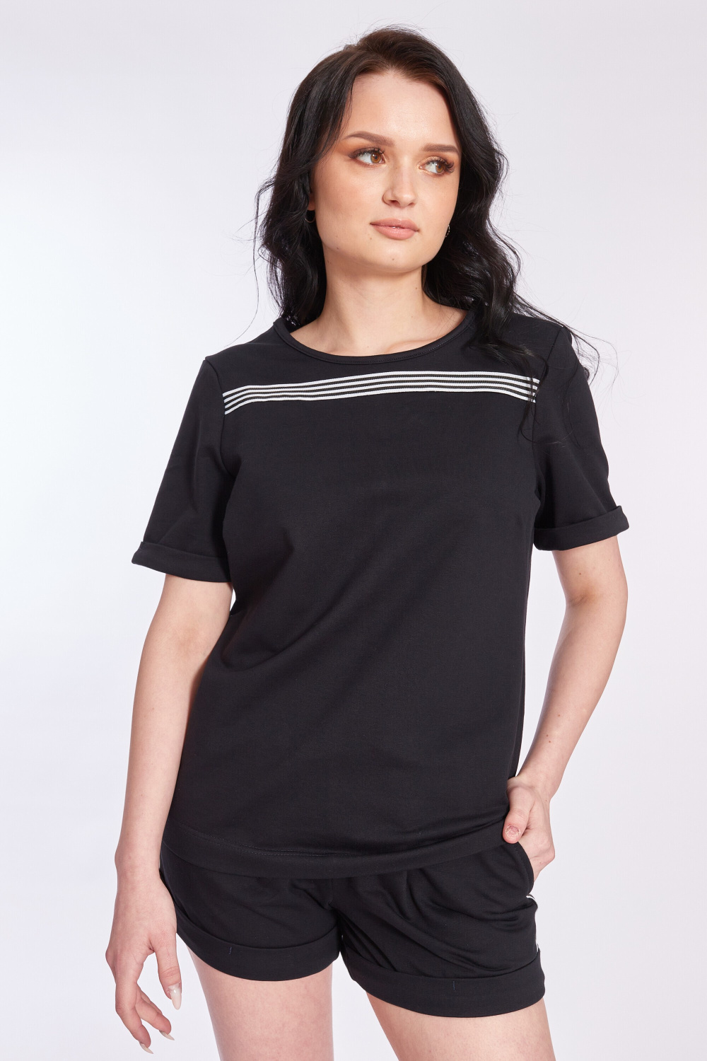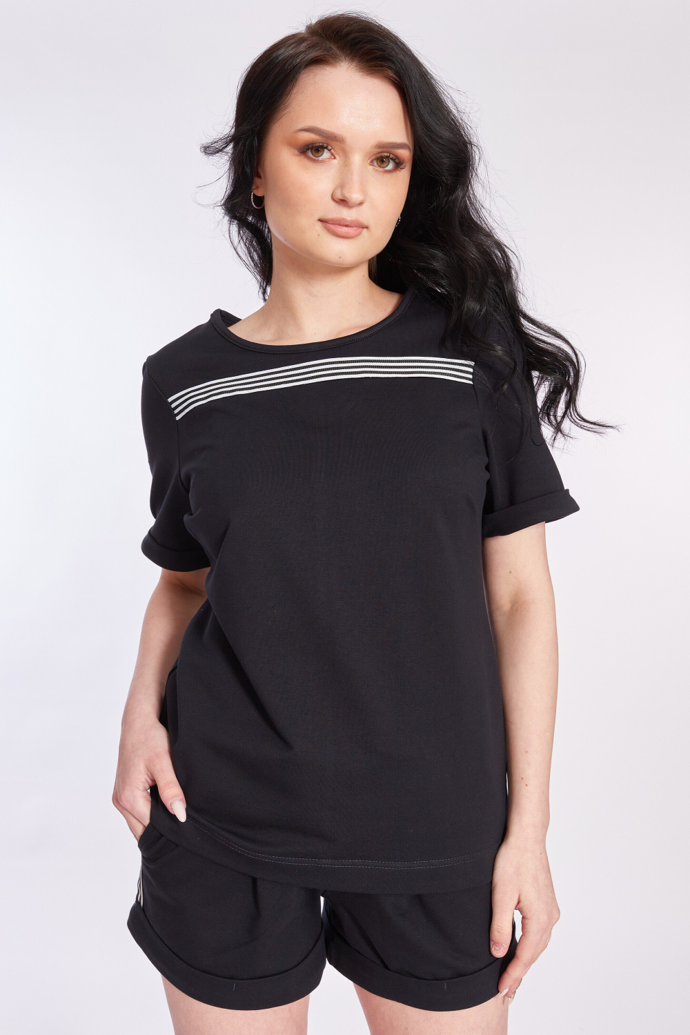 Костюм из футер петли с лайкрой. Футболка с коротким втачным рукавом. Горловина обработана бейкой, низы рукавов обработаны планками-отворотами. На футболке и шортах в качестве декора нашита тесьма. Шорты короткие, с отворотами снизу. По бокам расположены карманы. Пояс с эластичной резиной и шнуром.