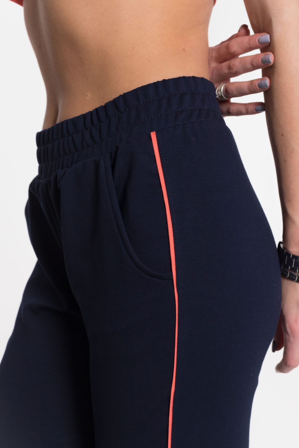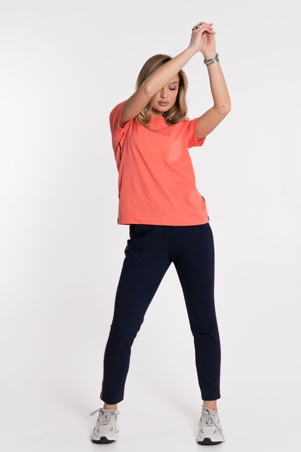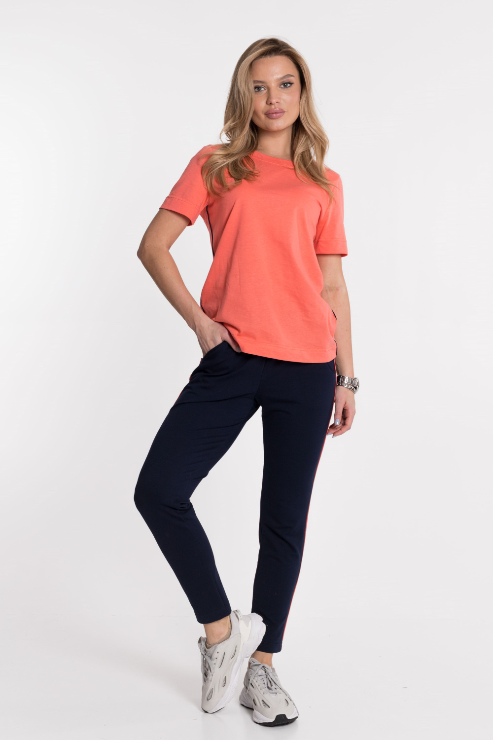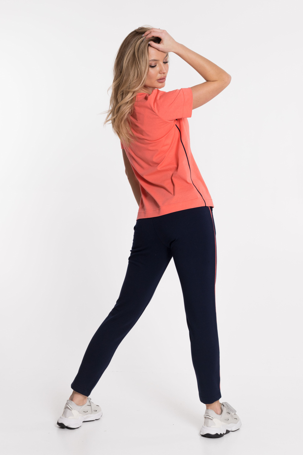 Костюм женский. Брюки из однотонного футера-петли с лайкрой с кантом в боковых швах в цвет футболки, боковые карманы, притачной пояс.