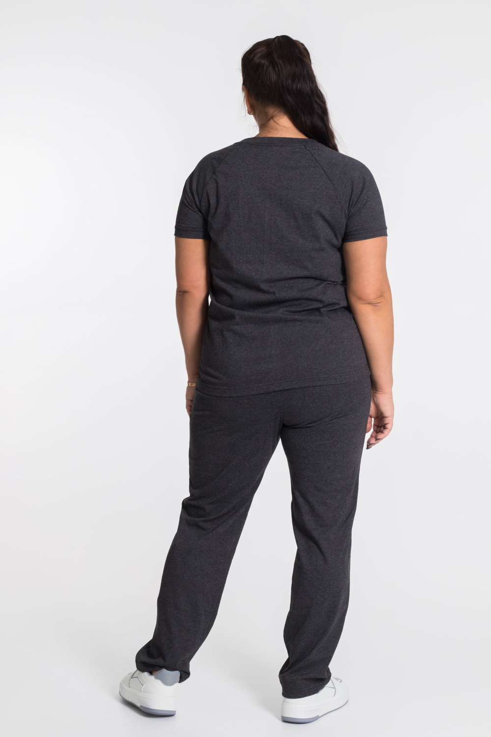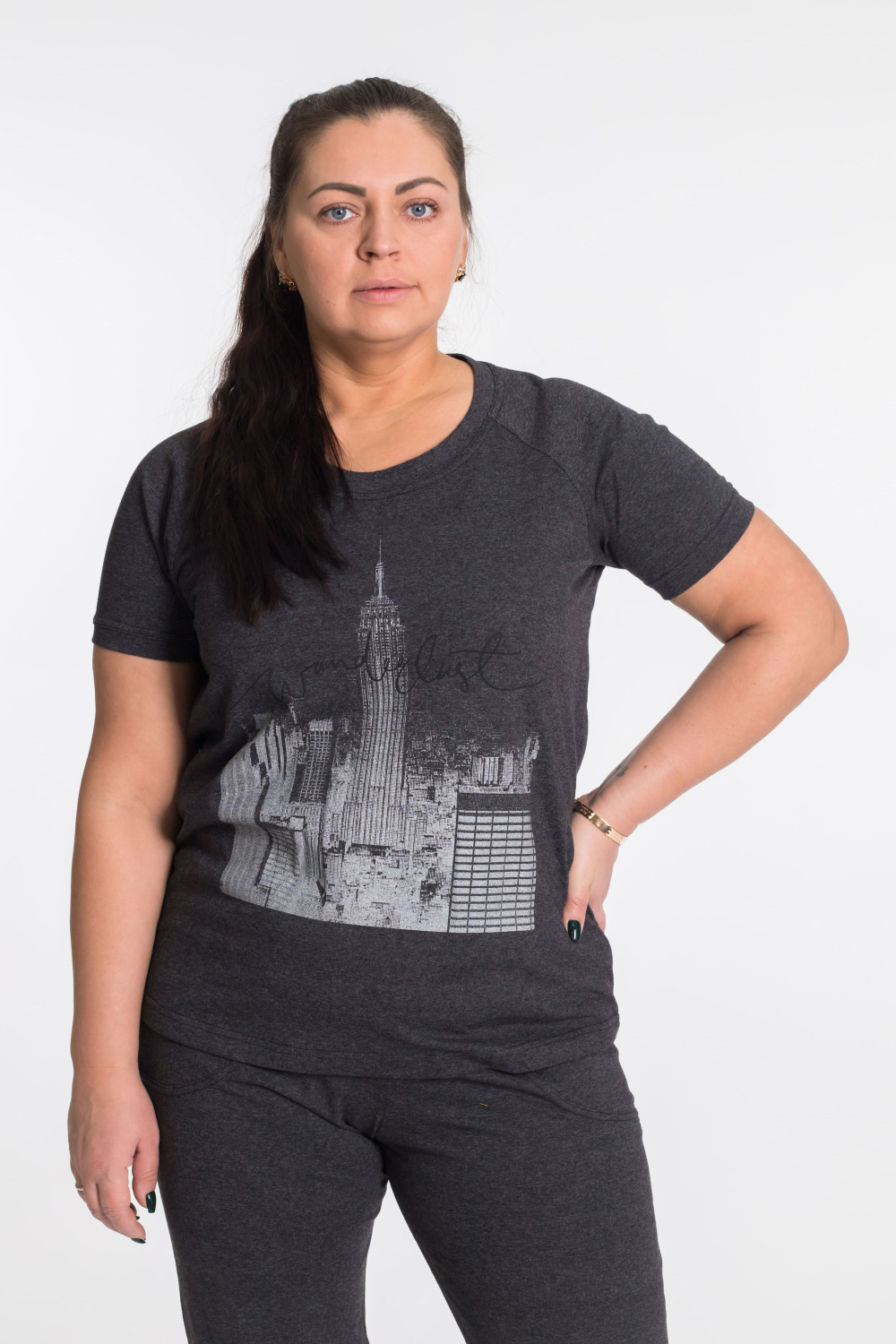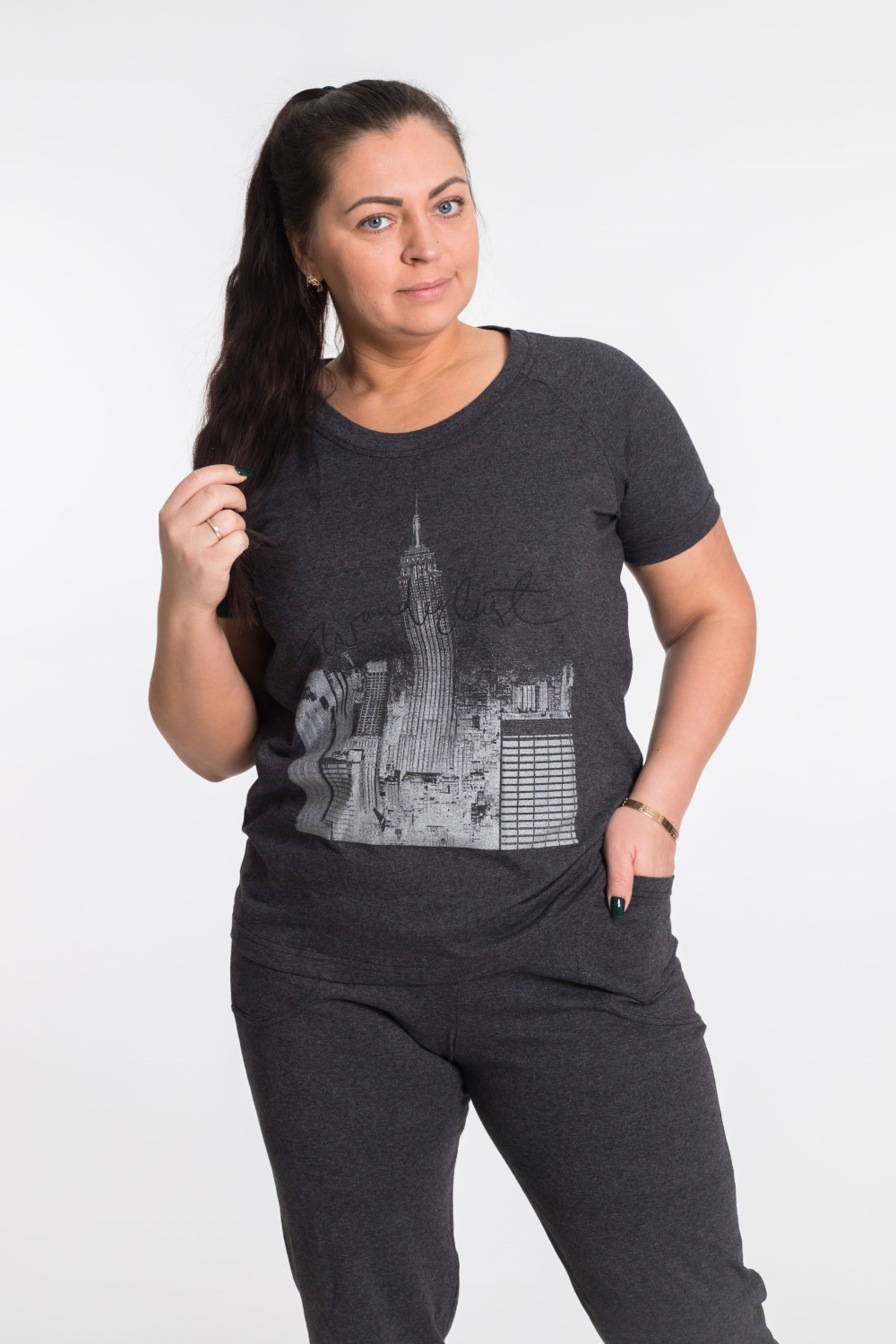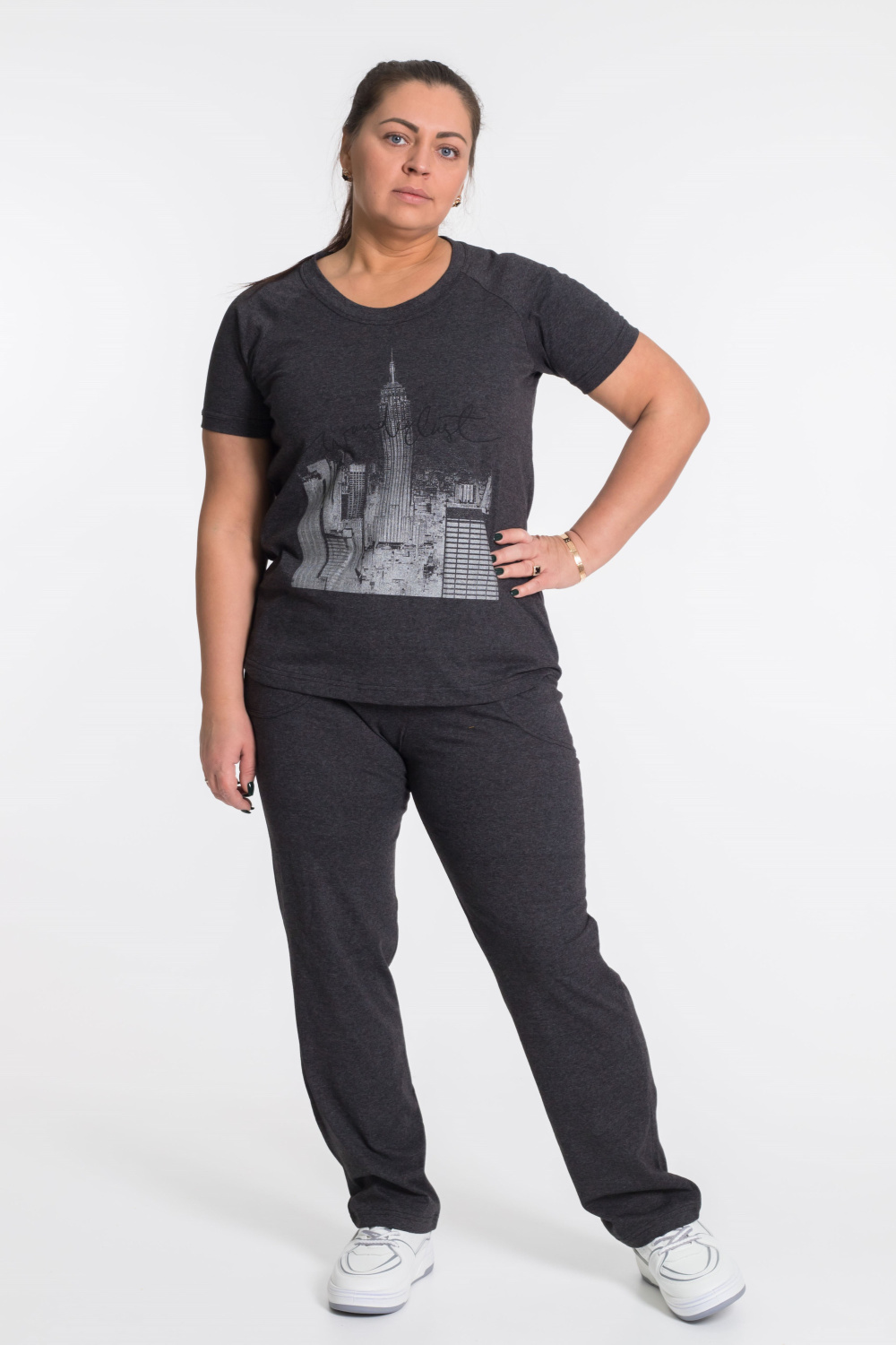 Костюм женский выполнен из кулирки, 100% хлопок. Футболка с круглым вырезом горловины и короткими рукавами покроя реглан. Спереди нанесён оригинальный принт. Брюки с поясом на резинке и накладными карманами.