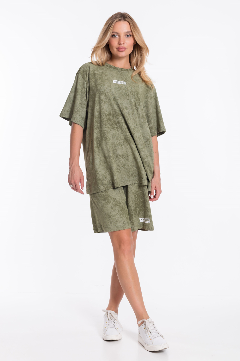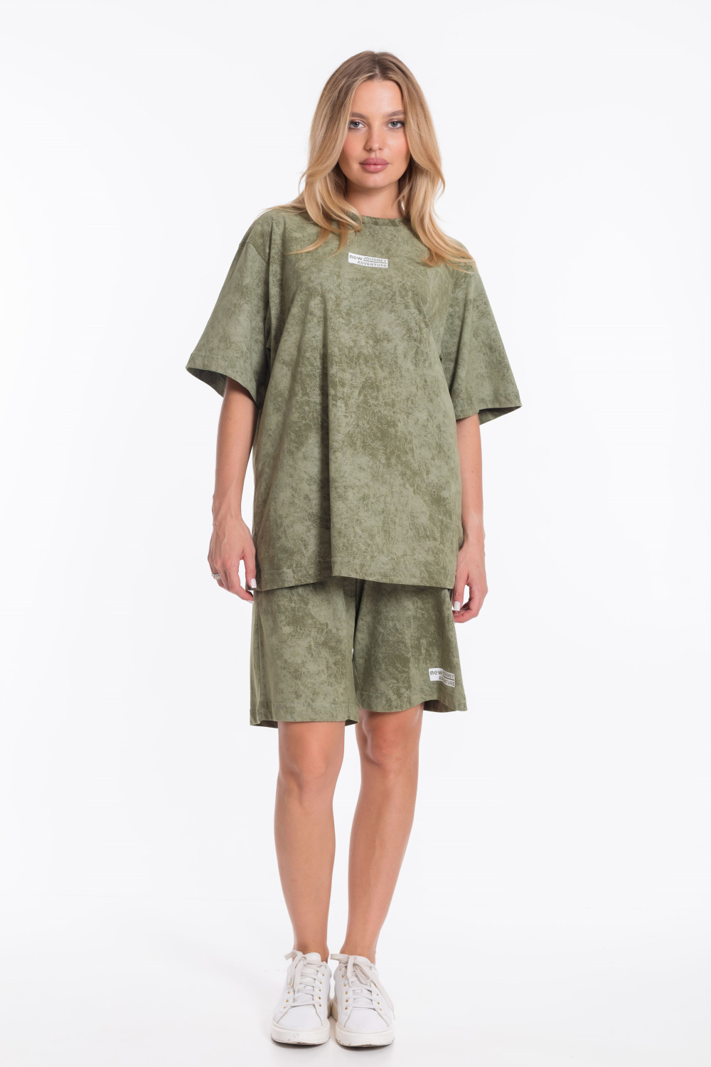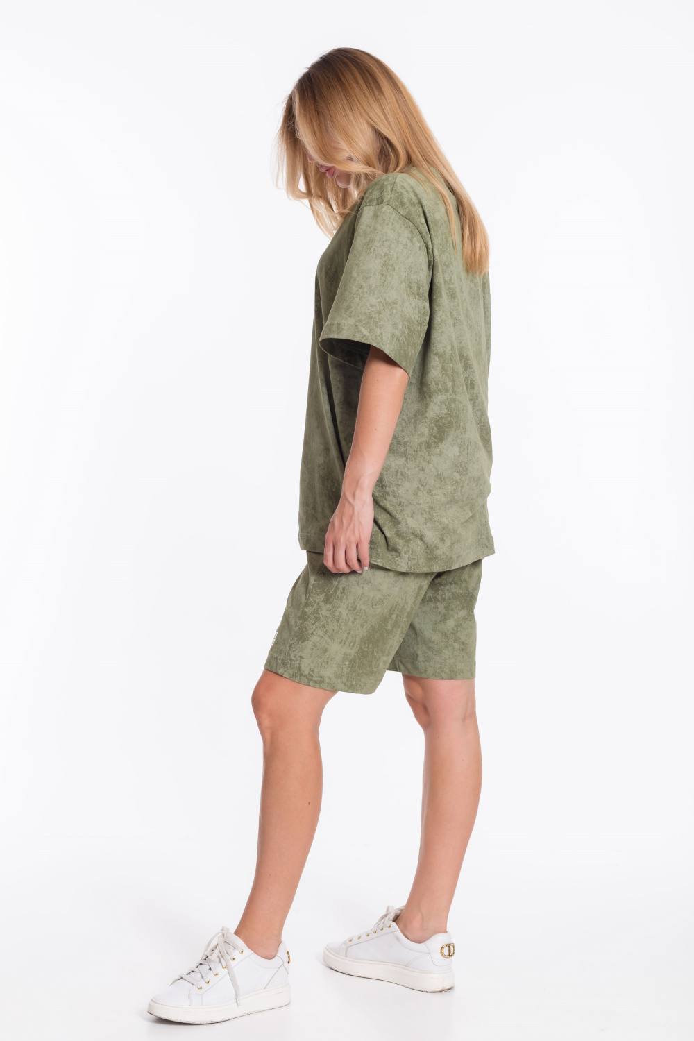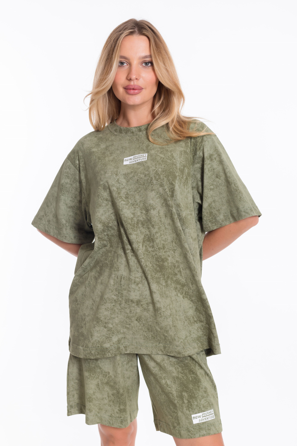 Женский костюм - футболка и шорты свободного кроя из однотонного хлопкового полотна цвета хаки. Футболка с короткими рукавами и спущенной линией плеча имеет круглый вырез горловины и украшена принтом спереди. Длина шорт до середины бедра, пояс выполнен из широкой резинки, а по бокам есть карманы. Штанина шорт украшена принтом, который соответствует принту на футболке. Такой наряд подойдёт для повседневной носки, прогулок или неформальных встреч. Костюм обеспечит комфорт и свободу движений благодаря свободному крою и натуральным материалам.