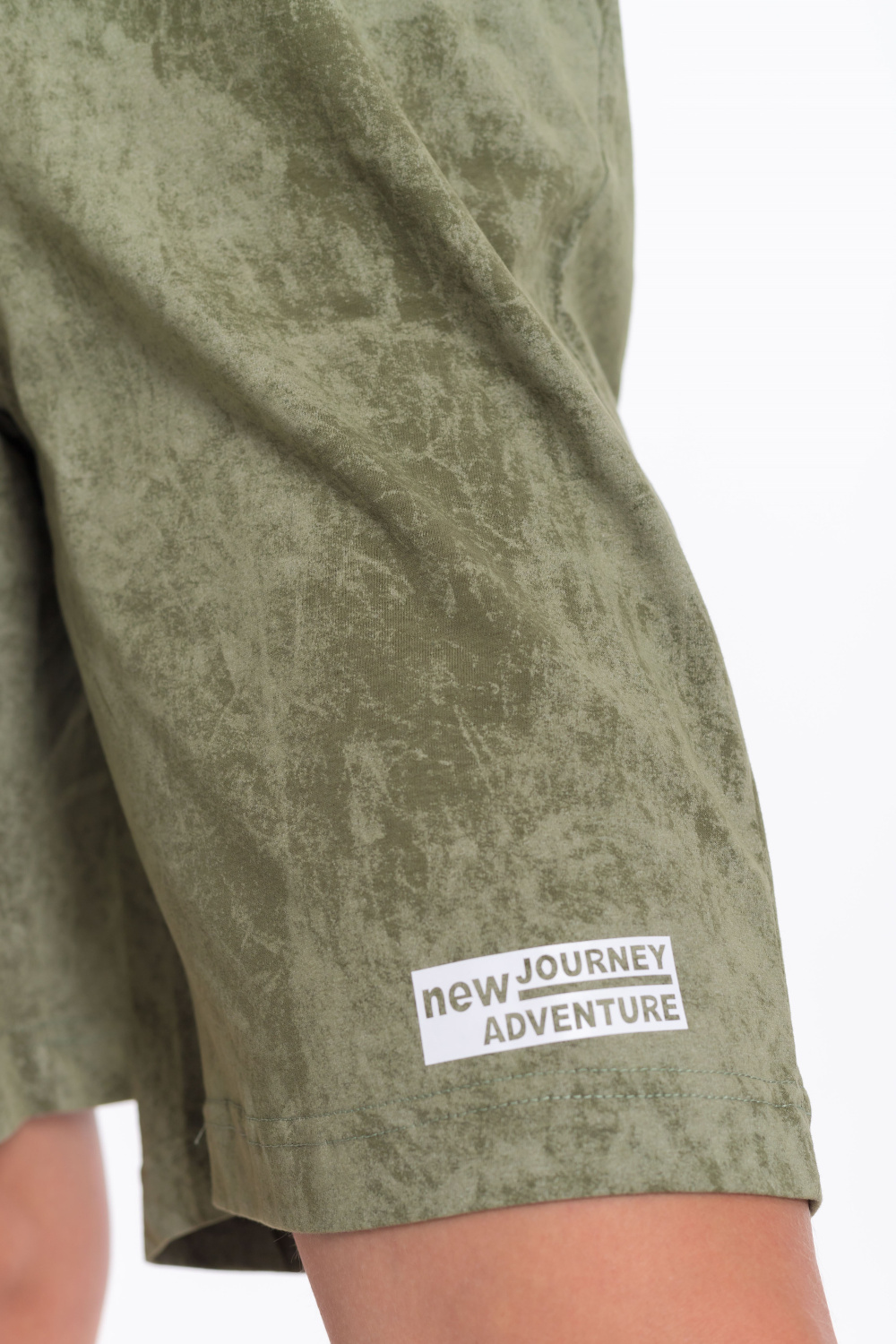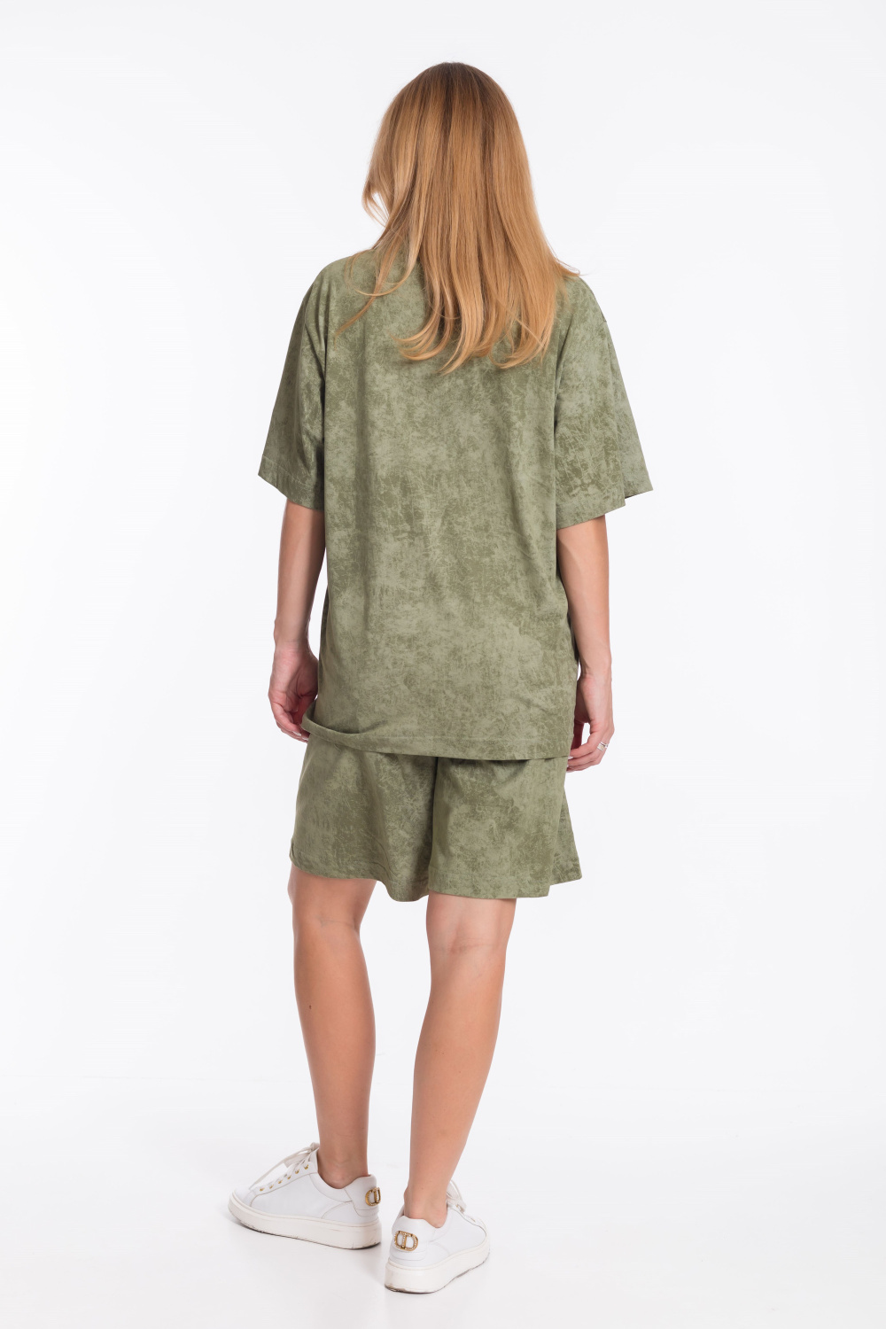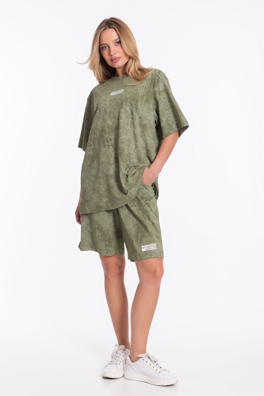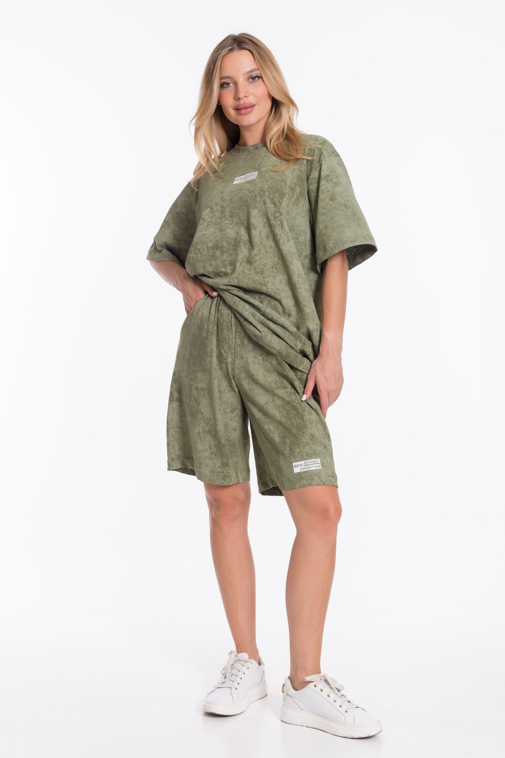 Женский костюм - футболка и шорты свободного кроя из однотонного хлопкового полотна цвета хаки. Футболка с короткими рукавами и спущенной линией плеча имеет круглый вырез горловины и украшена принтом спереди. Длина шорт до середины бедра, пояс выполнен из широкой резинки, а по бокам есть карманы. Штанина шорт украшена принтом, который соответствует принту на футболке. Такой наряд подойдёт для повседневной носки, прогулок или неформальных встреч. Костюм обеспечит комфорт и свободу движений благодаря свободному крою и натуральным материалам.