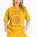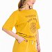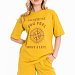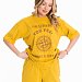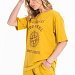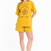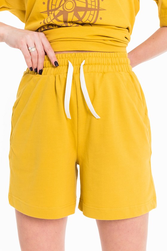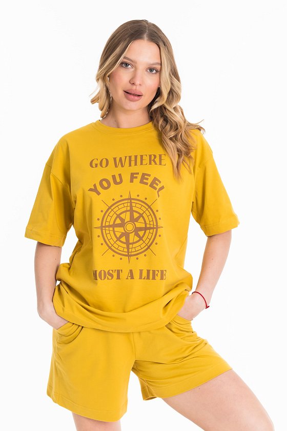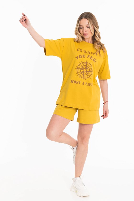 Костюм женский, выполнен из хлопового полотна, состоит из футболки и шорт. Футболка из кулирки, свободного силуэта с коротким рукавом и круглым вырезом горловины. Футболка спереди дополнена оригинальным принтом. Шорты из футера с лайкрой, с поясом на резине шнуре, карманами по бокам.