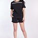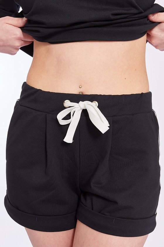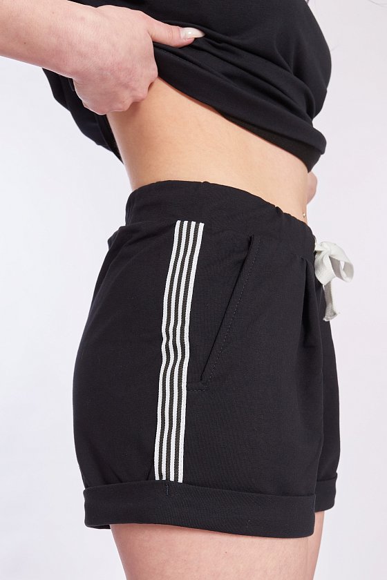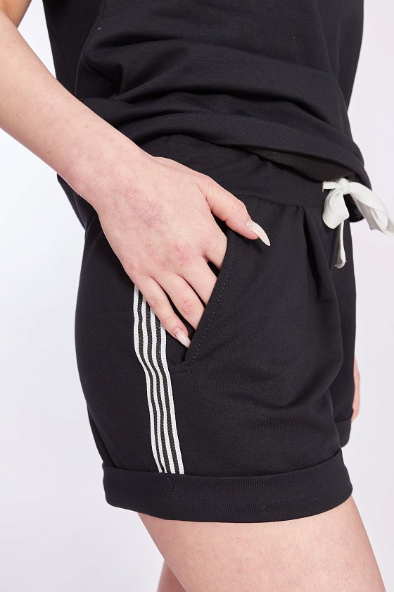 Костюм из футер петли с лайкрой. Футболка с коротким втачным рукавом. Горловина обработана бейкой, низы рукавов обработаны планками-отворотами. На футболке и шортах в качестве декора нашита тесьма. Шорты короткие, с отворотами снизу. По бокам расположены карманы. Пояс с эластичной резиной и шнуром.
