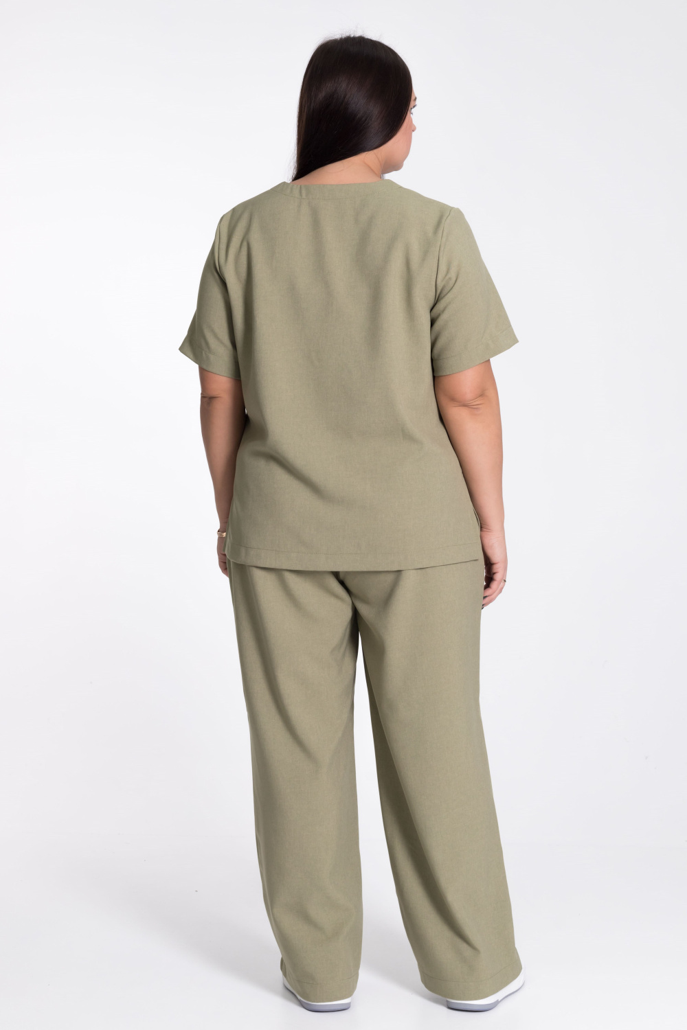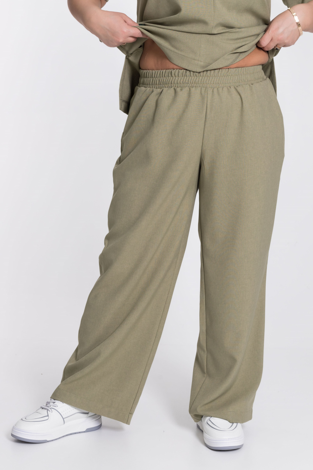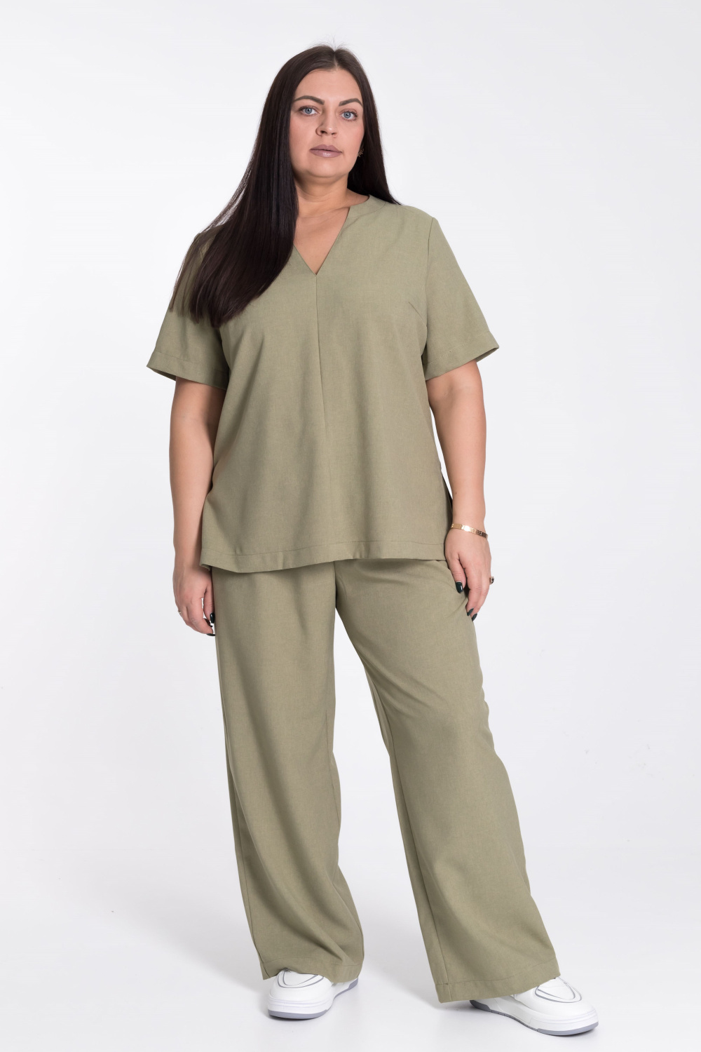 Женский костюм — отличный выбор для повседневной носки. Он выполнен из практичного и лёгкого однотонного полотна цвета хаки, имитирующего лён.
