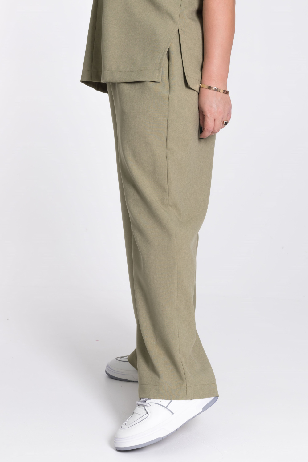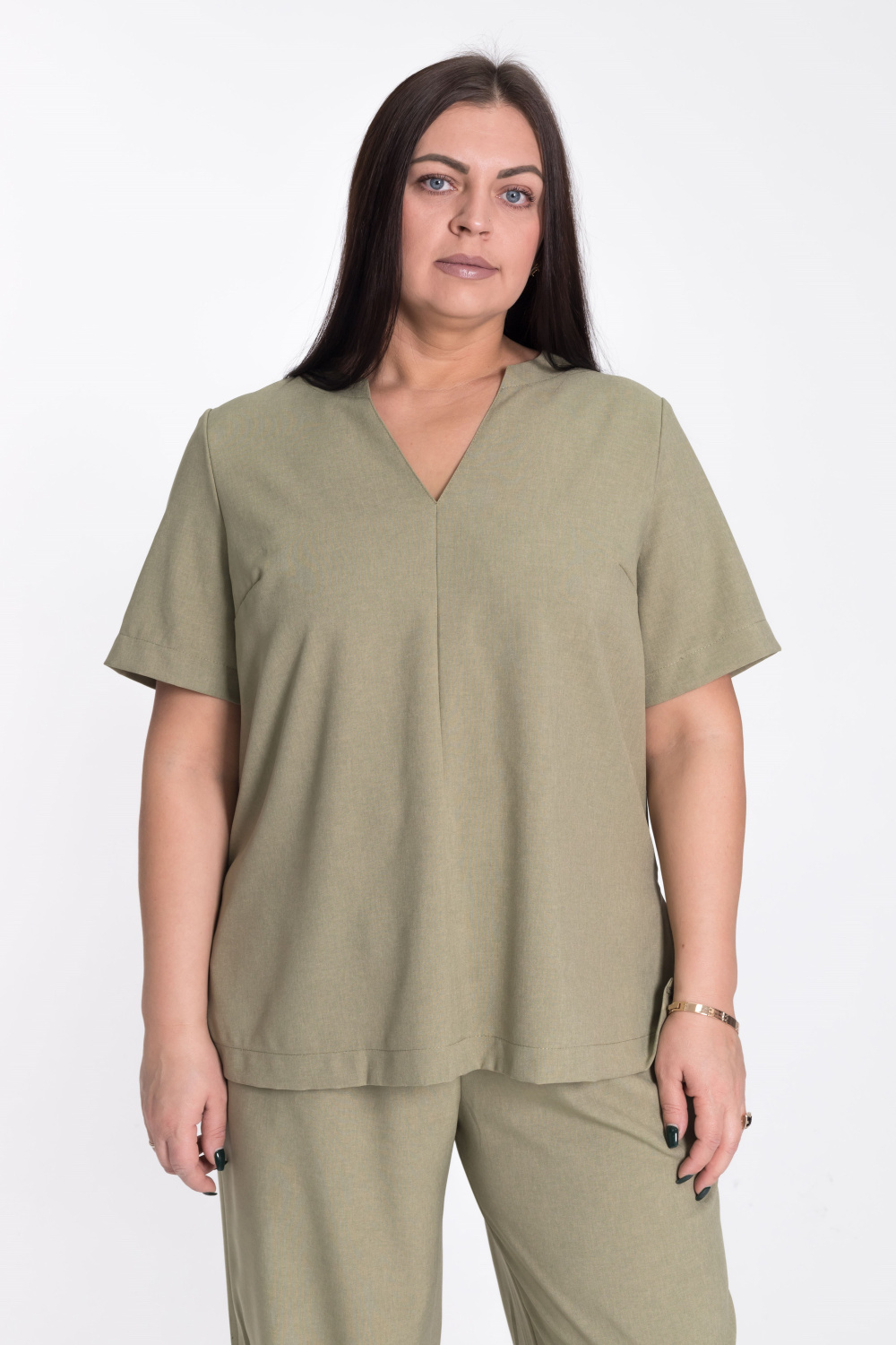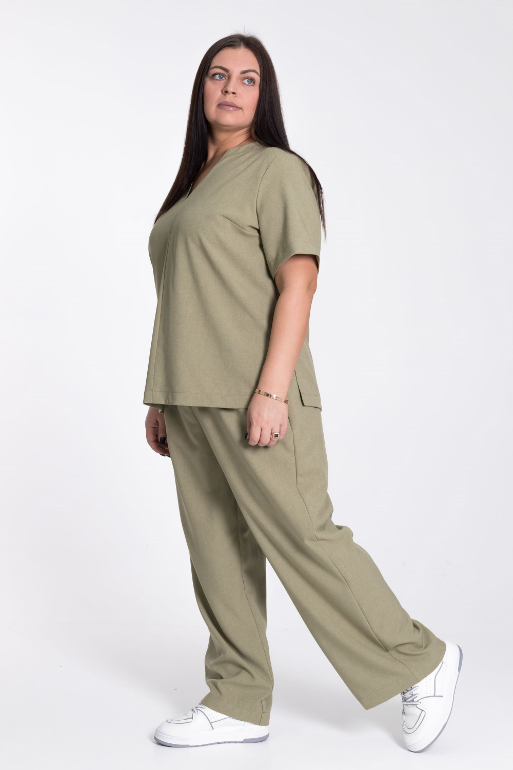 Женский костюм — отличный выбор для повседневной носки. Он выполнен из практичного и лёгкого однотонного полотна цвета хаки, имитирующего лён.