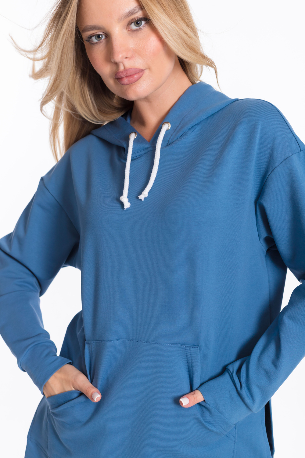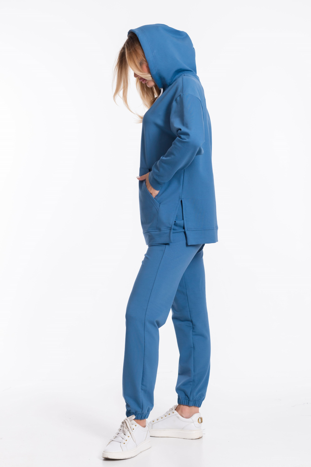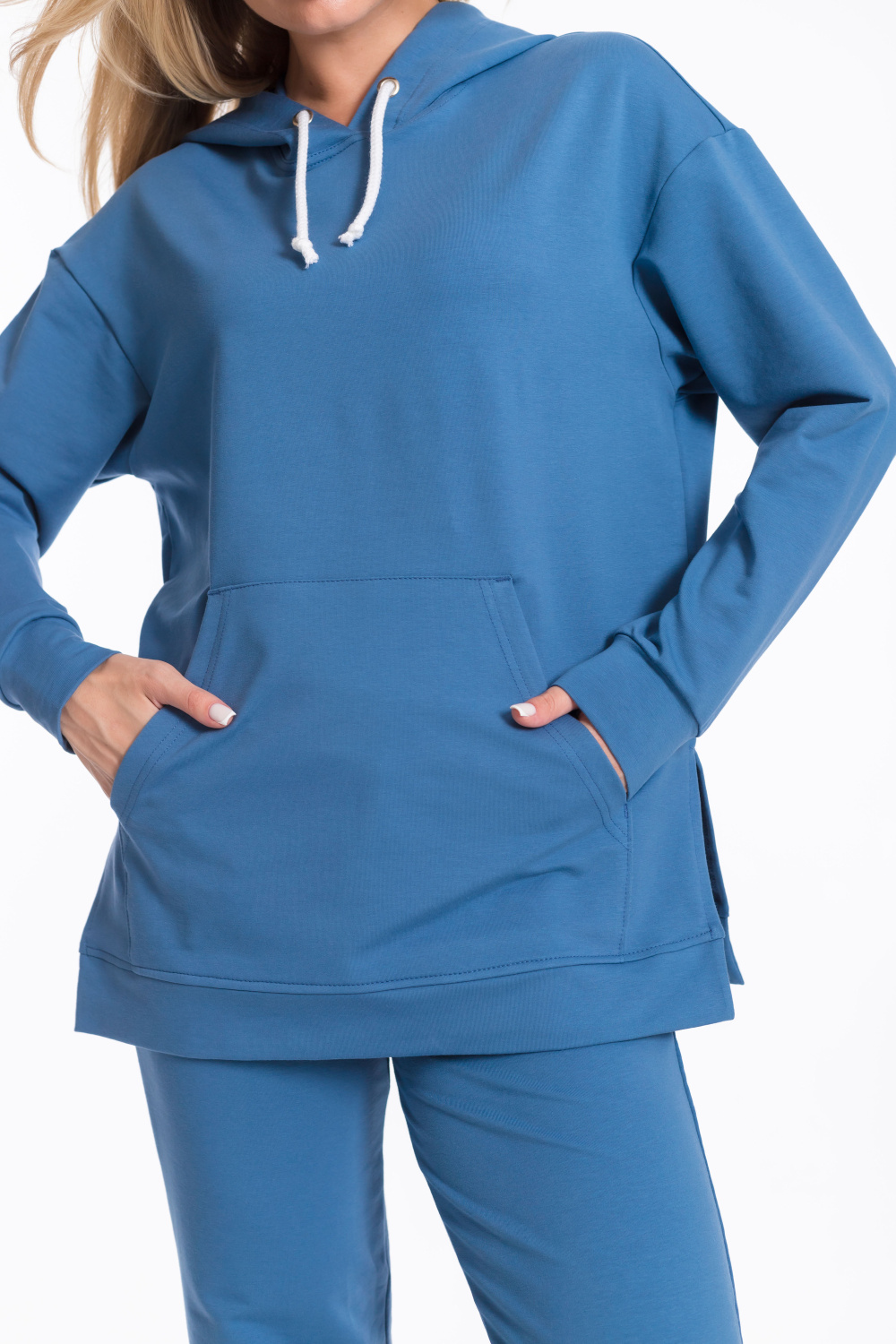 Толстовка имеет удлинённый крой со спущенной линией плеча, что придаёт модели стильный и комфортный вид. Наличие капюшона со шнуром и кармана кенгуру делают её удобной и функциональной. Разрезы по бокам придают изделию оригинальность.