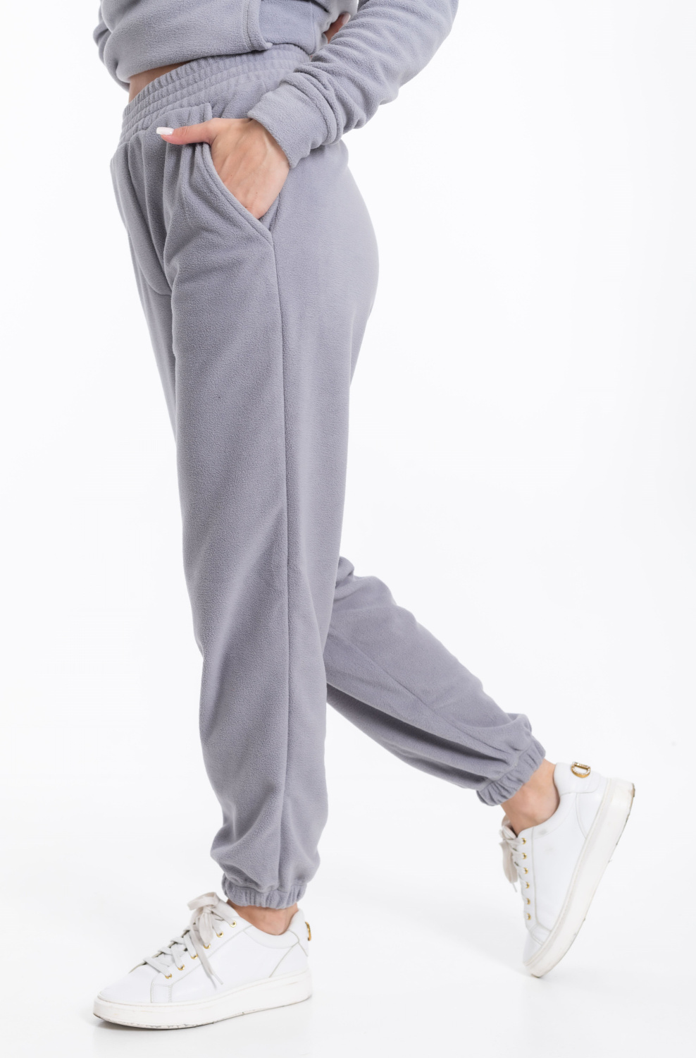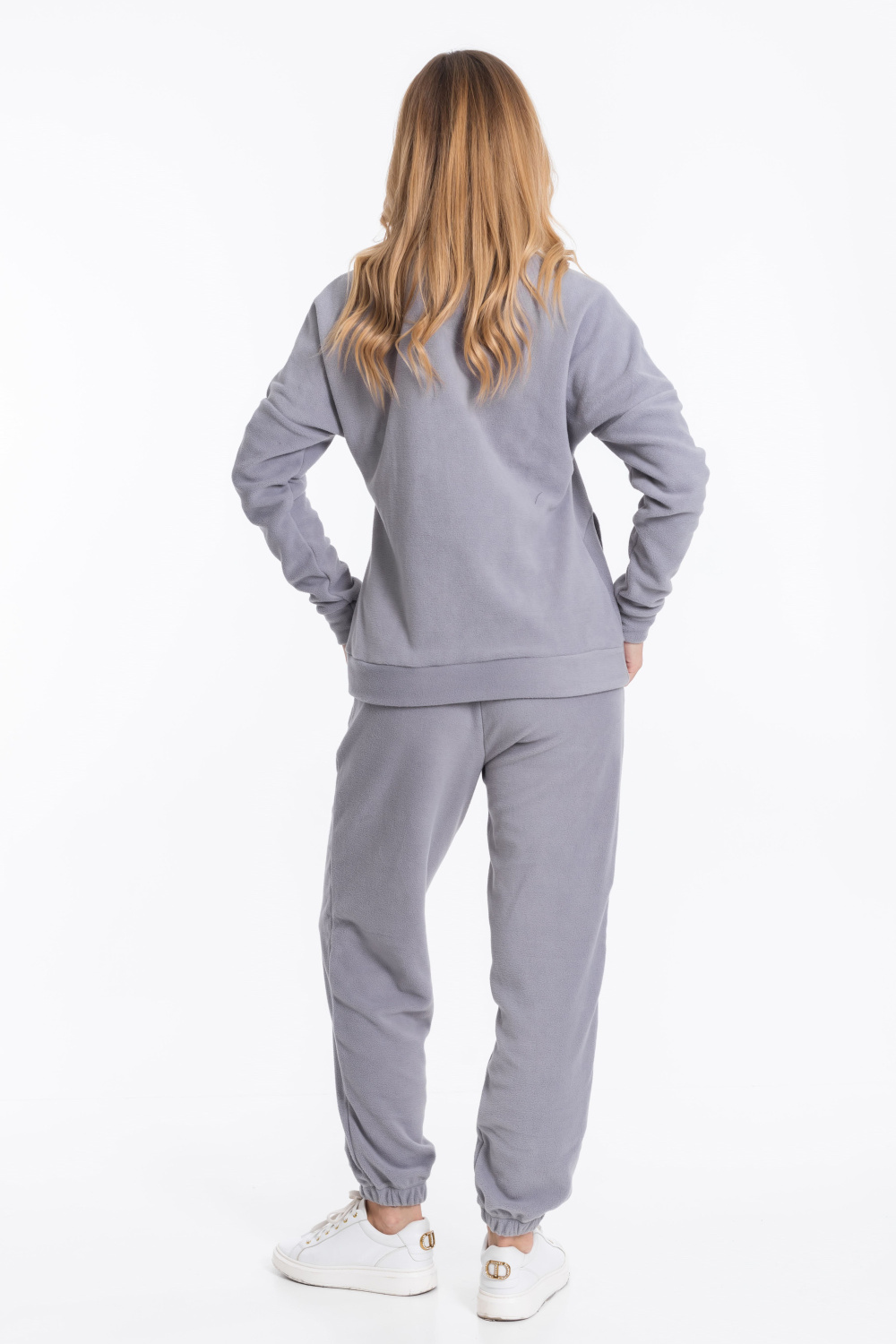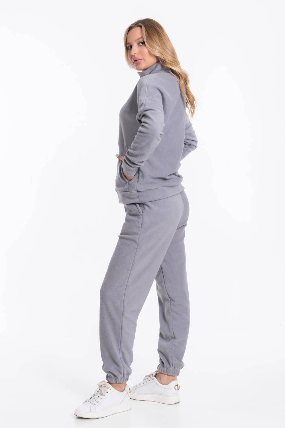 Женский серый флисовый костюм из брюк и толстовки — отличный выбор для повседневной носки. Воротник-стойка с застёжкой на молнию, спущенные рукава и манжеты на рукавах обеспечивают комфорт. Вышивка спереди и карман-кенгуру придаёт изделию оригинальность. Крой брюк свободный. Широкий пояс на резинке и низ штанин на резинке сохраняют тепло. Боковые карманы на брюках практичны, а имитация ширинки добавляет изюминку.