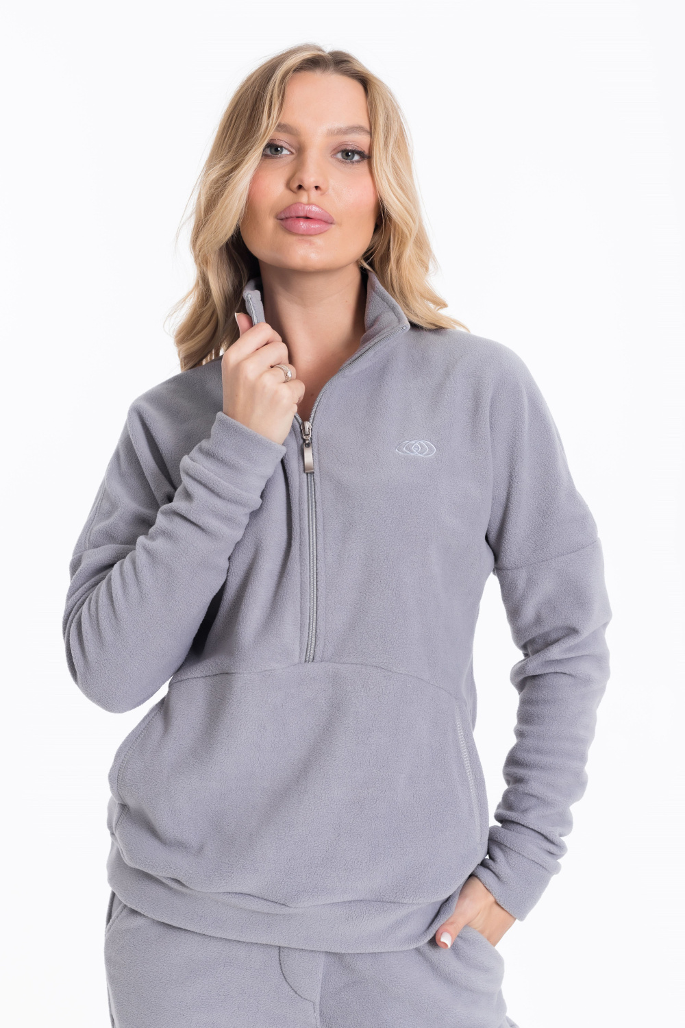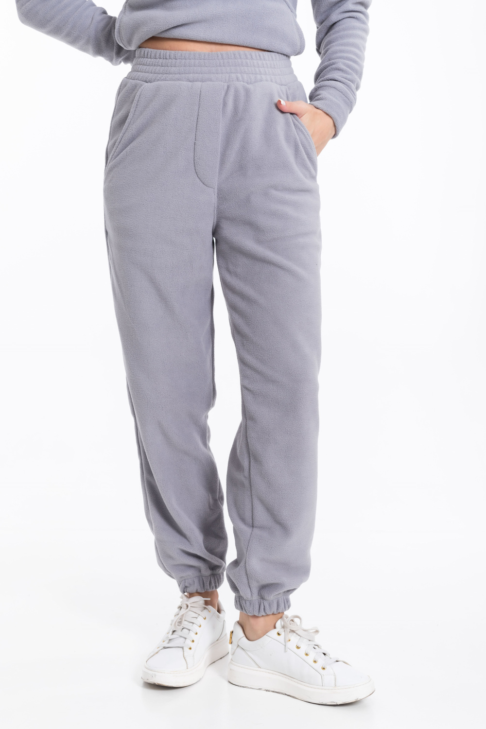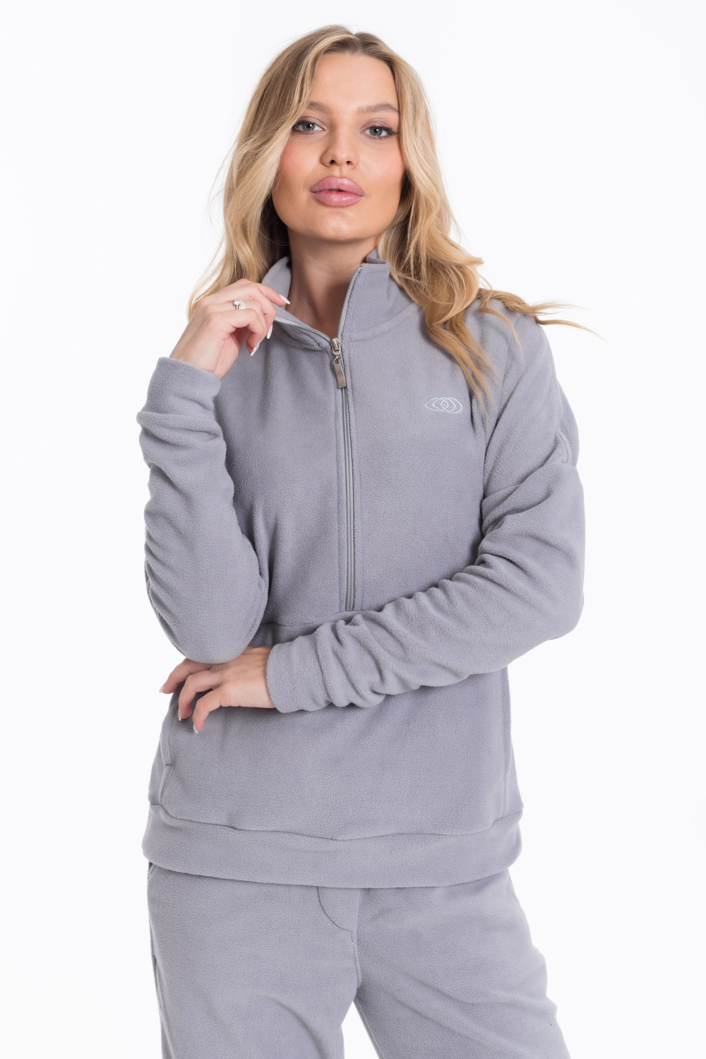 Женский серый флисовый костюм из брюк и толстовки — отличный выбор для повседневной носки. Воротник-стойка с застёжкой на молнию, спущенные рукава и манжеты на рукавах обеспечивают комфорт. Вышивка спереди и карман-кенгуру придаёт изделию оригинальность. Крой брюк свободный. Широкий пояс на резинке и низ штанин на резинке сохраняют тепло. Боковые карманы на брюках практичны, а имитация ширинки добавляет изюминку.