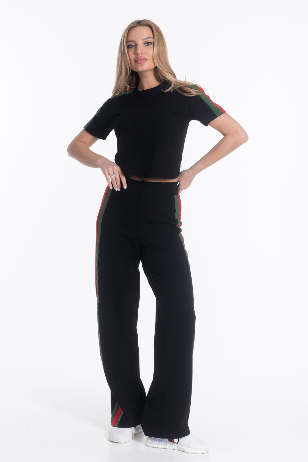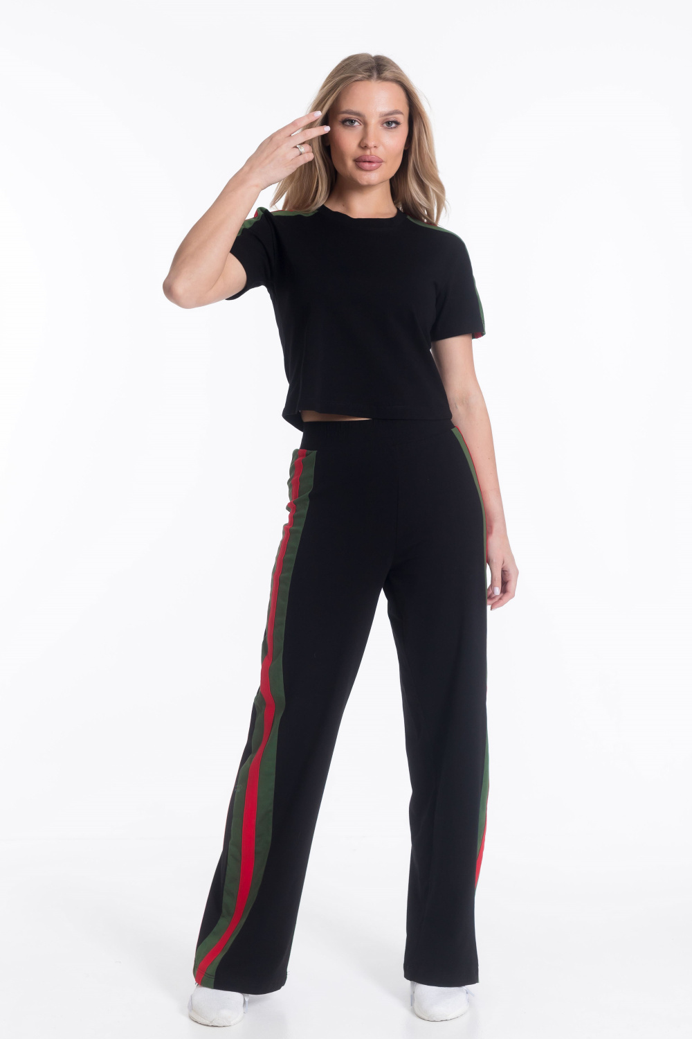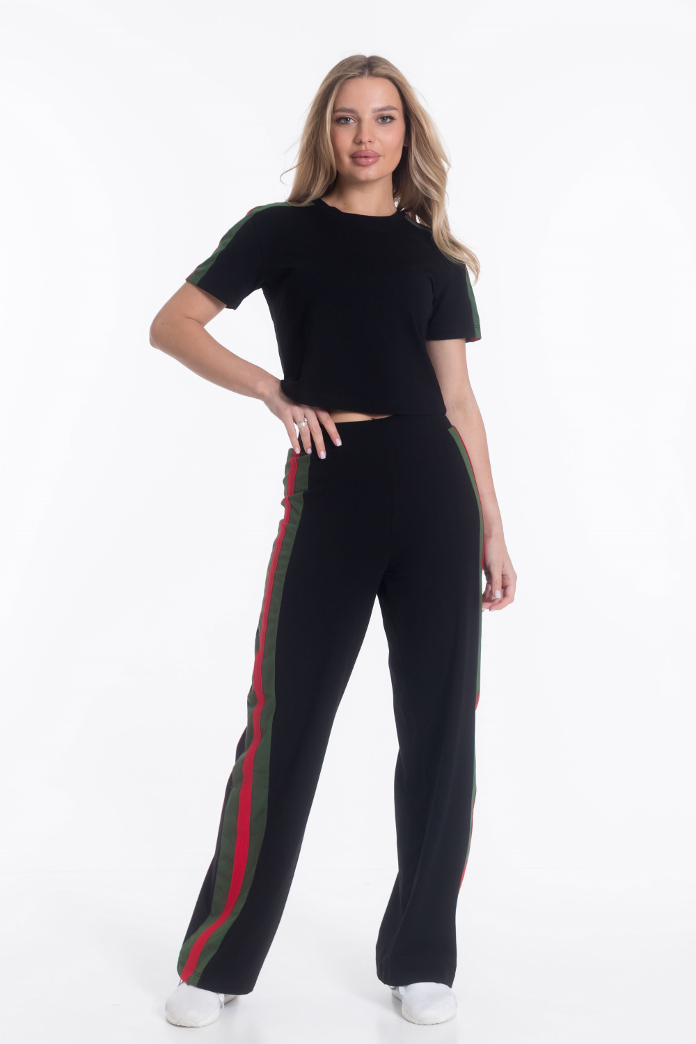 Женский костюм из х/б полотна с добавлением лайкры — отличный выбор для повседневной носки. Укороченная футболка с круглым вырезом горловины обеспечивает свободу движений, а свободные брюки с поясом на резинке и боковыми карманами гарантируют комфорт. Лампасы контрастного цвета на рукавах и брюках добавляют изюминку в дизайн костюма. Такой наряд подойдёт для прогулок, неформальных встреч или отдыха.