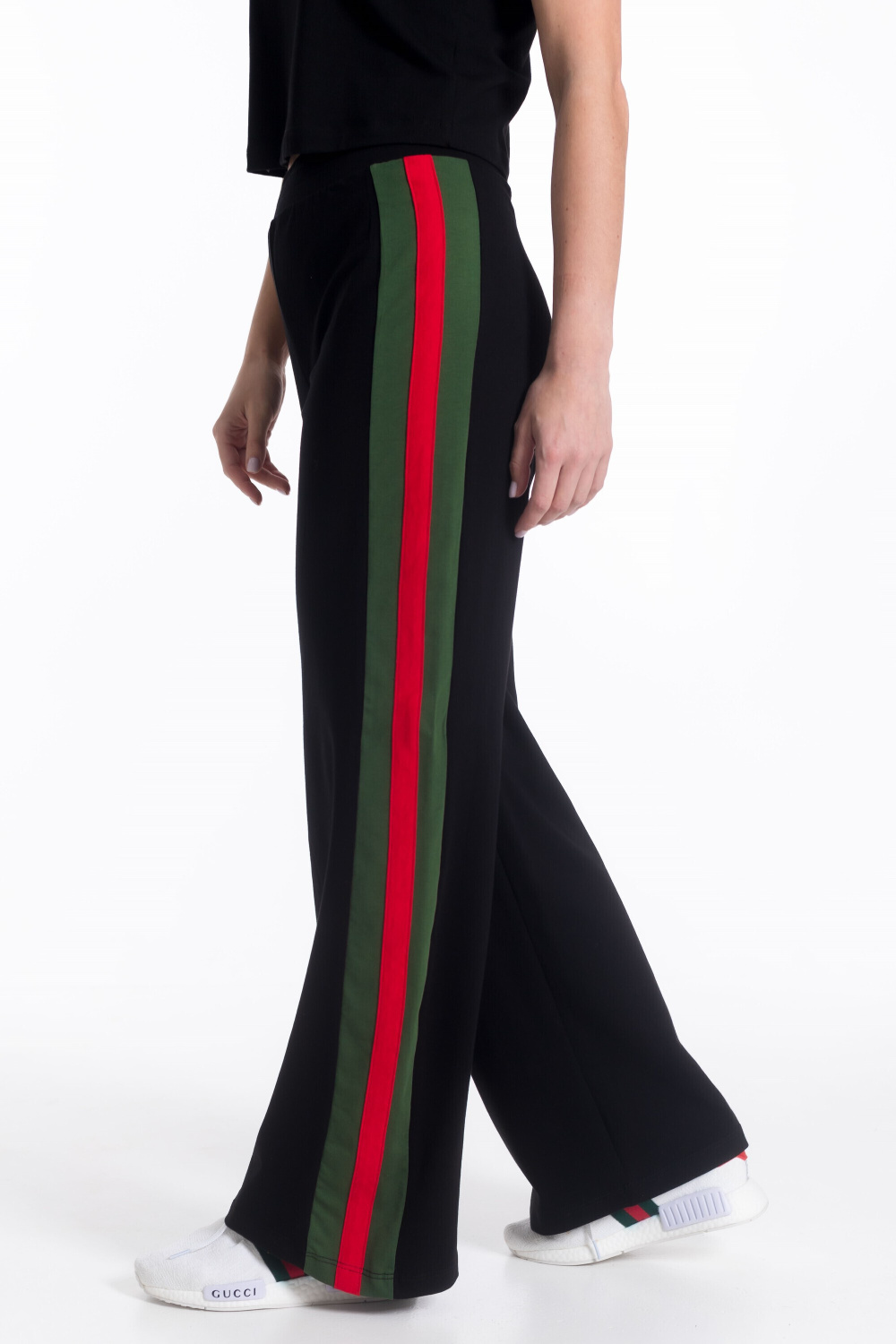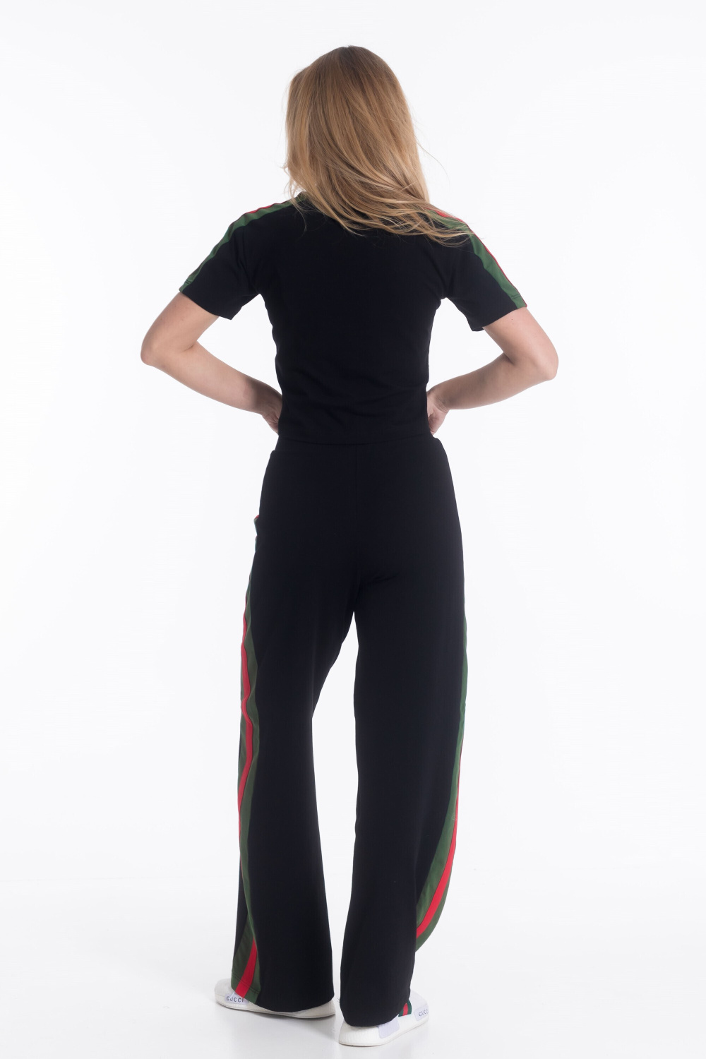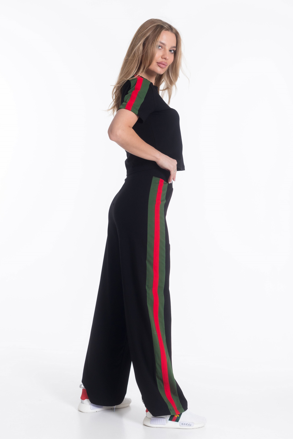 Женский костюм из х/б полотна с добавлением лайкры — отличный выбор для повседневной носки. Укороченная футболка с круглым вырезом горловины обеспечивает свободу движений, а свободные брюки с поясом на резинке и боковыми карманами гарантируют комфорт. Лампасы контрастного цвета на рукавах и брюках добавляют изюминку в дизайн костюма. Такой наряд подойдёт для прогулок, неформальных встреч или отдыха.