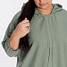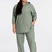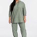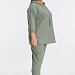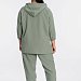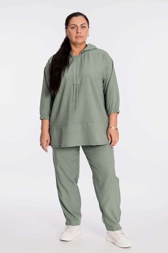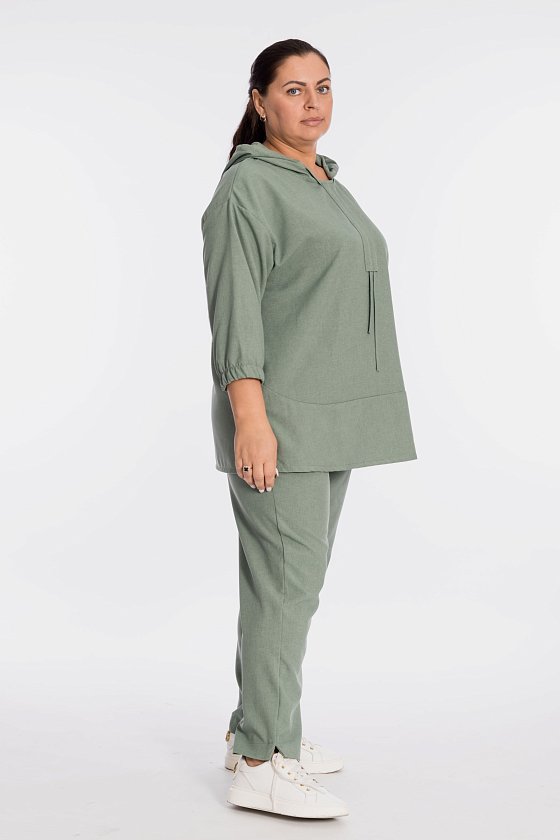 Костюм выполнен из искусственного льна. Состоит из блузы и брюк. Блуза со спущенной линией плеча, низ рукавов длиной 3/4 на резинке. В капюшон вставлен шнур из основного полотна, который далее проходит в кулиску по центру переда. В низу, по бокам блузы разрезы. Брюки с карманами по бокам, пояс на резине. Брюки заужены к низу, в низу боковых швах разрезы.