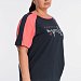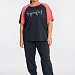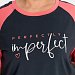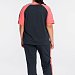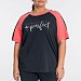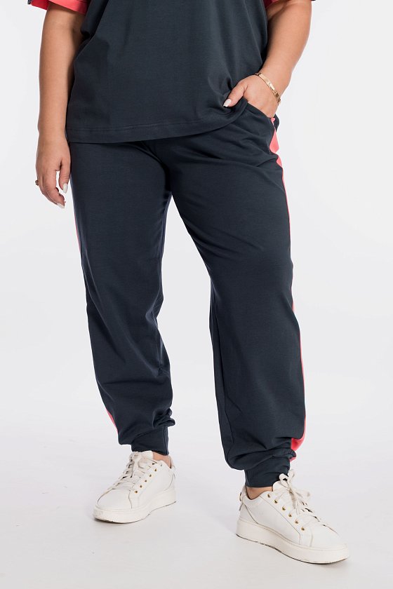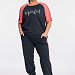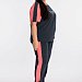 Костюм выполнен из кулирки с добавлением лайкры, состоит из футболки и брюк. Футболка свободного силуэта, с рукавом покроя реглан, круглый вырез горловины оформлен планкой. Спереди нанесён принт. Брюки с отделочными полосами и карманами по бокам, притачным поясом и манжетами внизу.