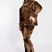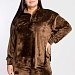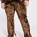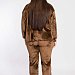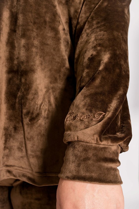Женский костюм выполнен из однотонного велюра. Толстовка со спущенной линией плеча и длинным рукавом, на левом манжете с вышивкой. Воротник-стойка, с застёжкой на металическую молнию. Внизу боковых швов толстовки небольшие разрезы. Брюки с поясом на резине и разрезами в шаговом шве.