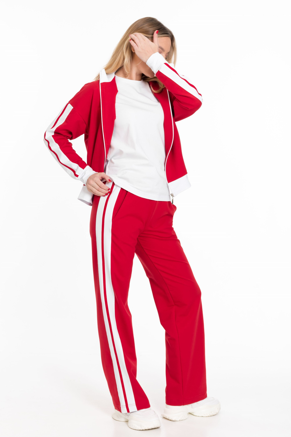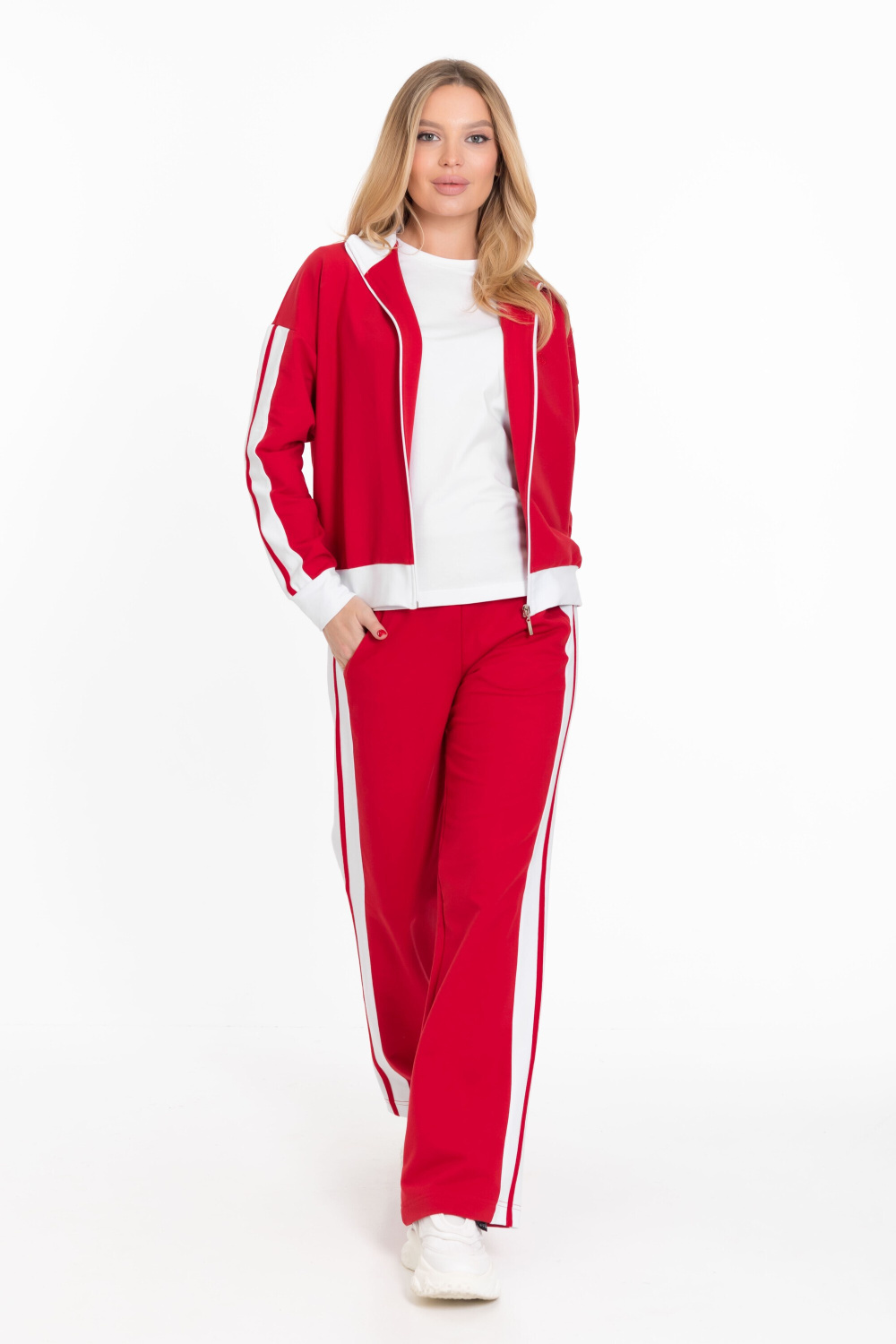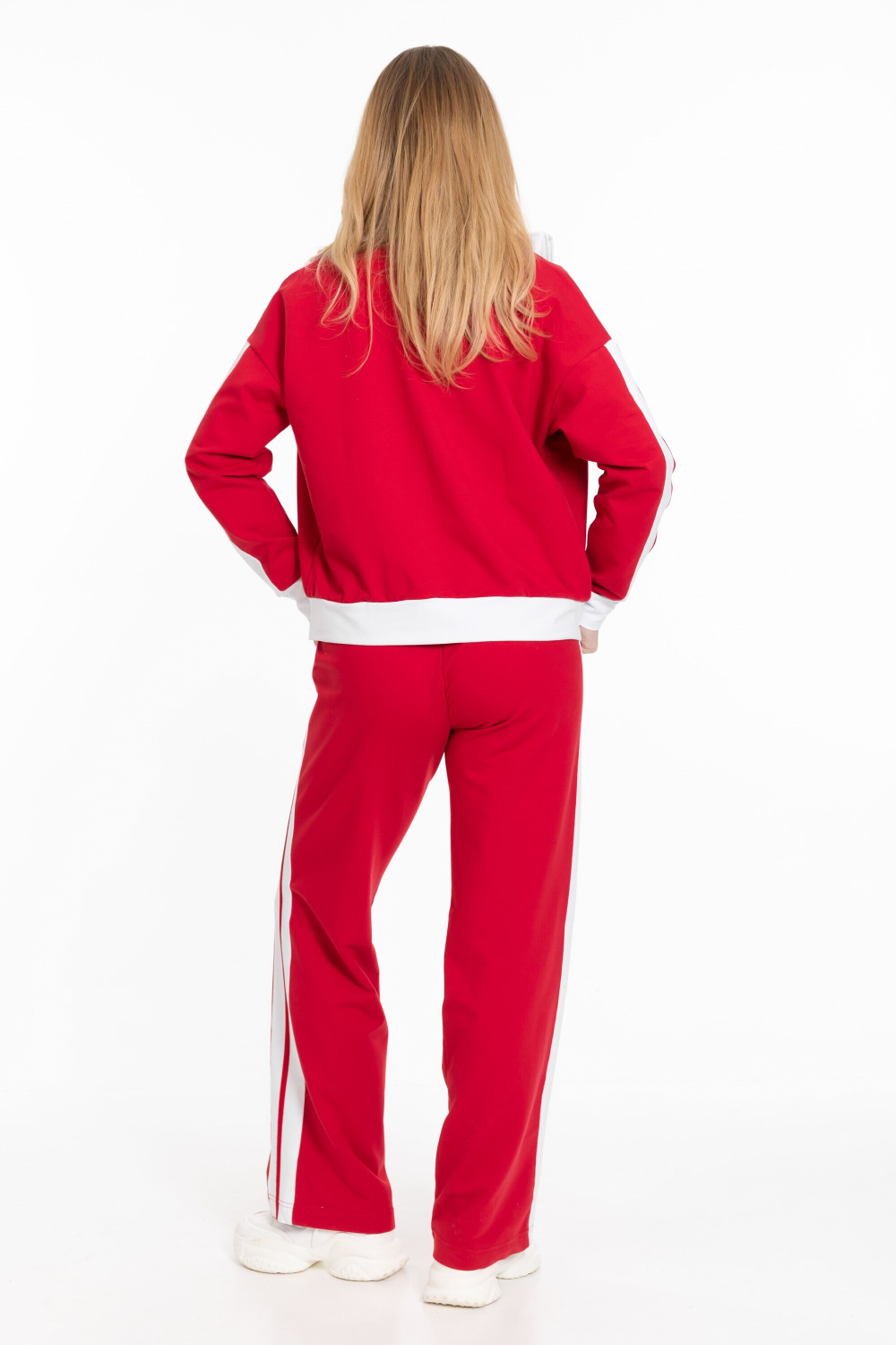Женский костюм из толстовки и брюк выполнен из однотонного красного футера петли.