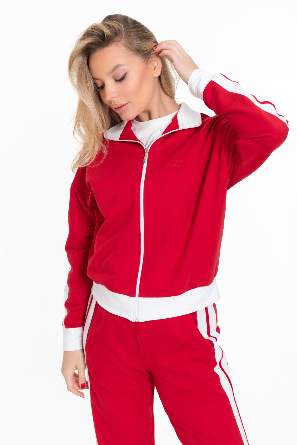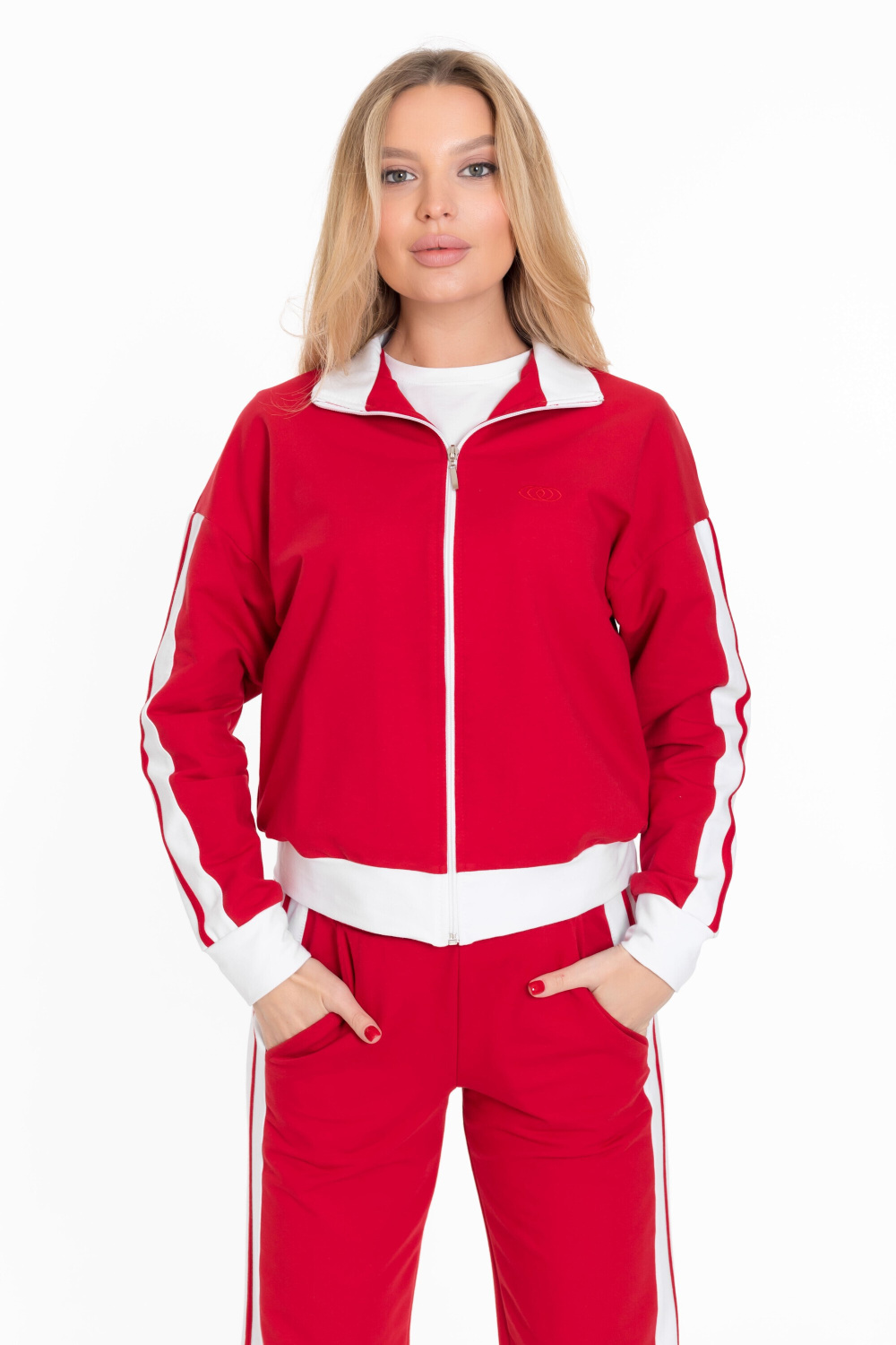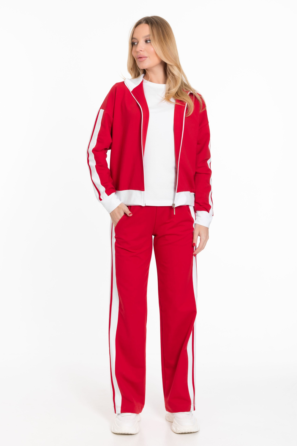 Женский костюм из толстовки и брюк выполнен из однотонного красного футера петли.