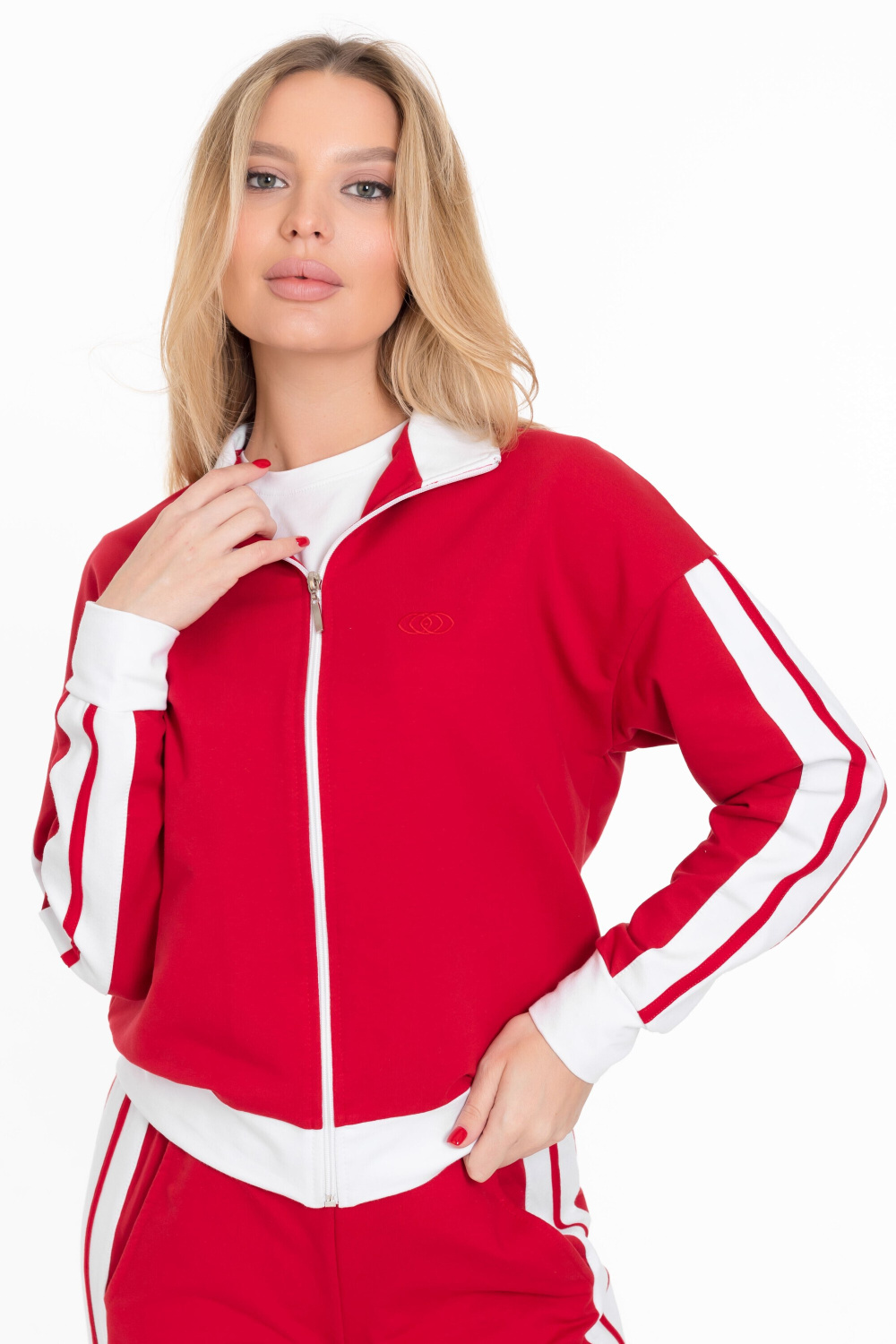 Толстовка укороченная, застёгивается на молнию белого цвета. Воротник-стоечка и манжеты рукавов белого цвета добавляют изделию элегантности и стиля. На левой полочке толстовки расположена вышивка в тон основного цвета, что придаёт изделию оригинальность.