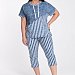 Костюм выполнен из кулирки, 100% хлопок. Футболка с коротким рукавом, в круглый вырез горловины вставлен шнур. Спереди размещен карман. Капри с поясом на резине.