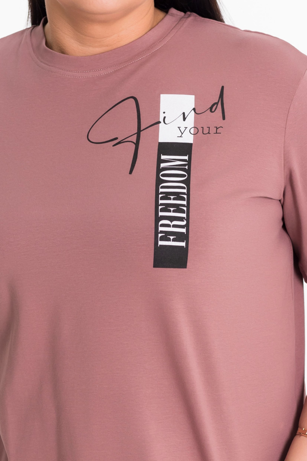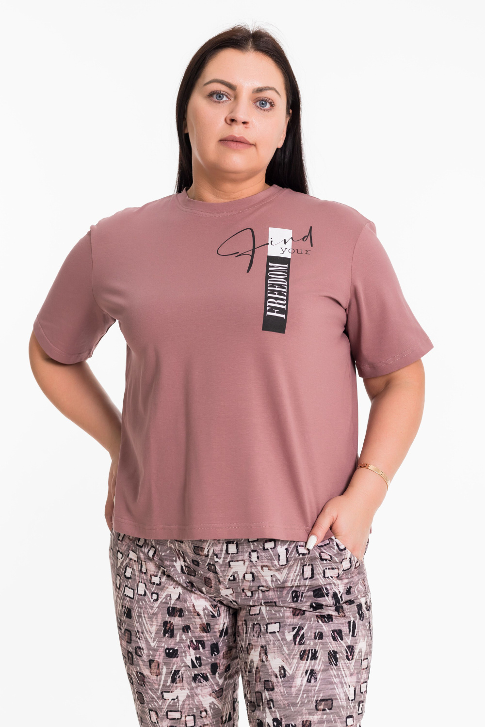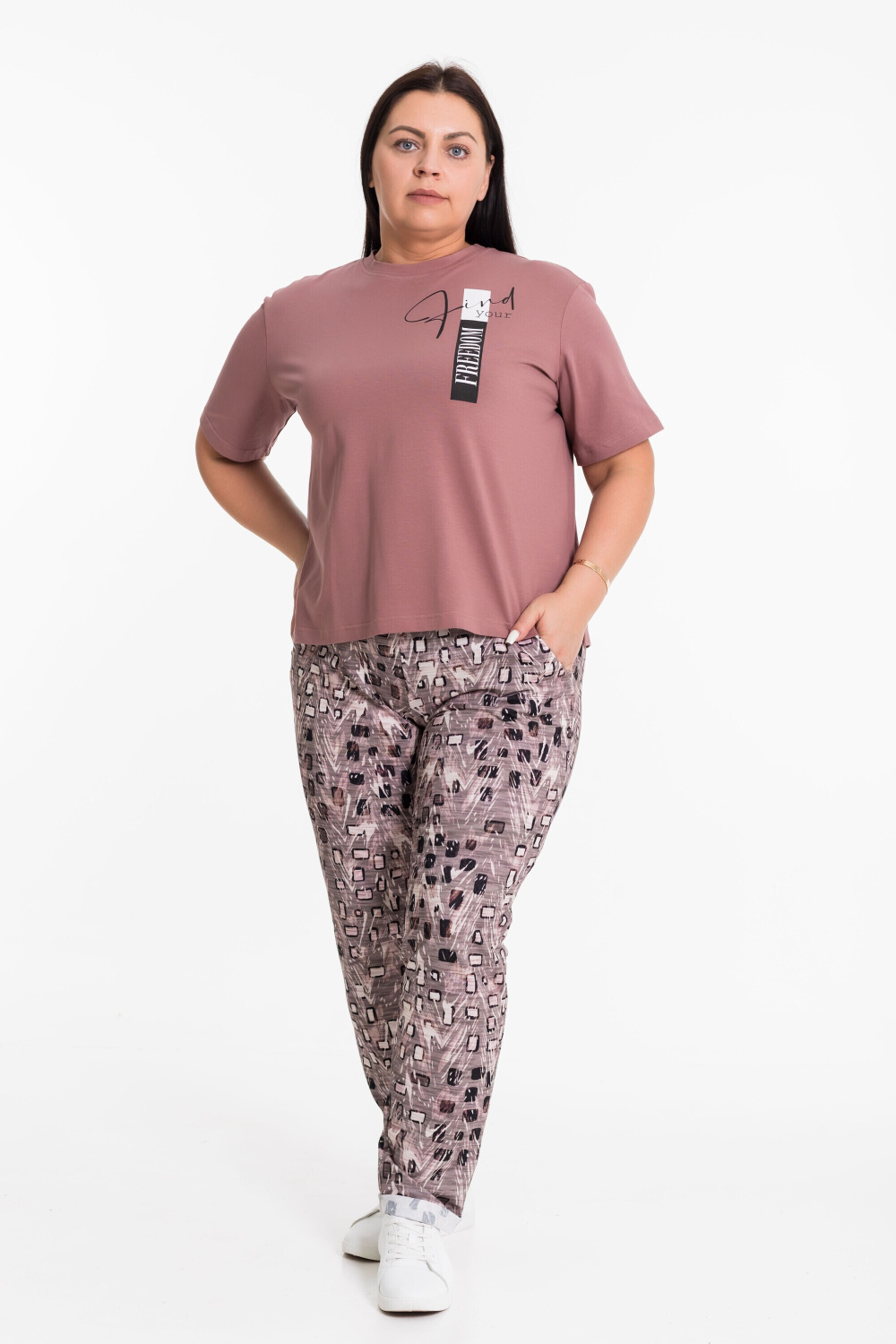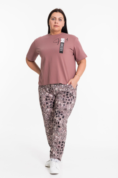 Женский костюм из хлопкового полотна — отличный выбор для повседневной носки. Костюм состоит из футболки и брюк, выполненных из мягкой и приятной к телу ткани. Футболка из кулирки с лайкрой, со спущенной линией плеча, что придаёт модели свободный и расслабленный вид. Рукав доходит до локтя, обеспечивая удобство и свободу движений. По бокам внизу расположены небольшие разрезы, а спереди — принт, который гармонирует с цветом брюк. Брюки из футера, прямого кроя оснащены карманами и поясом на резинке, что делает модель более функциональной и удобной. Низ брюк подвернут, это придает изделию оригинальность. Такой костюм идеально подойдёт для прогулок, неформальных встреч или отдыха.