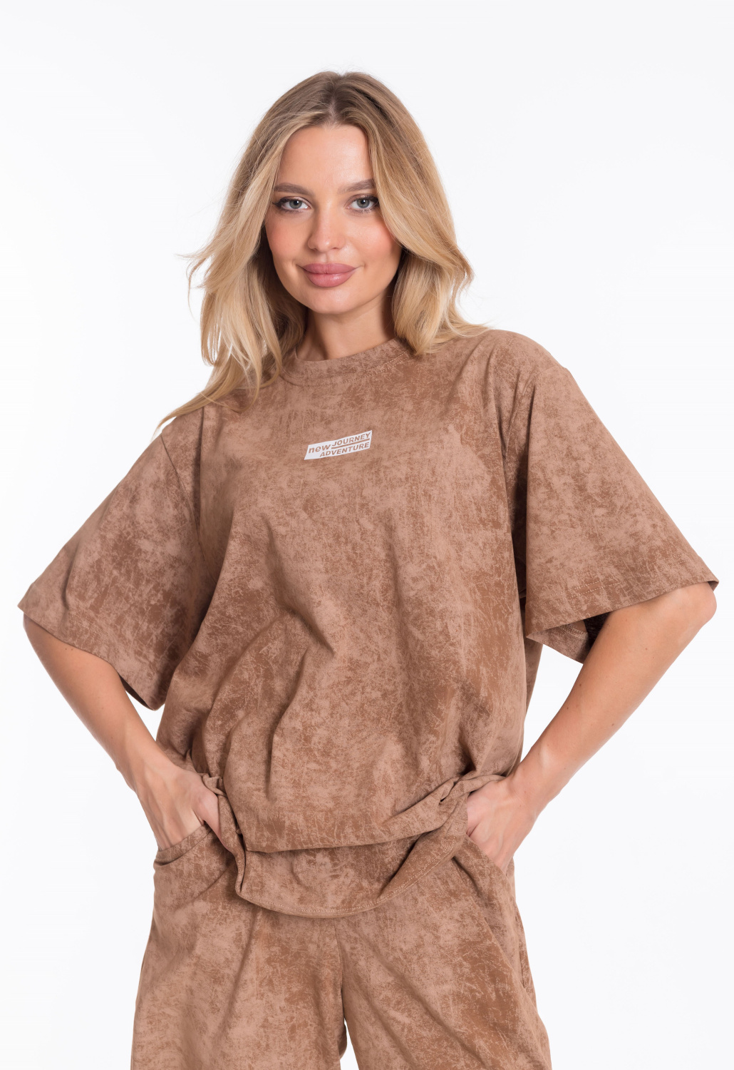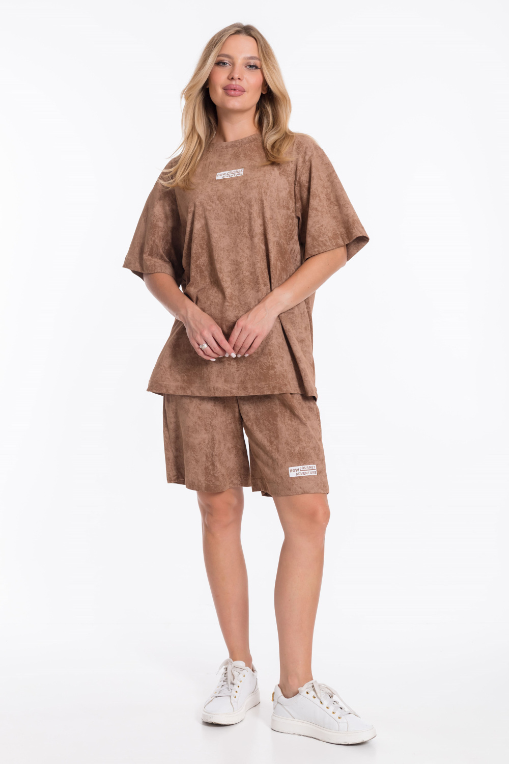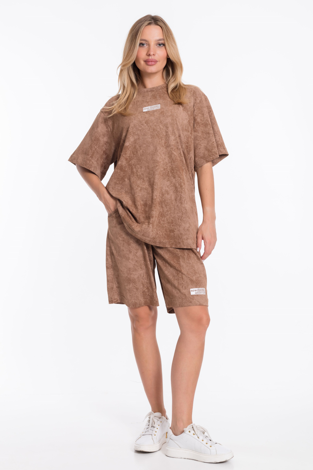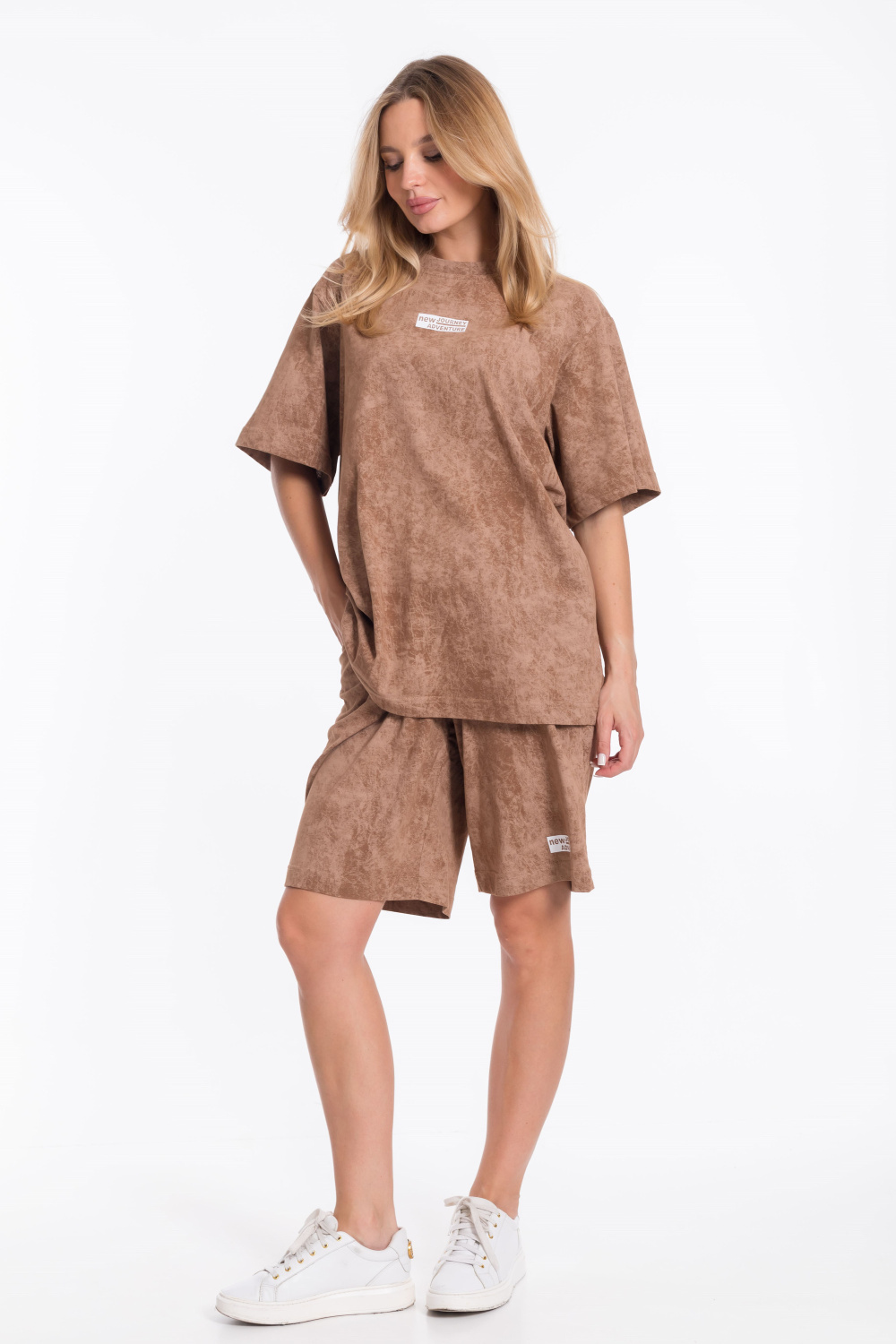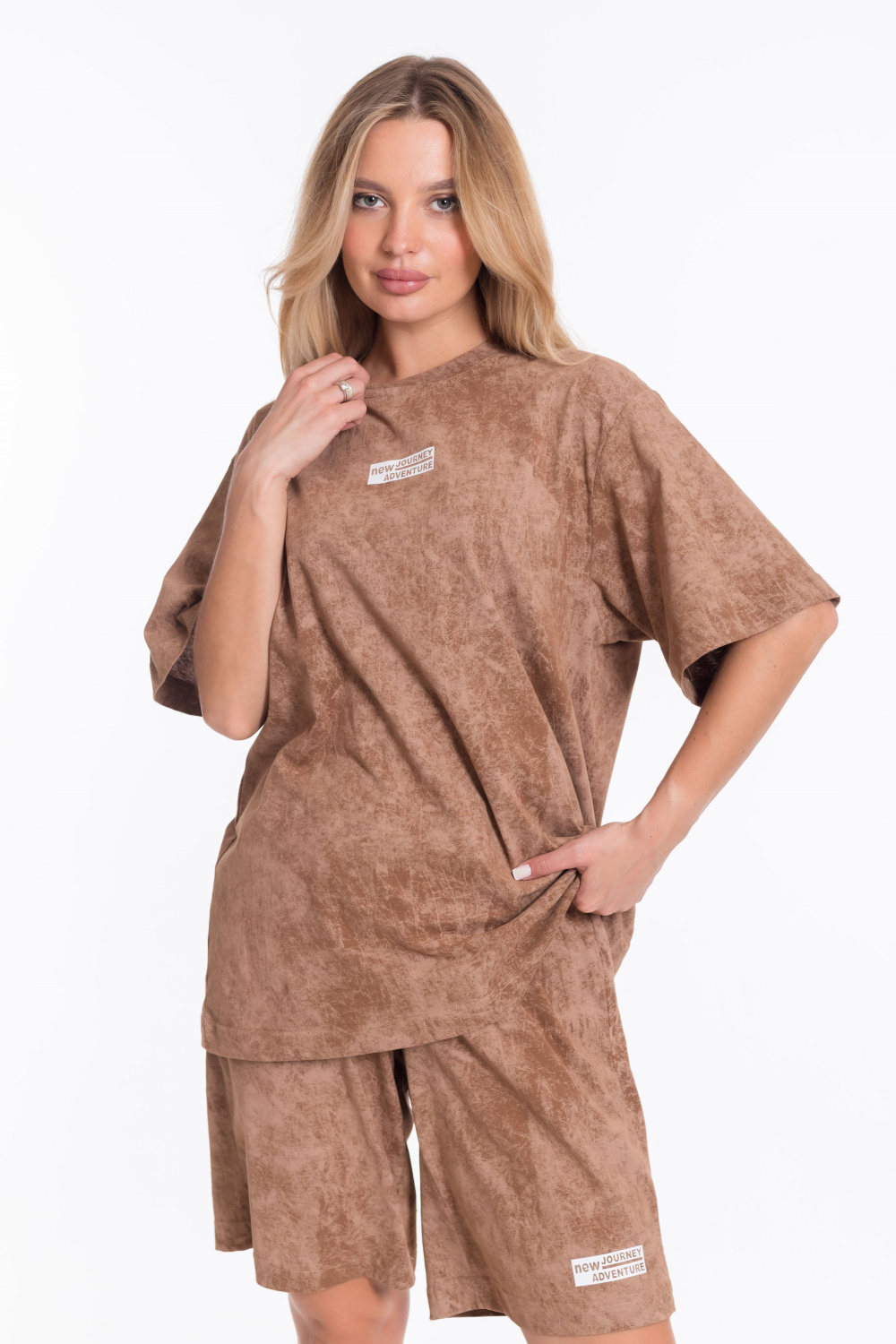 Женский костюм - футболка и шорты свободного кроя из однотонного хлопкового полотна коричневого цвета. Футболка с короткими рукавами и спущенной линией плеча имеет круглый вырез горловины и украшена принтом спереди. Длина шорт до середины бедра, пояс выполнен из широкой резинки, а по бокам есть карманы. Штанина шорт украшена принтом, который соответствует принту на футболке. Такой наряд подойдёт для повседневной носки, прогулок или неформальных встреч. Костюм обеспечит комфорт и свободу движений благодаря свободному крою и натуральным материалам.