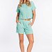 Костюм свободного силуэта выполнен из муслина. Состоит из футболки с цельнокроеным коротким рукавом с планкой и шорт. Пояс шорт на резине.
