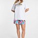 Футболка из однотонной кулирки свободного силуэта придаёт изделию комфорт и удобство. На передней части расположен принт, который гармонично сочетается с цветом шорт и добавляет яркости модели.