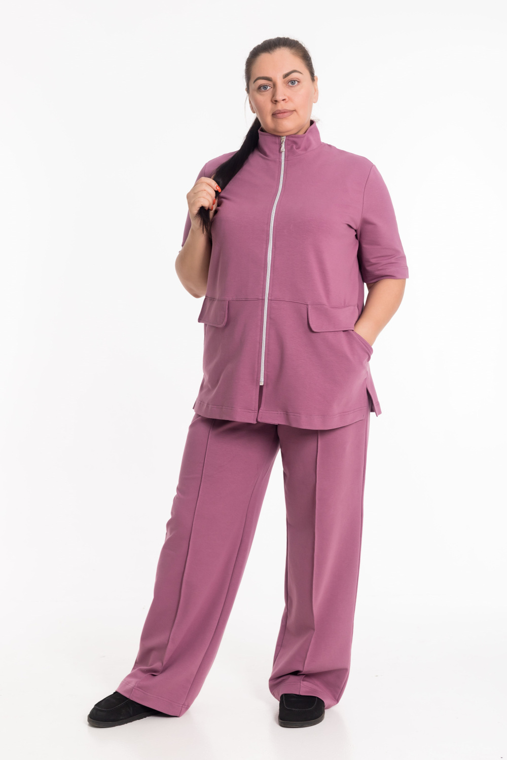 Женский костюм выполнен из однотонного футера с лайкрой и состоит из брюк и рубашки на молнии. Брюки имеют удобный притачной пояс и боковые карманы. Рубашка с воротником-стойкой дополнена горизонтальным подрезом на полочках, от которого начинаются боковые карманы с клапанами. В боковых швах предусмотрены разрезы для комфорта. Рукава длиной до локтя делают образ стильным и практичным.