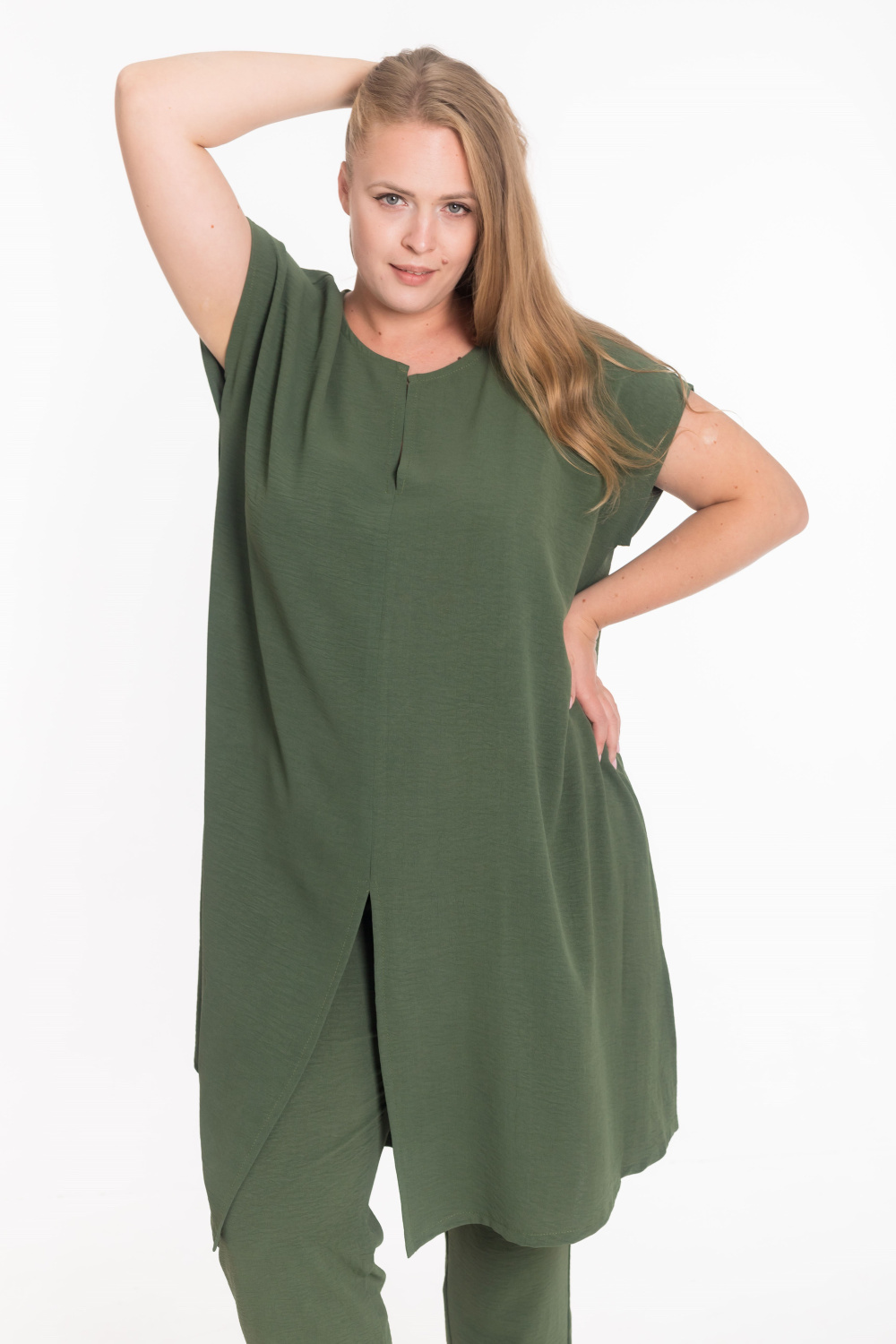 Костюм из струящегося полотна. Туника свободного силуэта, с разрезами спереди и по бокам, линия плеча спущена. Брюки заужены, по бокам карманы, пояс на резинке.