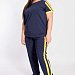 Костюм выполнен из футер петли с лайкрой, состоит из брюк и футболки с коротким рукавом. Брюки с боковыми карманами, поясом на резинке и шнуре, сбоку вставка с широкими лампасами. Внизу кармана расположен декоративный элемент. У футболки отделка на рукавах, горловина имеет круглый вырез.