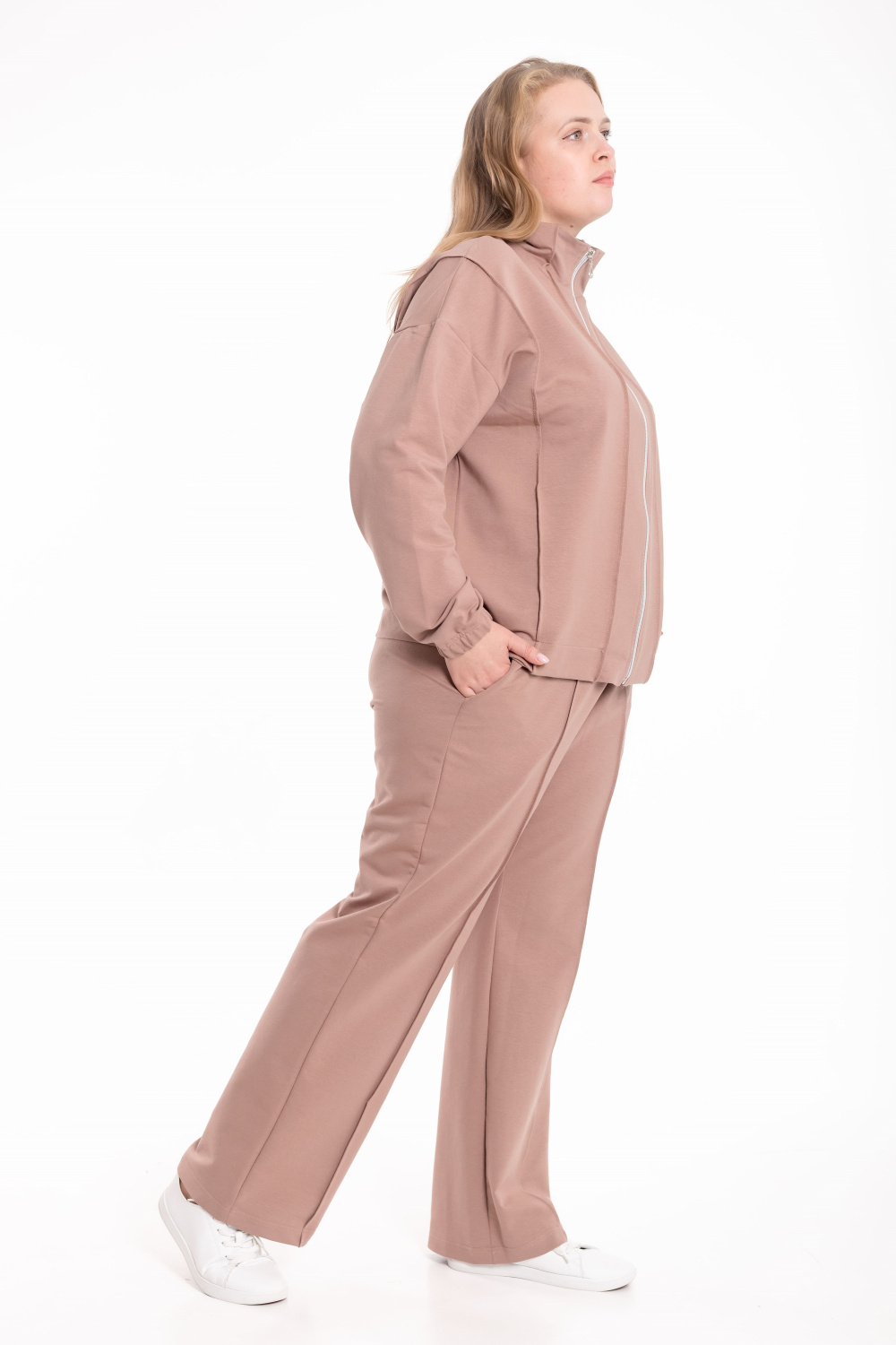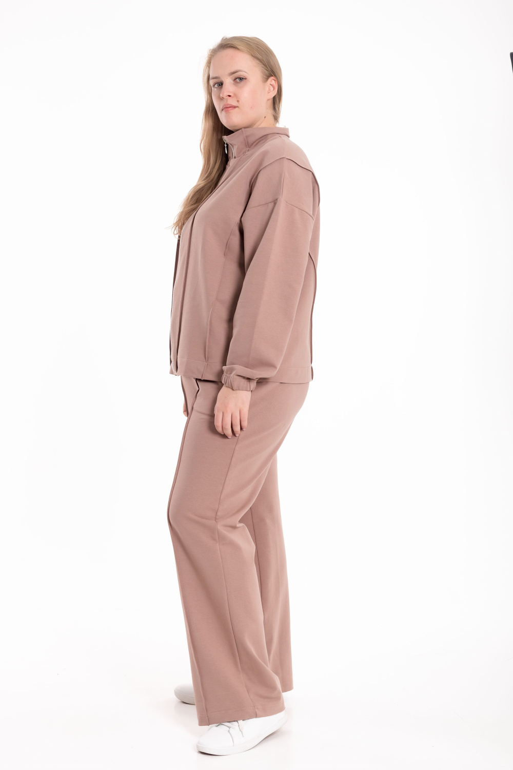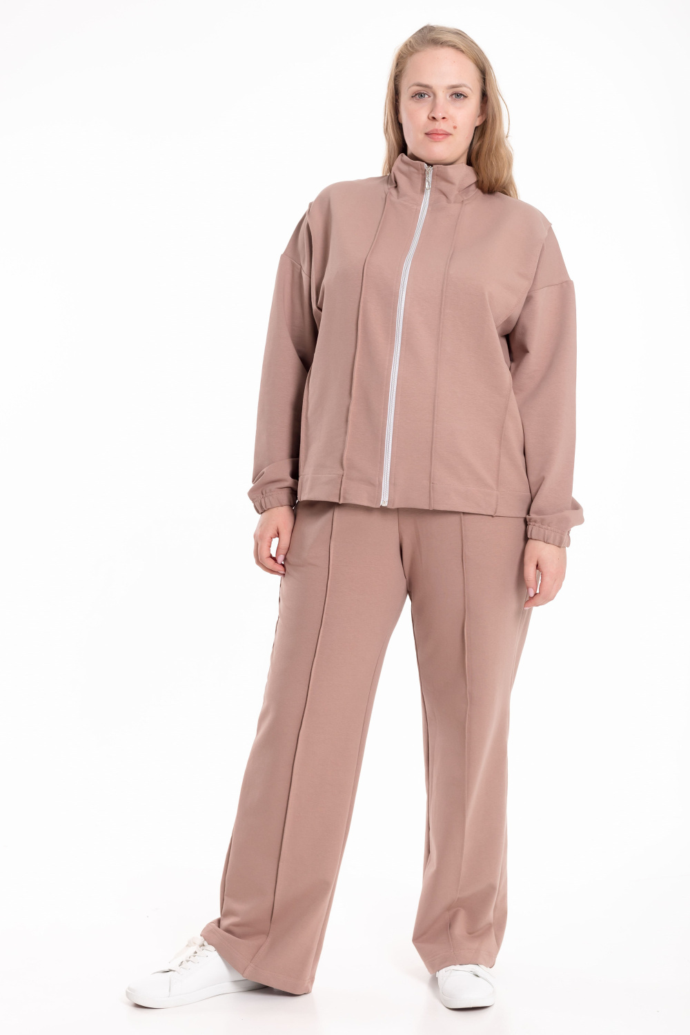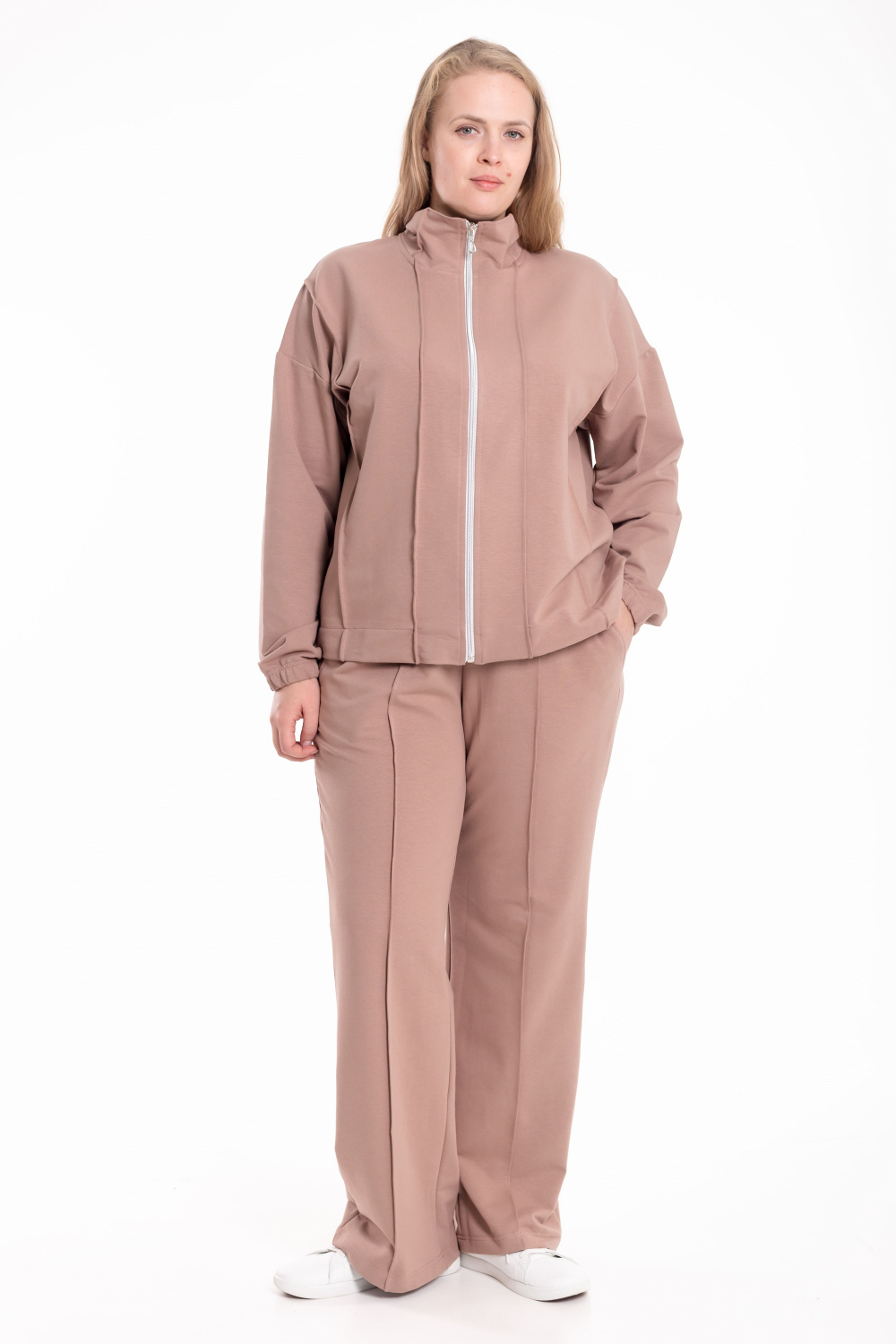 Костюм выполнен из мягкого футера и состоит из толстовки на молнии и брюк с боковыми карманами. Толстовка со спущенной линией плеча, украшена декоративными защипами на воротнике, полочках и спинке, что придаёт модели оригинальность и стиль. Брюки прямого кроя со стрелками, аккуратно простроченными для создания элегантного силуэта. Удобный и практичный костюм идеально подойдёт для повседневной носки и отдыха.