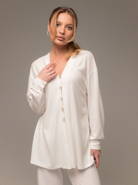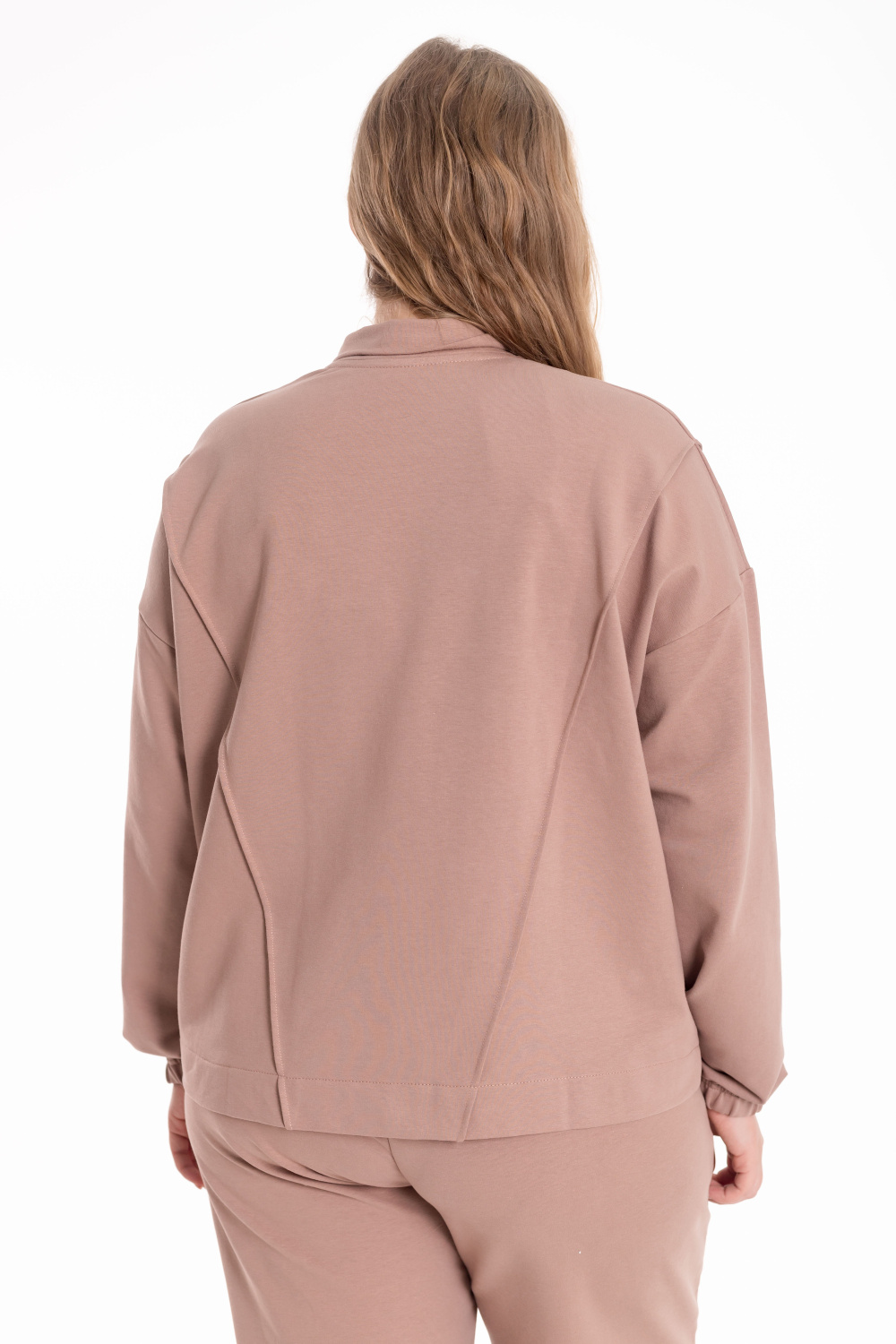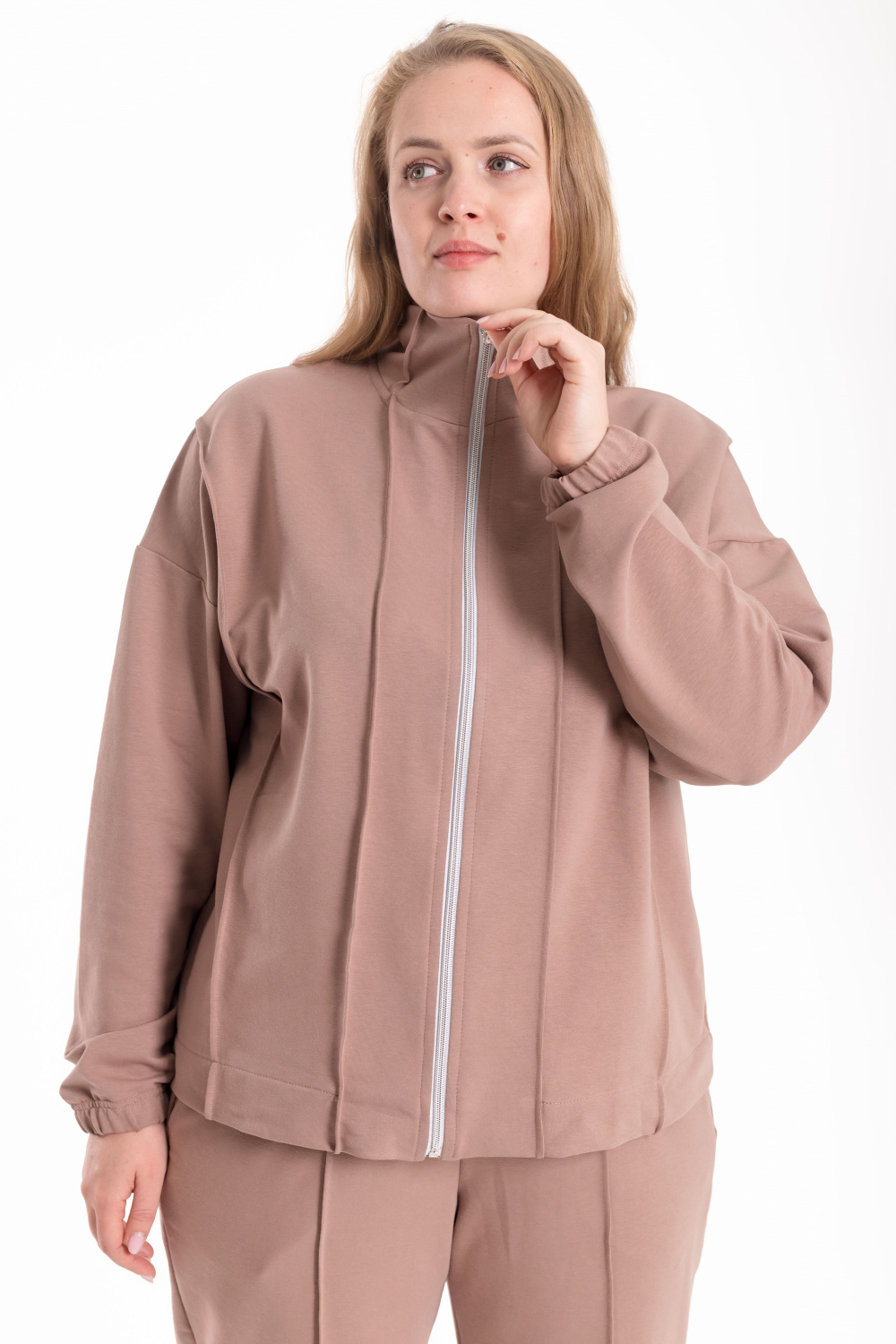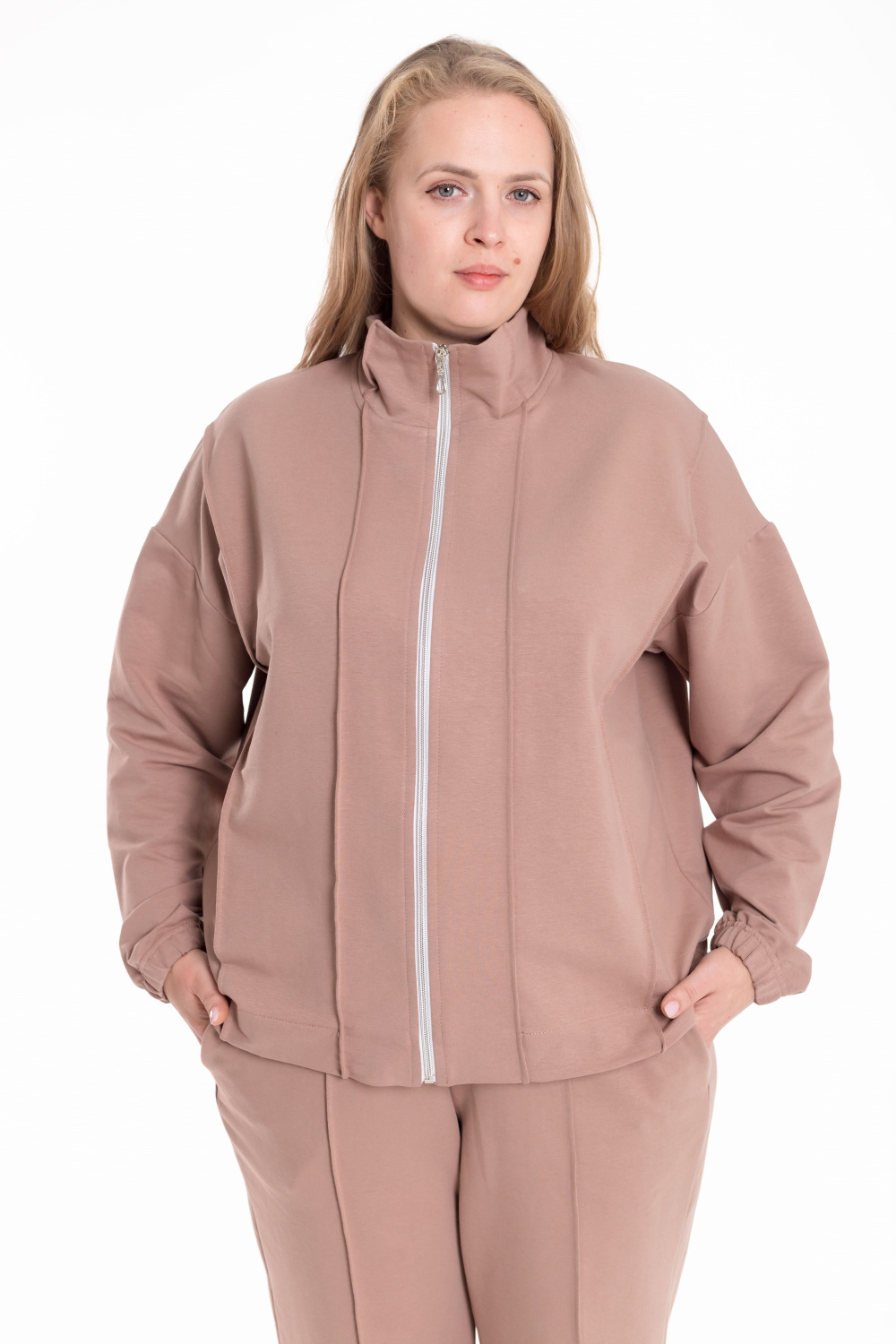 Костюм выполнен из мягкого футера и состоит из толстовки на молнии и брюк с боковыми карманами. Толстовка со спущенной линией плеча, украшена декоративными защипами на воротнике, полочках и спинке, что придаёт модели оригинальность и стиль. Брюки прямого кроя со стрелками, аккуратно простроченными для создания элегантного силуэта. Удобный и практичный костюм идеально подойдёт для повседневной носки и отдыха.