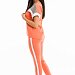 Женский костюм из футер петли с лайкрой. Брюки прямого, зауженого силуэта, по бокам настрочены лампасы. Низ брюк подшит широким подворотом. Пояс на резинке, украшен фальш шнуром. Футболка выполнена из трех полотен. Линия плеча удлинена, манжеты с отворотами. Горловина обработана бейкой из основного полотна.