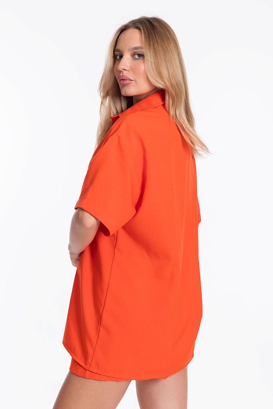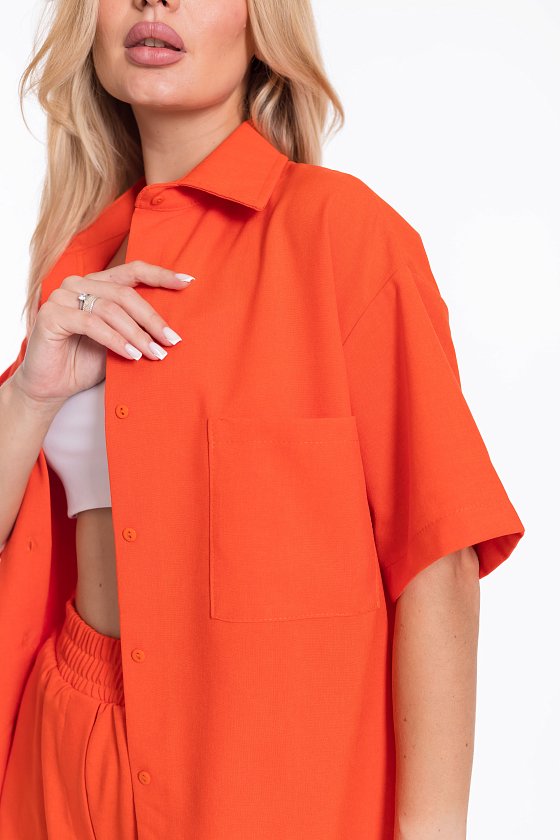 Рубашка свободного кроя с воротником-стойкой и спущенным рукавом длиной до локтя застёгивается на пуговицы спереди, на левой полочке есть карман.