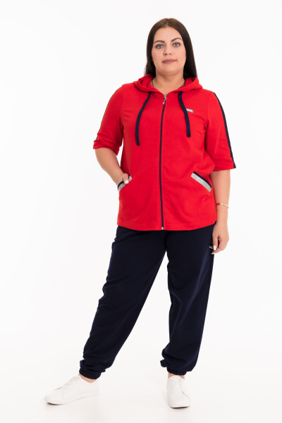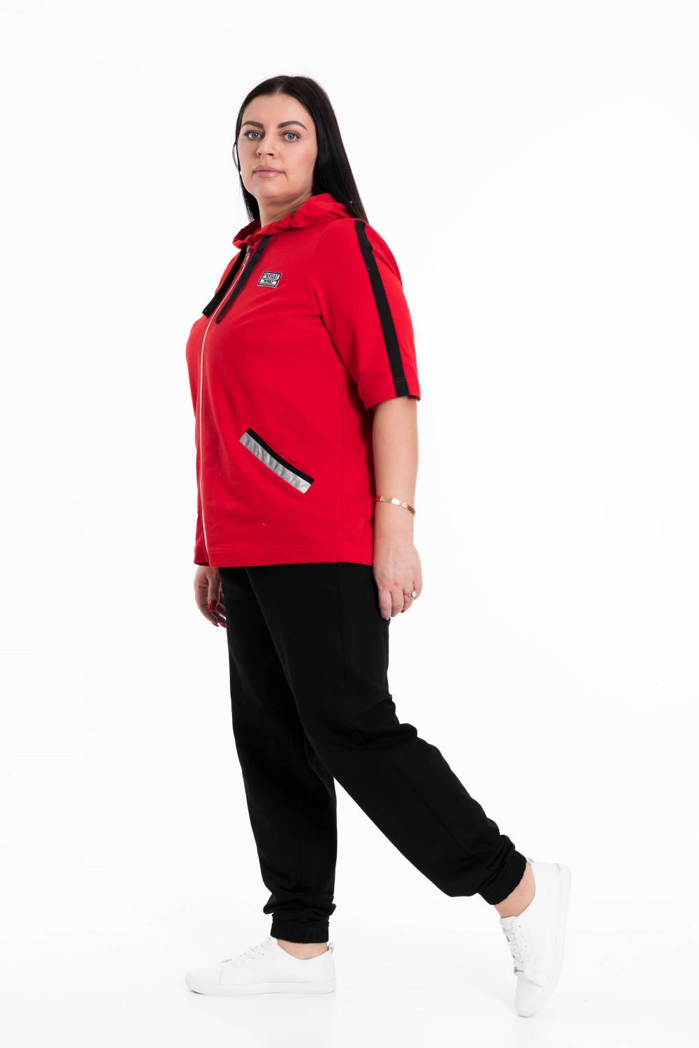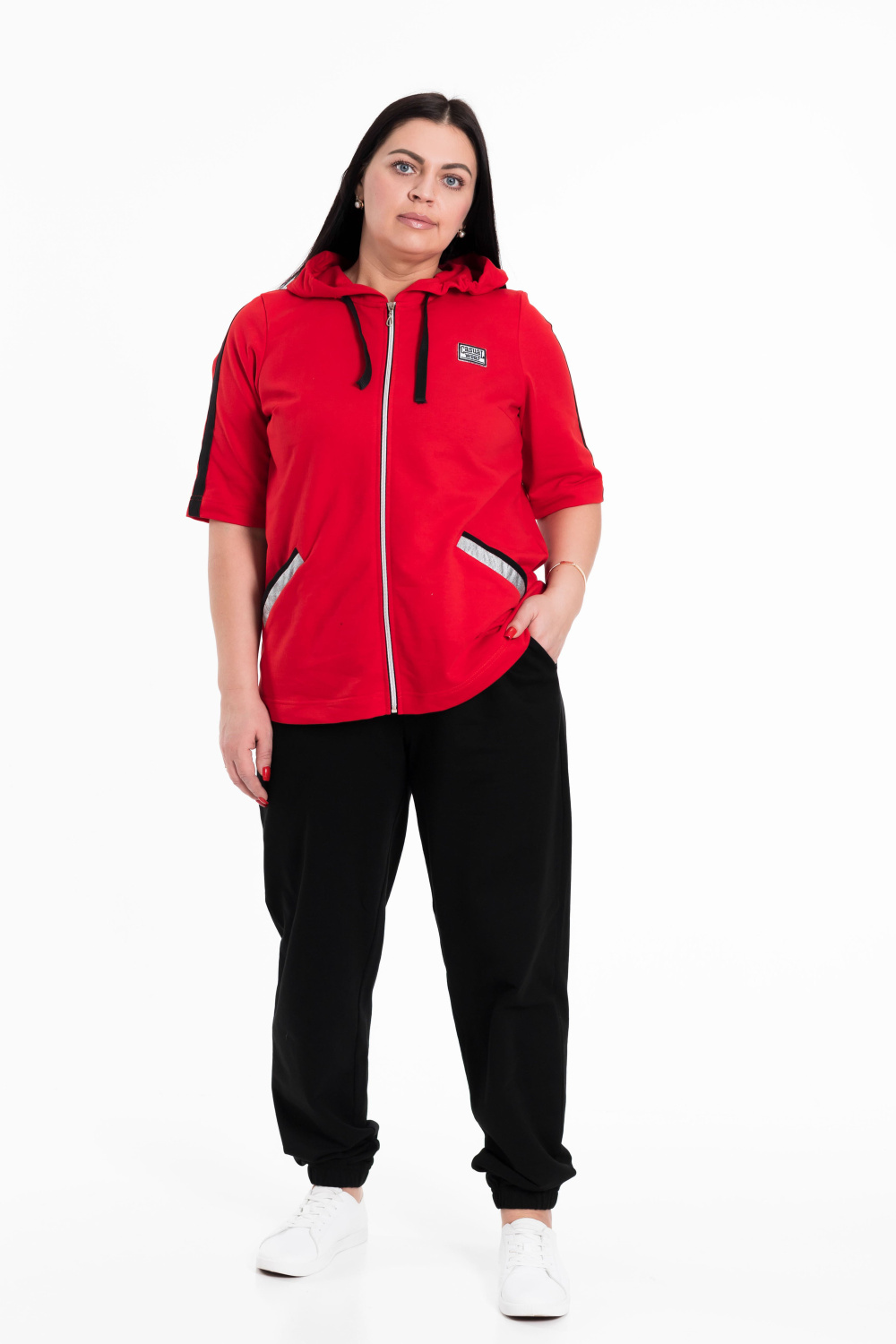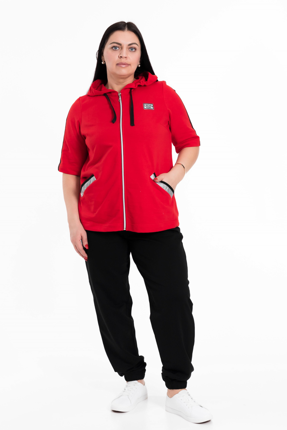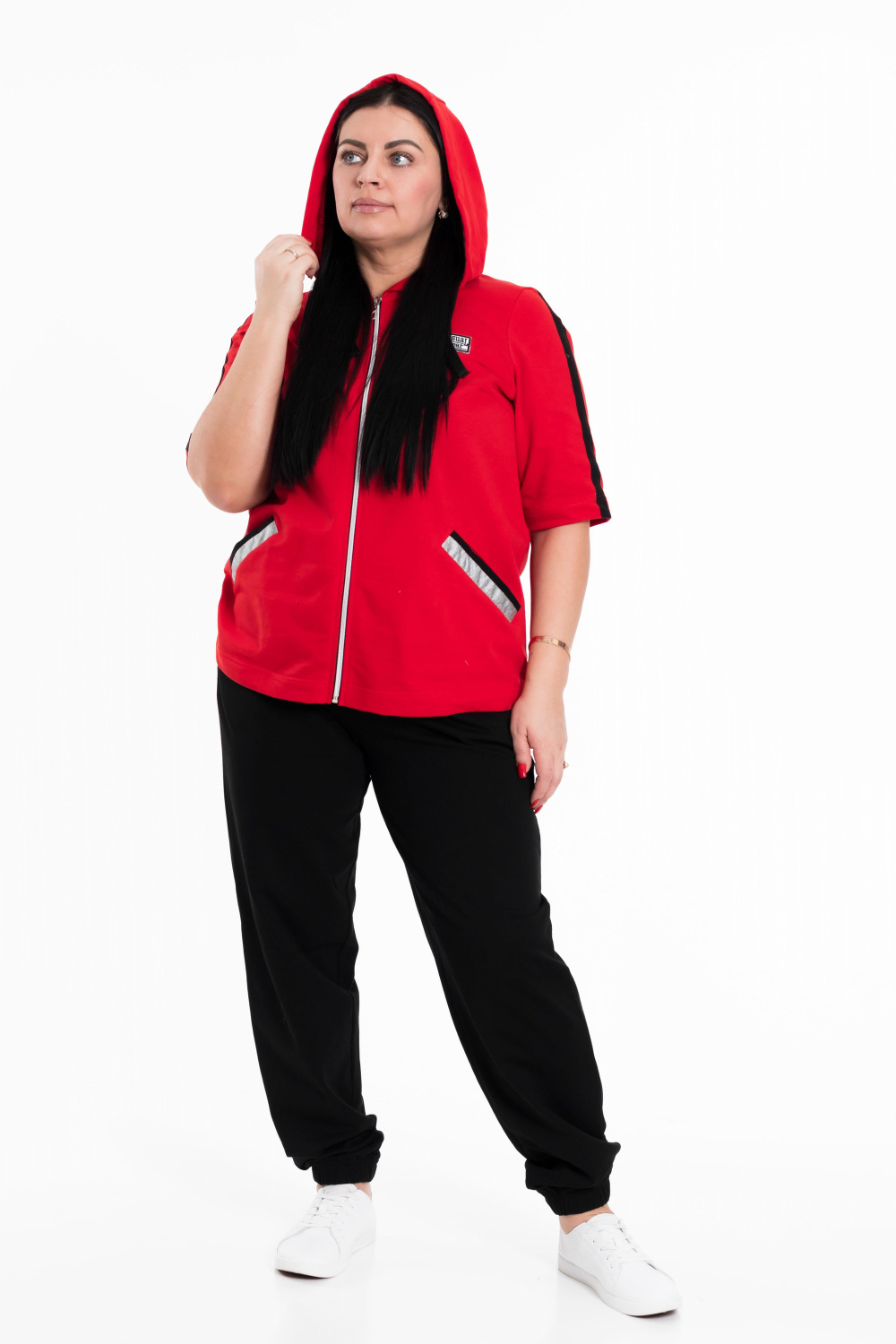 Женский костюм выполнен из хлопкового футера. Толстовка с короткими рукавами, прорезными карманами и застёжкой на молнию. Ширина капюшона регулируется при помощи шнура. Брюки с карманами по бокам, пояс и низ брюк на резине.