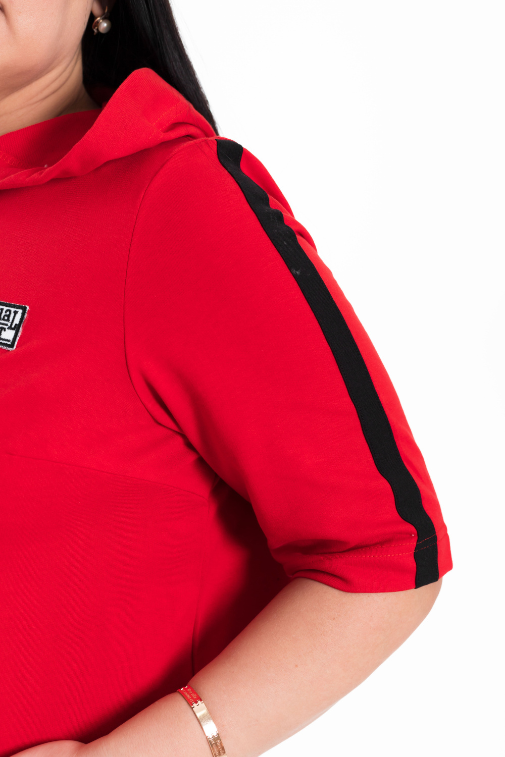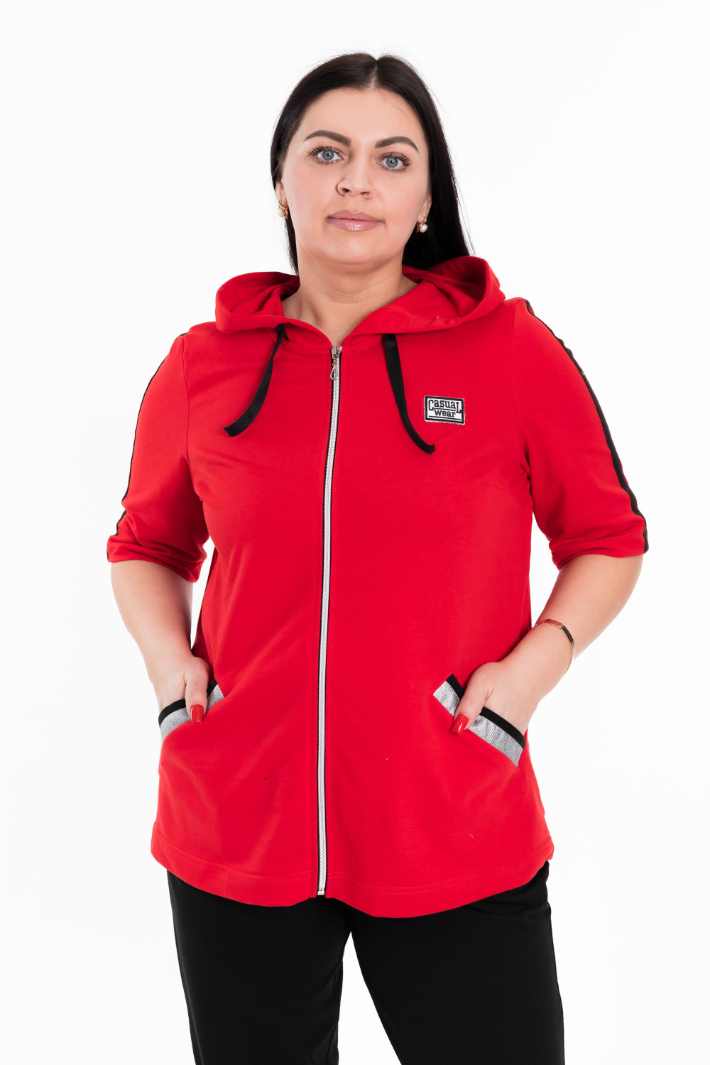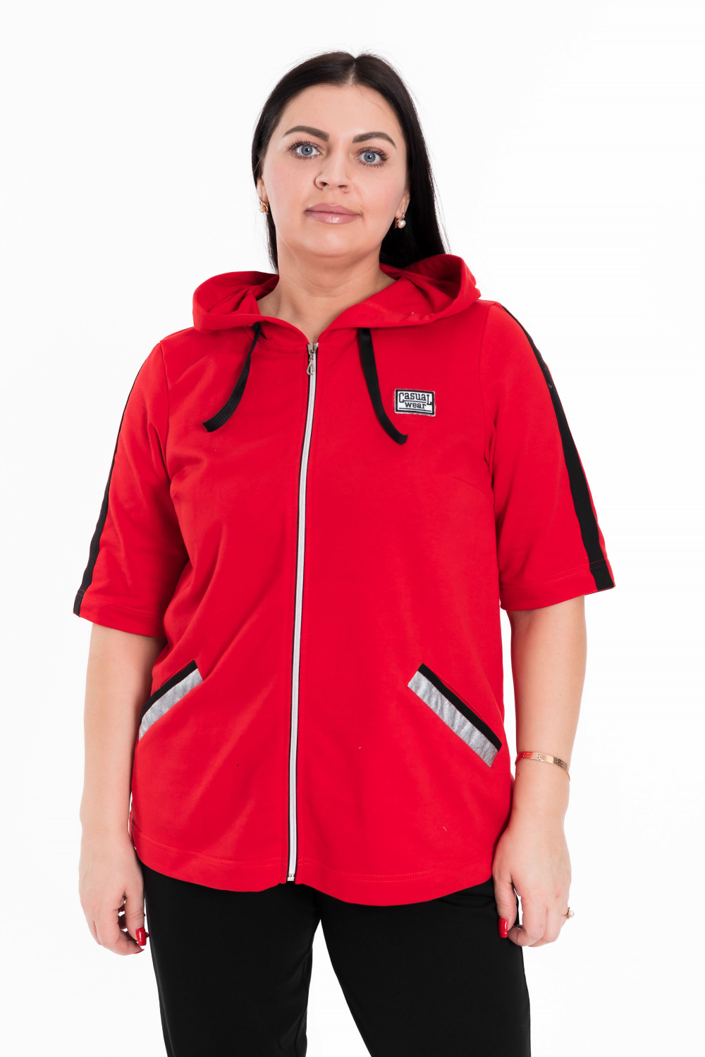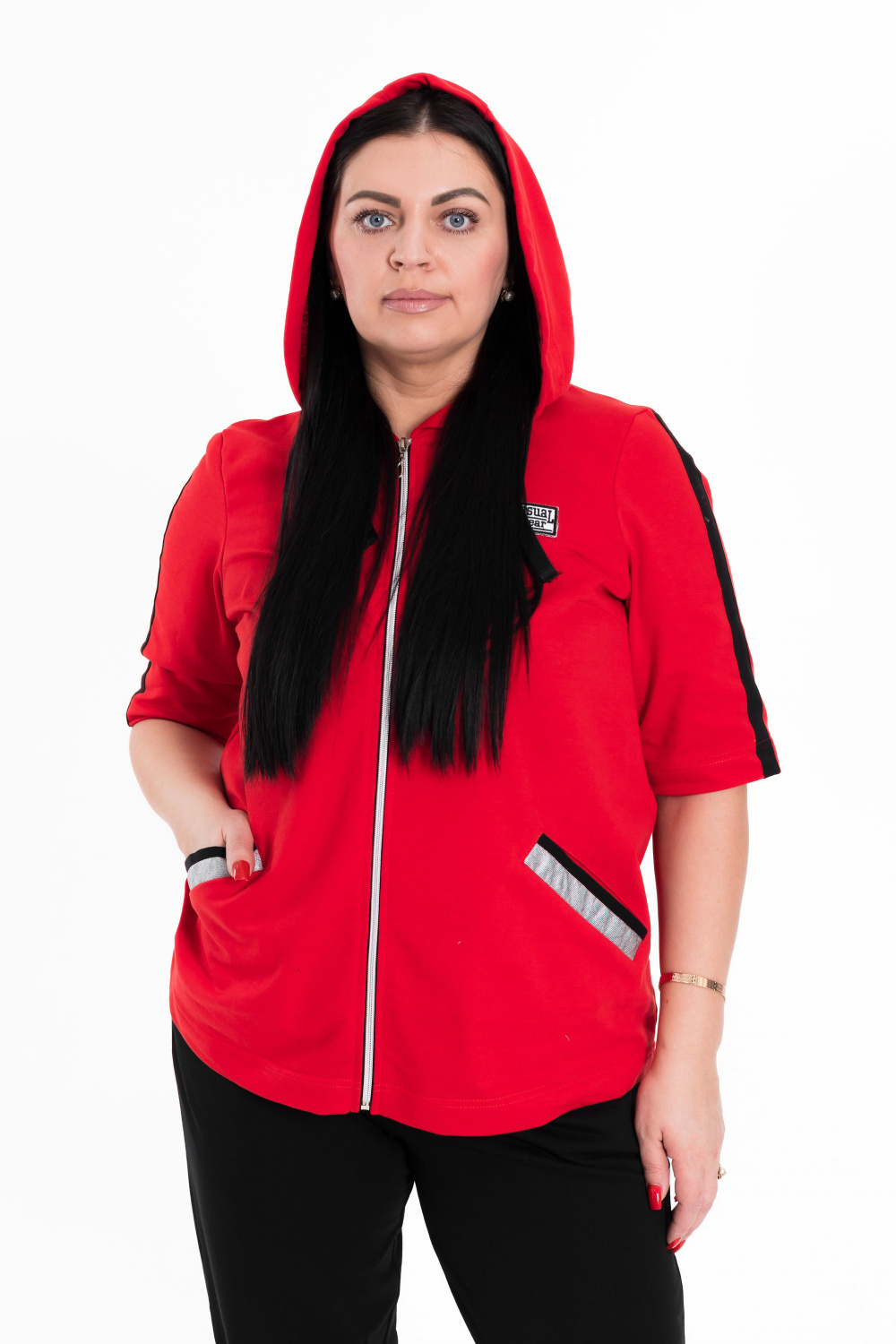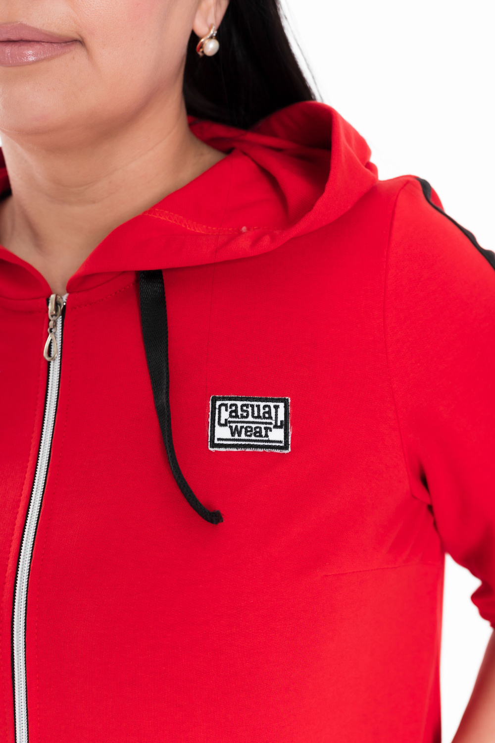 Женский костюм выполнен из хлопкового футера. Толстовка с короткими рукавами, прорезными карманами и застёжкой на молнию. Ширина капюшона регулируется при помощи шнура. Брюки с карманами по бокам, пояс и низ брюк на резине.