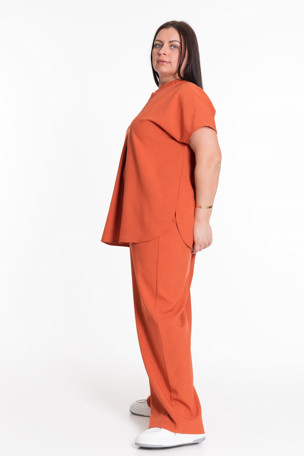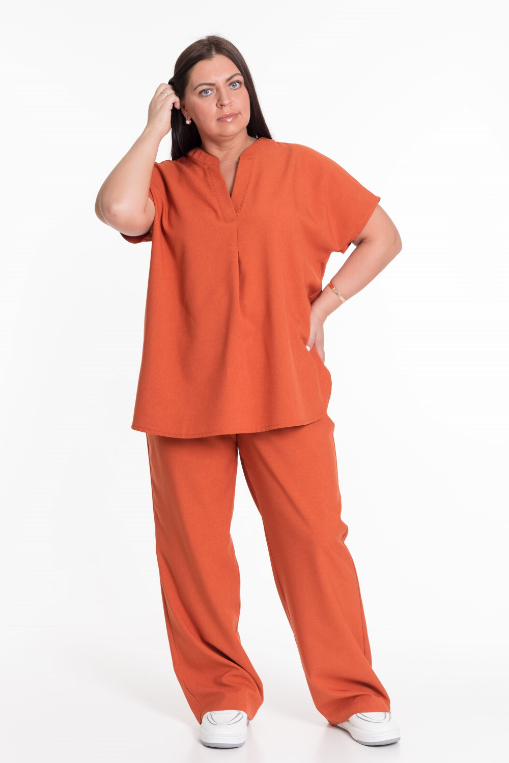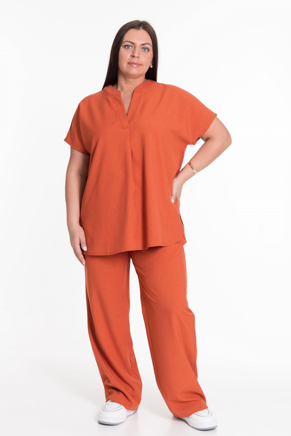 Женский костюм — отличный выбор для повседневной носки. Он выполнен из практичного и лёгкого полотна, имитирующего лён.