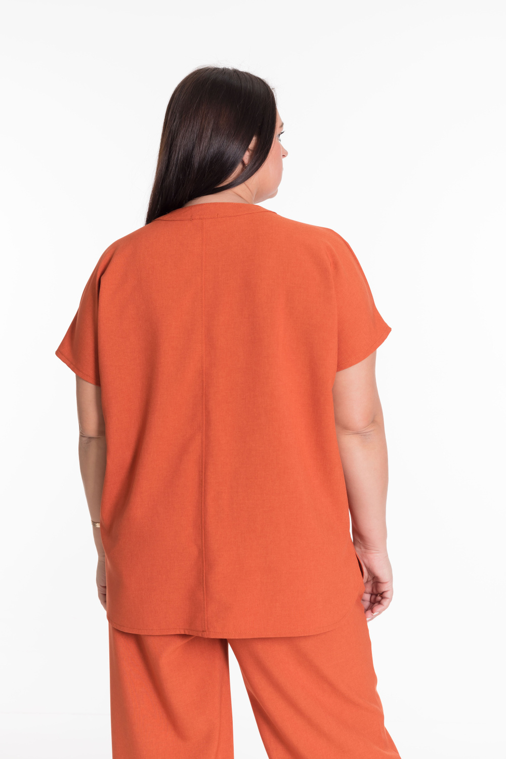 Футболка свободного кроя с коротким цельнокроеным рукавом. V-образный вырез горловины оформлен планкой и придаёт изделию стильный вид.