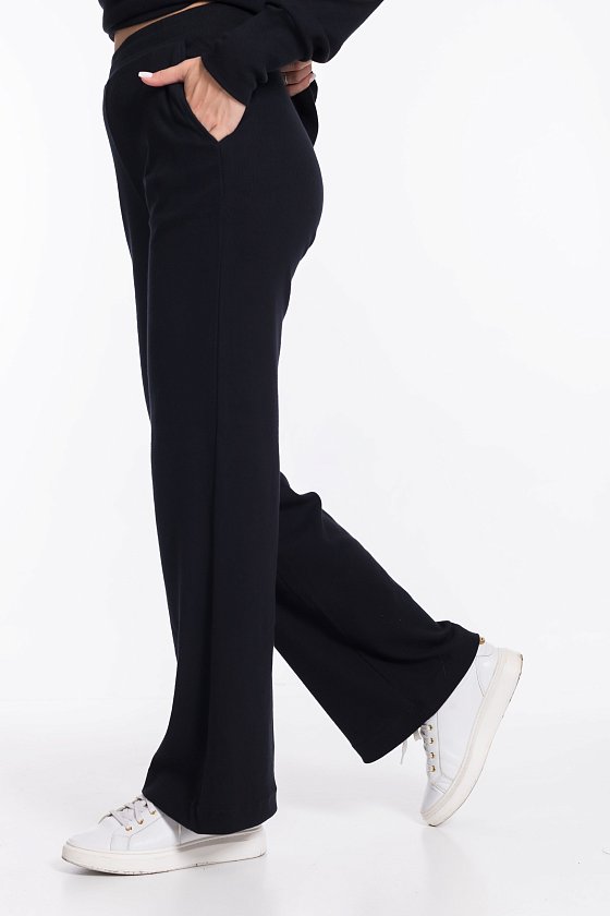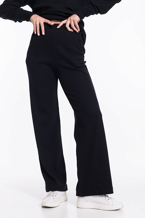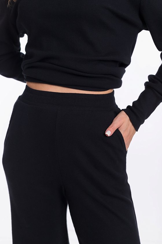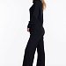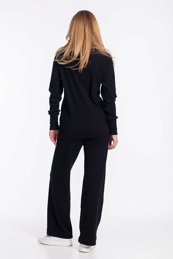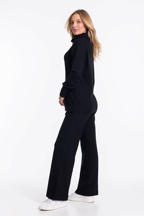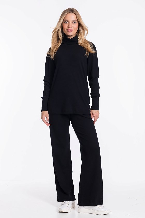 Женский черный однотонный костюм из кашкорсе — отличный выбор для повседневной носки. Водолазка с воротником-стойкой, спущенной линией плеча и удлинёнными манжетами на рукавах создают элегантный образ. Брюки свободного силуэта хорошо садятся по фигуре, а боковые карманы добавляют практичности. Широкий пояс на резинке обеспечивает комфортную посадку.