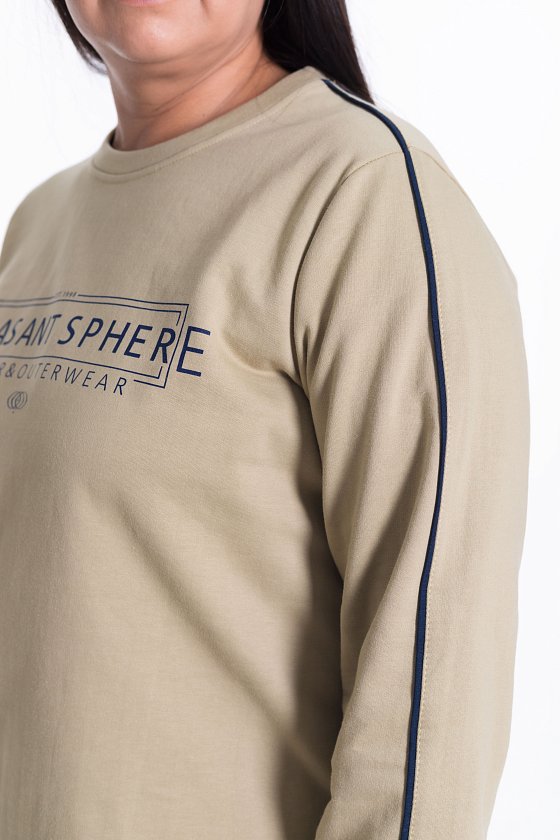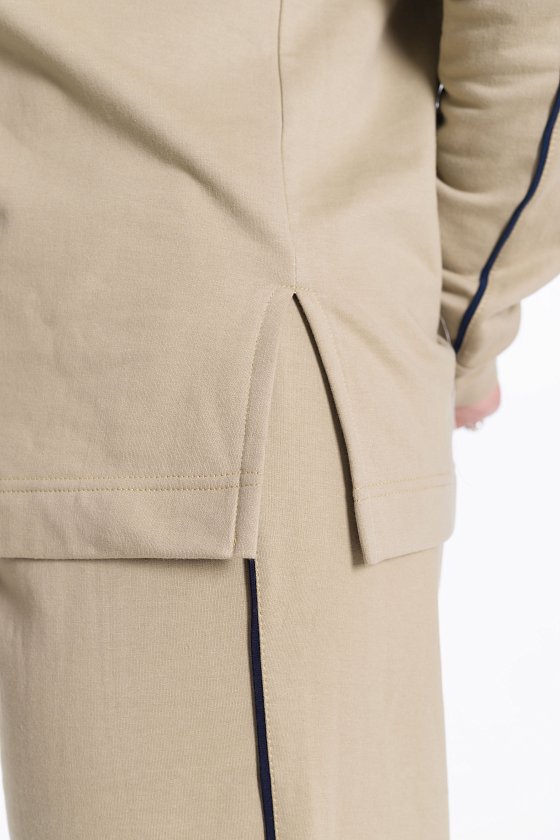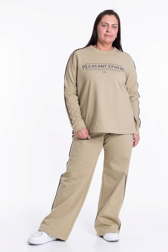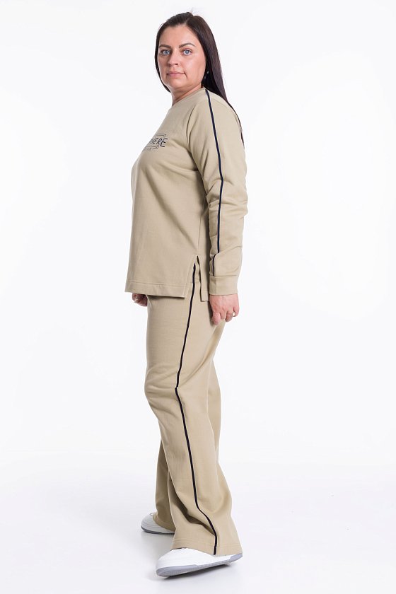 Тёплый и стильный женский костюм из футера с начёсом — отличный выбор для повседневной носки. Кант контрастного цвета, проходящий по рукавам и боковому шву брюк, придаёт изделию оригинальность. Толстовка с принтом спереди и разрезами по бокам обеспечивает свободу движений. Костюм идеально подойдёт для прохладных дней.
