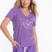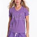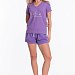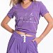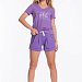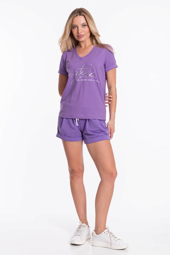 Женский костюм - футболка и шорты, выполнен из комбинации двух видов полотна. Футболка из мягкой и эластичной кулирки с лайкрой обеспечивает свободу движений, а V-образный вырез горловины с планкой придаёт изделию аккуратный вид. Рукава футболки и штанины шорт с отворотами, спереди нанесён интересный принт.