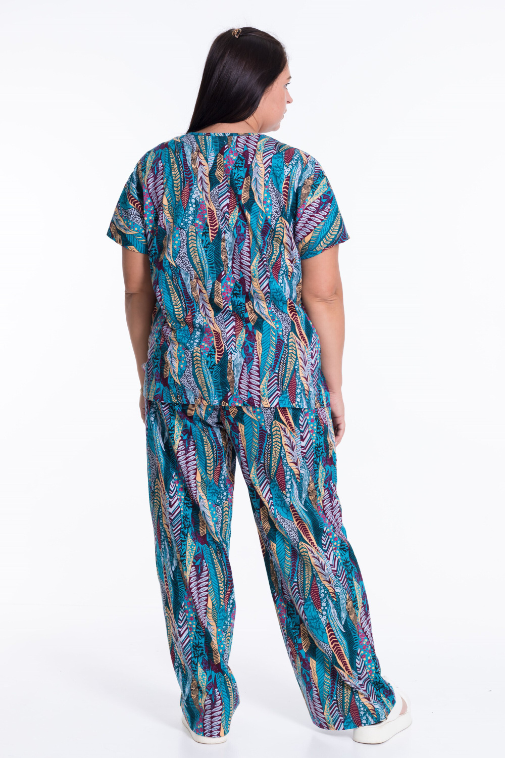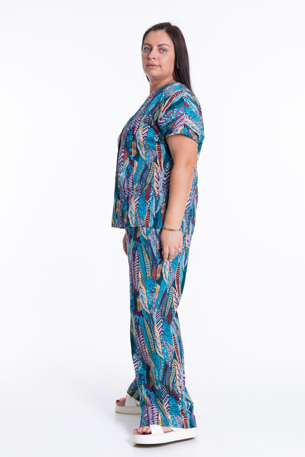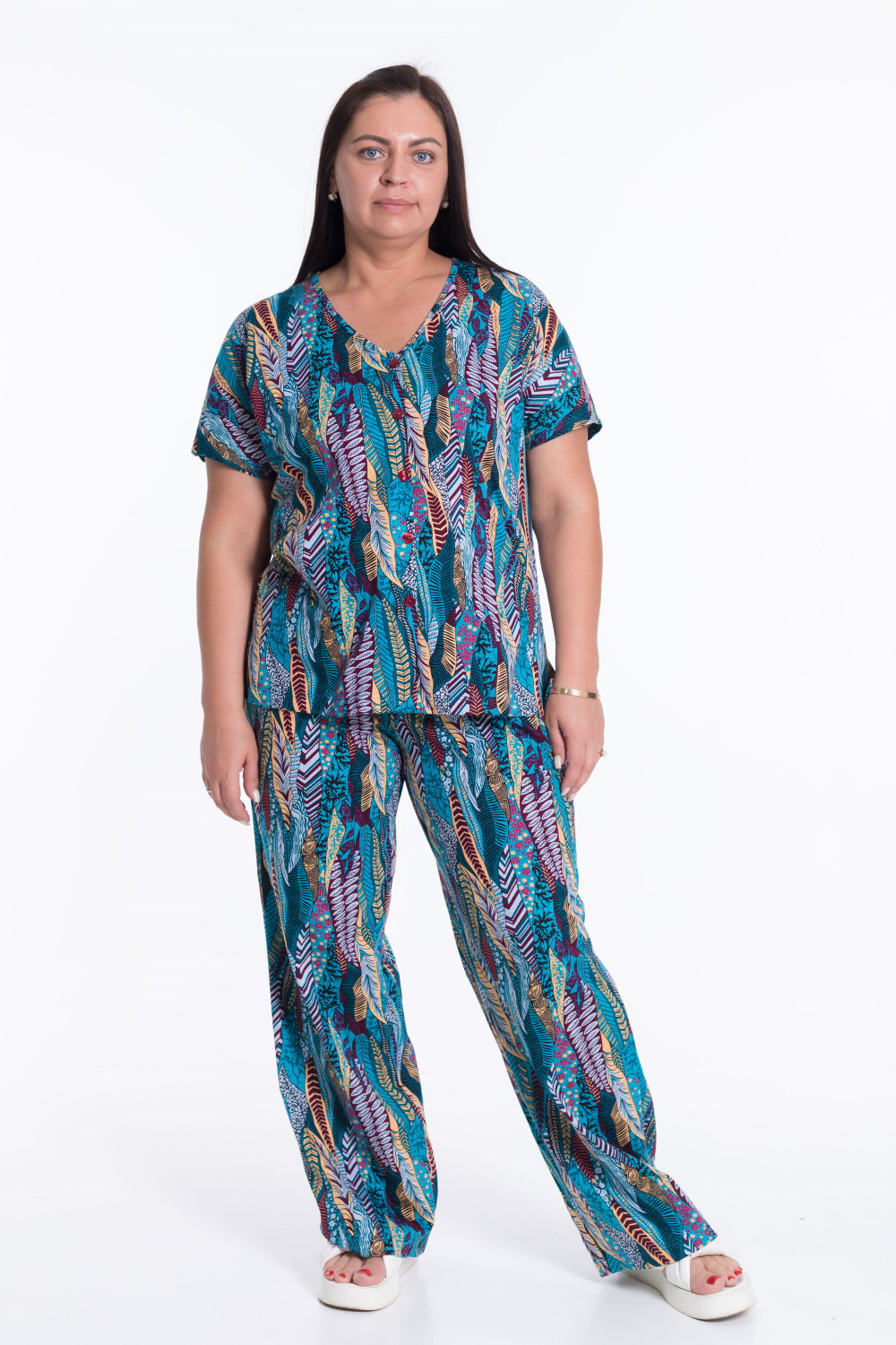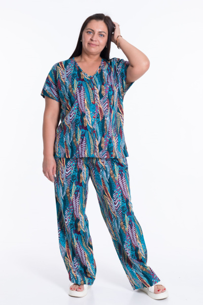 Костюм женский из кулирки. Брюки прямые свободные с боковыми карманами и притачным поясом на резинке. Блузон со спущенным рукавом, V-образным вырезом горловины и имитацией застежки.