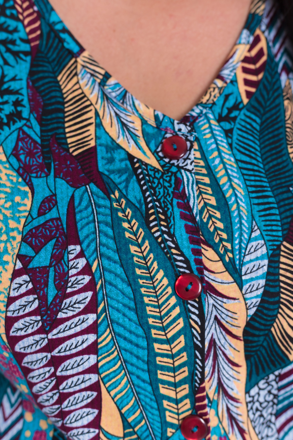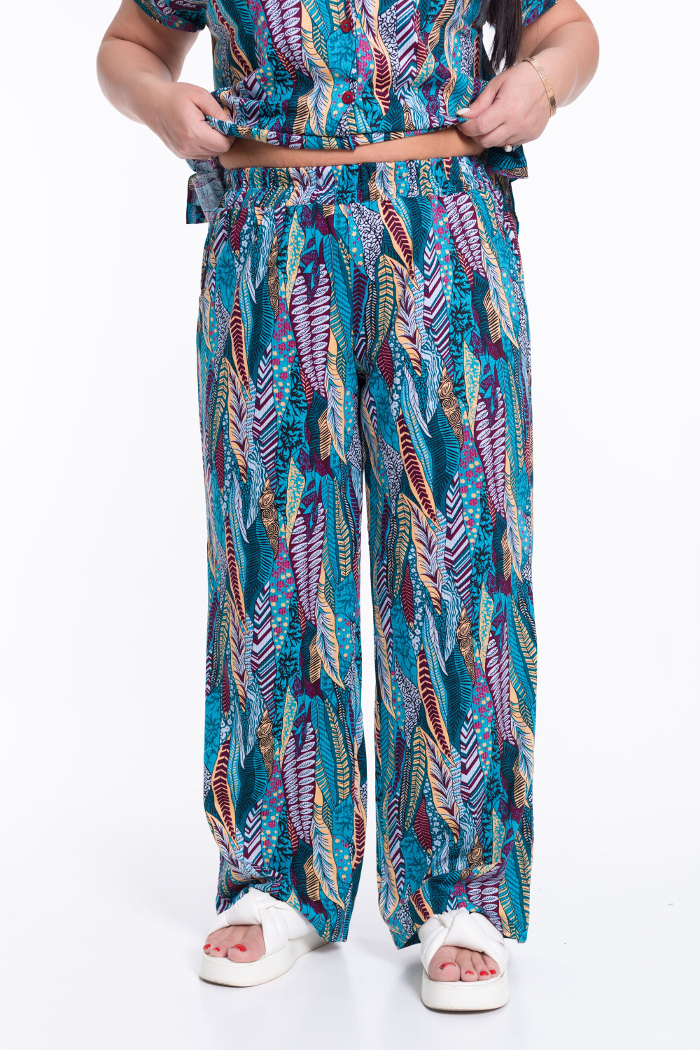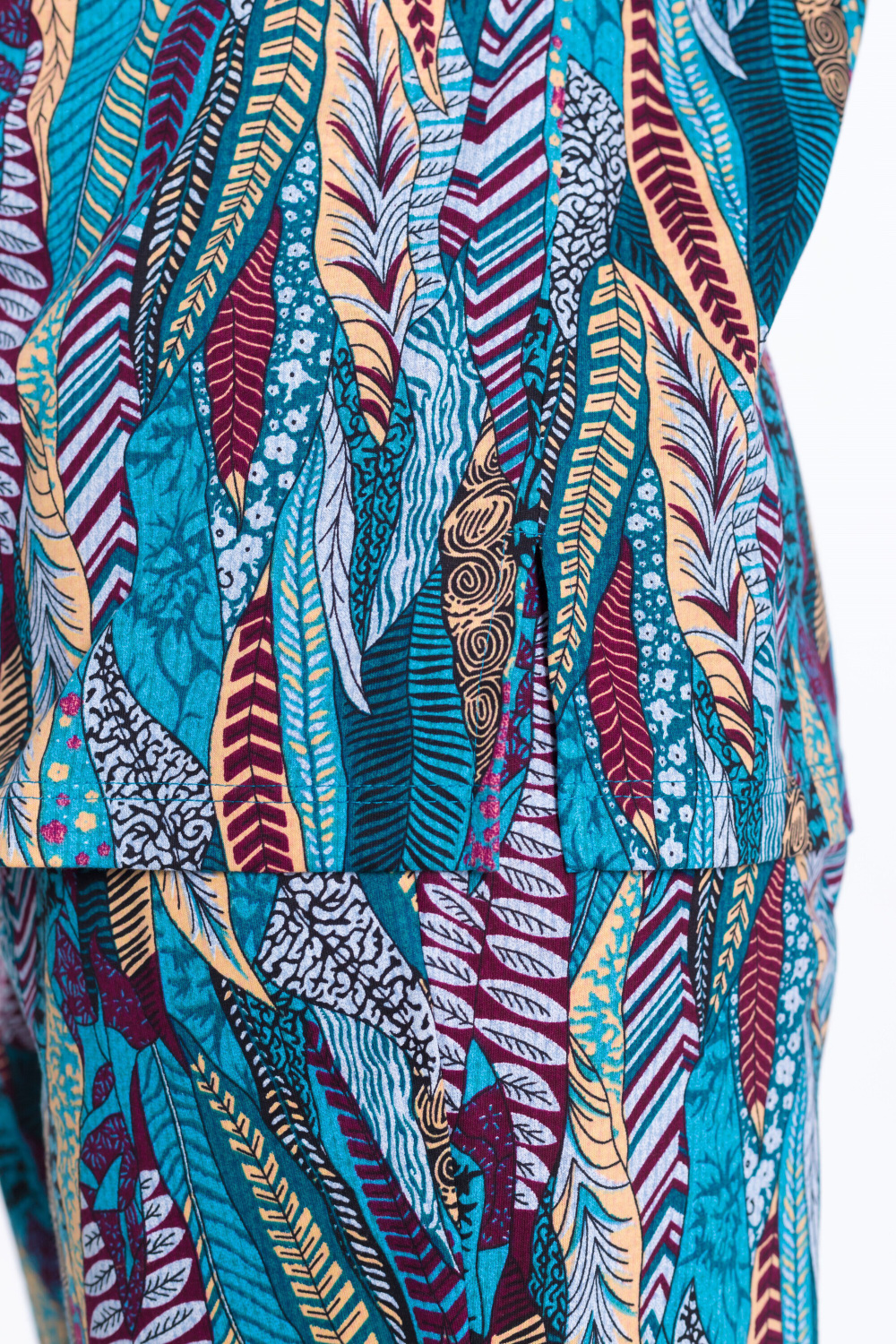 Костюм женский из кулирки. Брюки прямые свободные с боковыми карманами и притачным поясом на резинке. Блузон со спущенным рукавом, V-образным вырезом горловины и имитацией застежки.