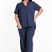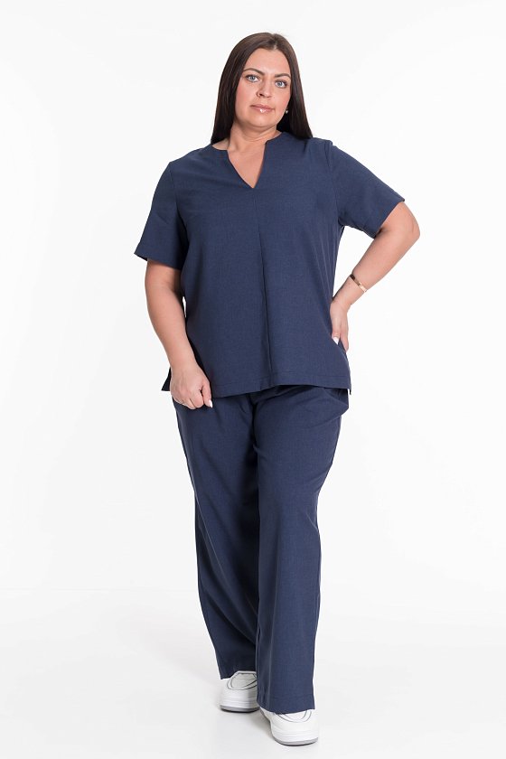 Женский костюм — отличный выбор для повседневной носки. Он выполнен из практичного и лёгкого однотонного полотна синего цвета, имитирующего лён.