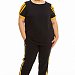 Костюм выполнен из футер петли с лайкрой, состоит из брюк и футболки с коротким рукавом. Брюки с боковыми карманами, поясом на резинке и шнуре, сбоку вставка с широкими лампасами. Внизу кармана расположен декоративный элемент. У футболки отделка на рукавах, горловина имеет круглый вырез.
