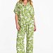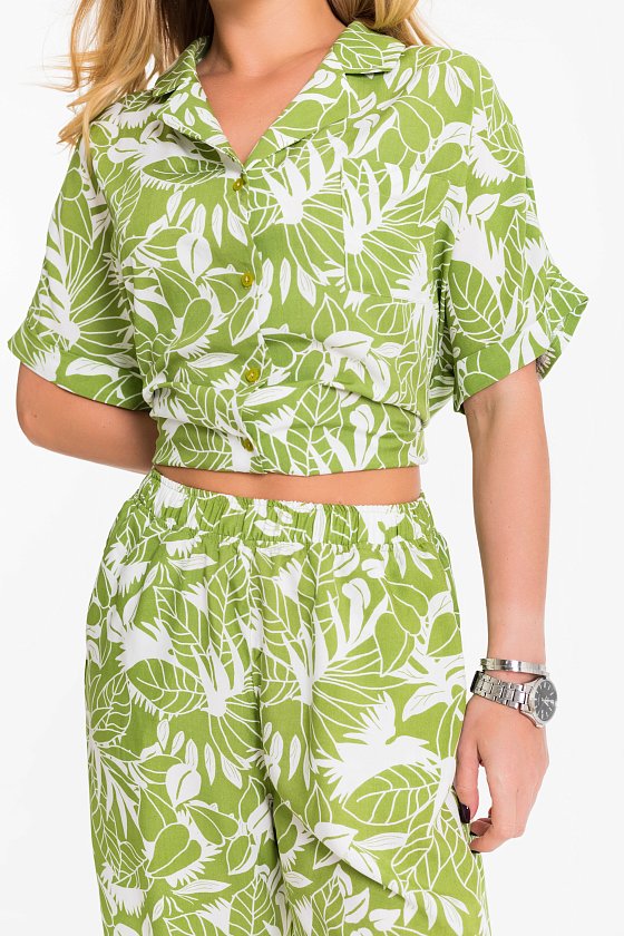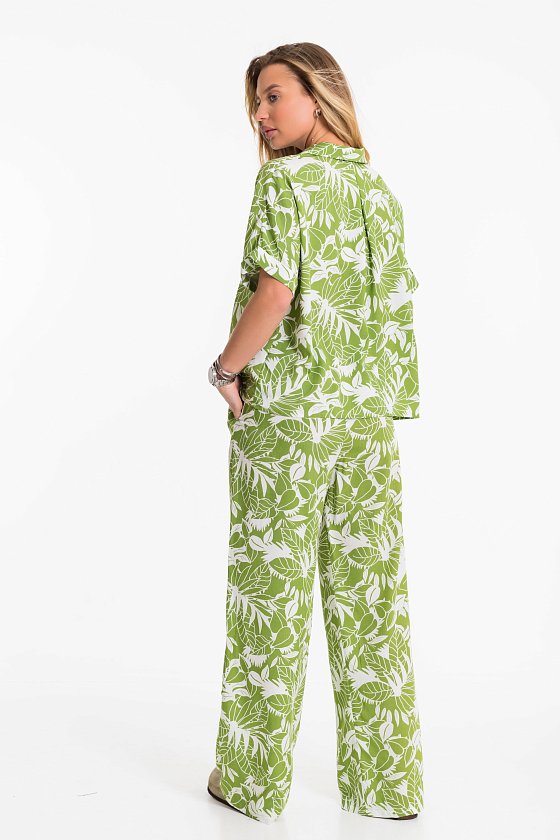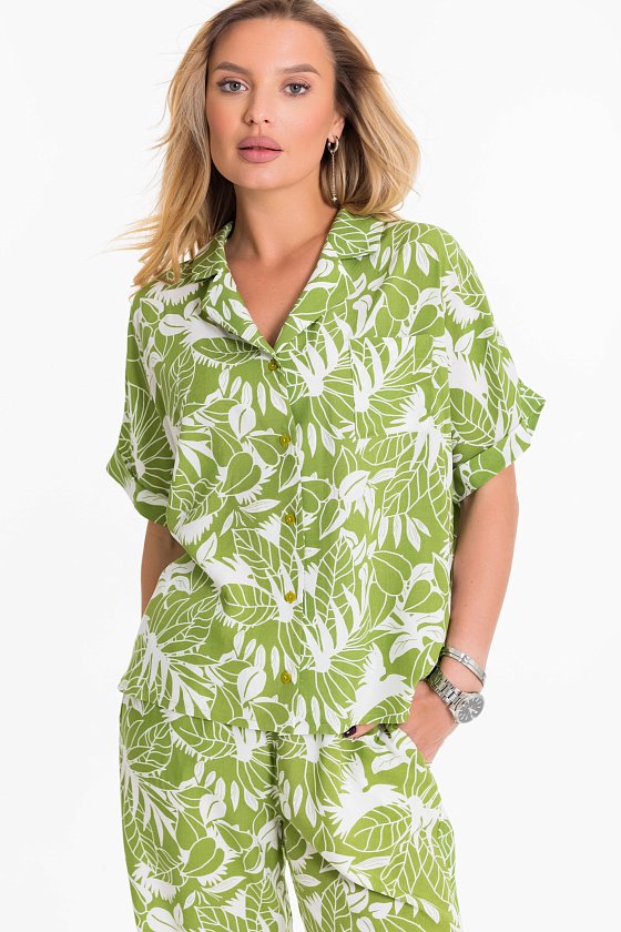 Костюм выполнен из лёгкого и приятного к телу штапельного полотна с набивным рисунком. В комплект входят рубашка и брюки. Рубашка свободного фасона (оверсайз), с цельнокроеными рукавами длиной чуть выше локтя и аккуратными отложными манжетами. На спинке — застроченная бантовая складка, обеспечивающая дополнительную свободу движений. Застёжка на пуговицы, отложной воротник и накладной карман на груди завершают образ. Брюки прямого свободного кроя с комфортным притачным поясом и регулирующим шнуром. По бокам — удобные карманы. Этот комплект — универсальный выбор для прогулок, работы и отдыха. Лёгкость ткани и продуманный крой обеспечат максимальный комфорт в течение всего дня.