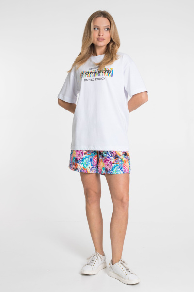 Футболка из однотонной кулирки свободного силуэта придаёт изделию комфорт и удобство. На передней части расположен принт, который гармонично сочетается с цветом шорт и добавляет яркости модели.