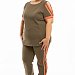 Костюм выполнен из футер петли с лайкрой, состоит из брюк и футболки с коротким рукавом. Брюки с боковыми карманами, поясом на резинке и шнуре, сбоку вставка с широкими лампасами. Внизу кармана расположен декоративный элемент. У футболки отделка на рукавах, горловина имеет круглый вырез.