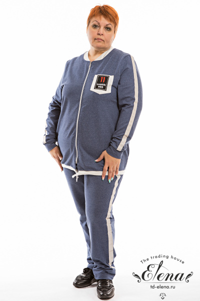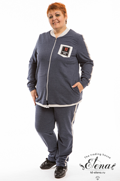 Костюм выполнен из футер петли с лайкрой, состоит из брюк и толстовки на молнии. Толстовка с отделкой по рукавам, карманами и планкой со шнуром по низу. Брюки с притачным поясом и лампасами по боковому шву.